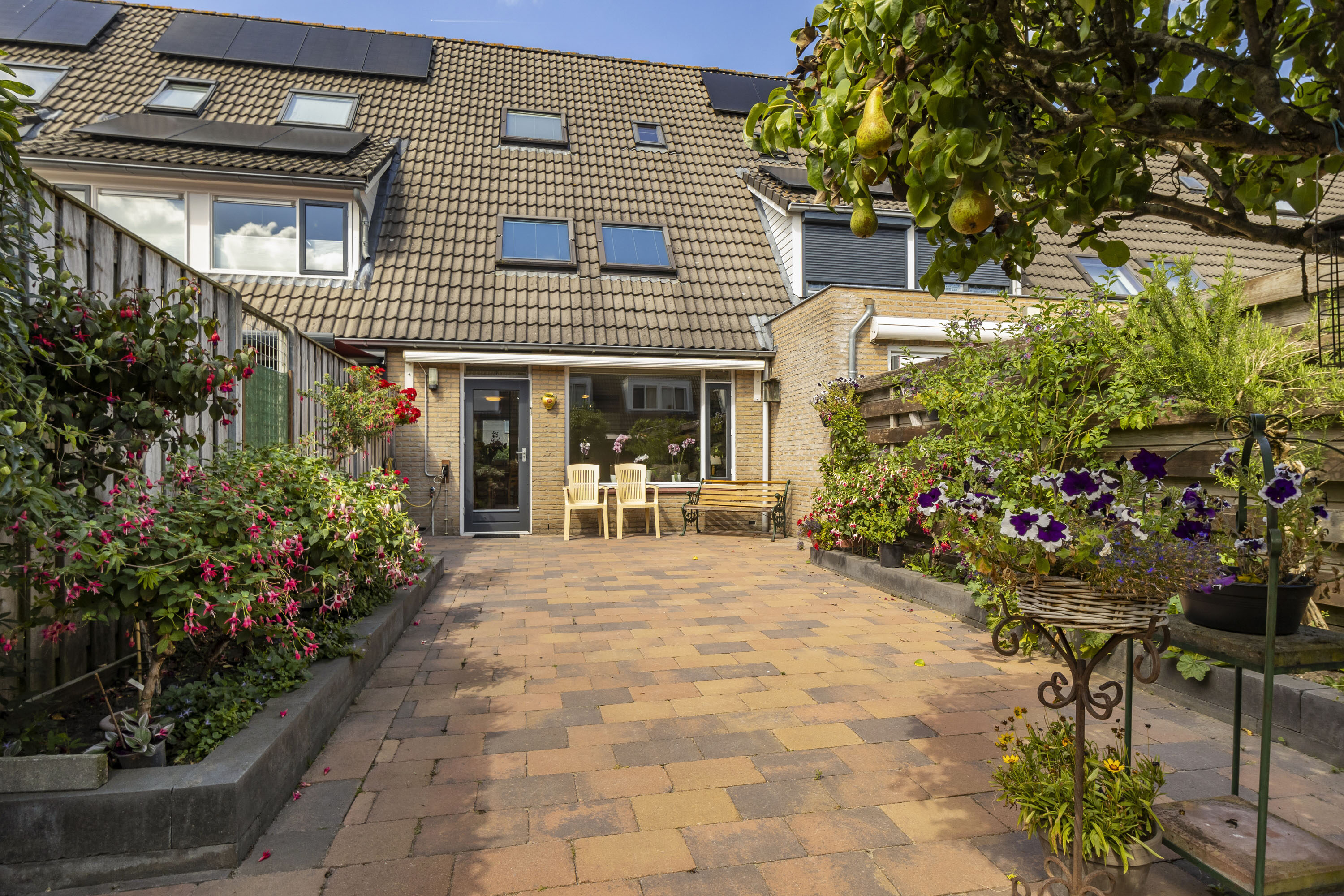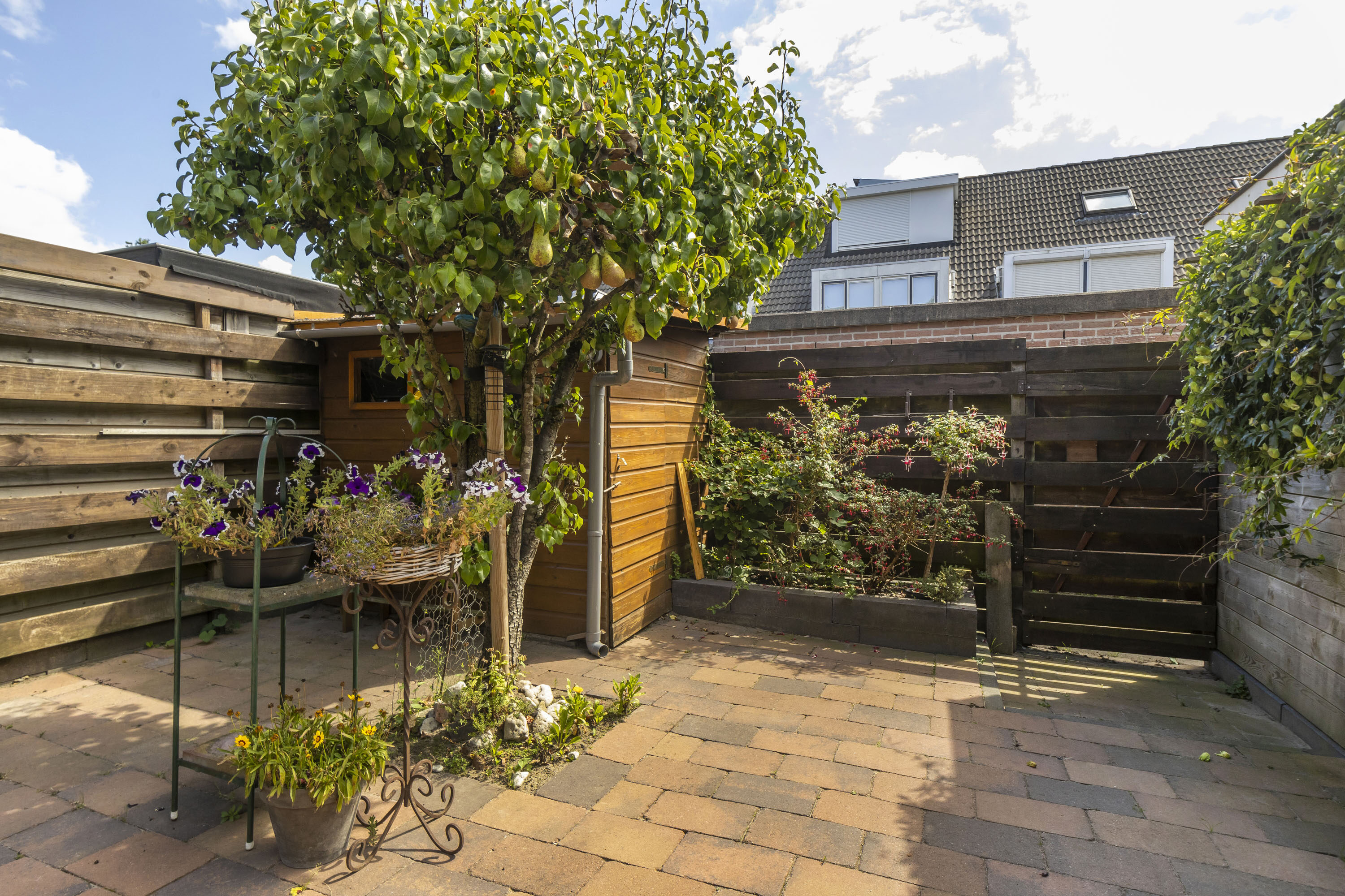 De zonnige achtertuin, gelegen op het zuidoosten, is de ideale plek om de hele dag van de zon te genieten. Er is voldoende ruimte om meerdere gezellige zithoeken te creëren. Voor de nodige schaduw op warme dagen biedt het aanwezige zonnescherm uitkomst. Achter in de tuin staat een houten berging van circa 3 m² groot. De tuin is bovendien eenvoudig toegankelijk via een achterom. Aan de voorkant van de woning bevindt zich nog een extra stenen berging van circa 7 m².
