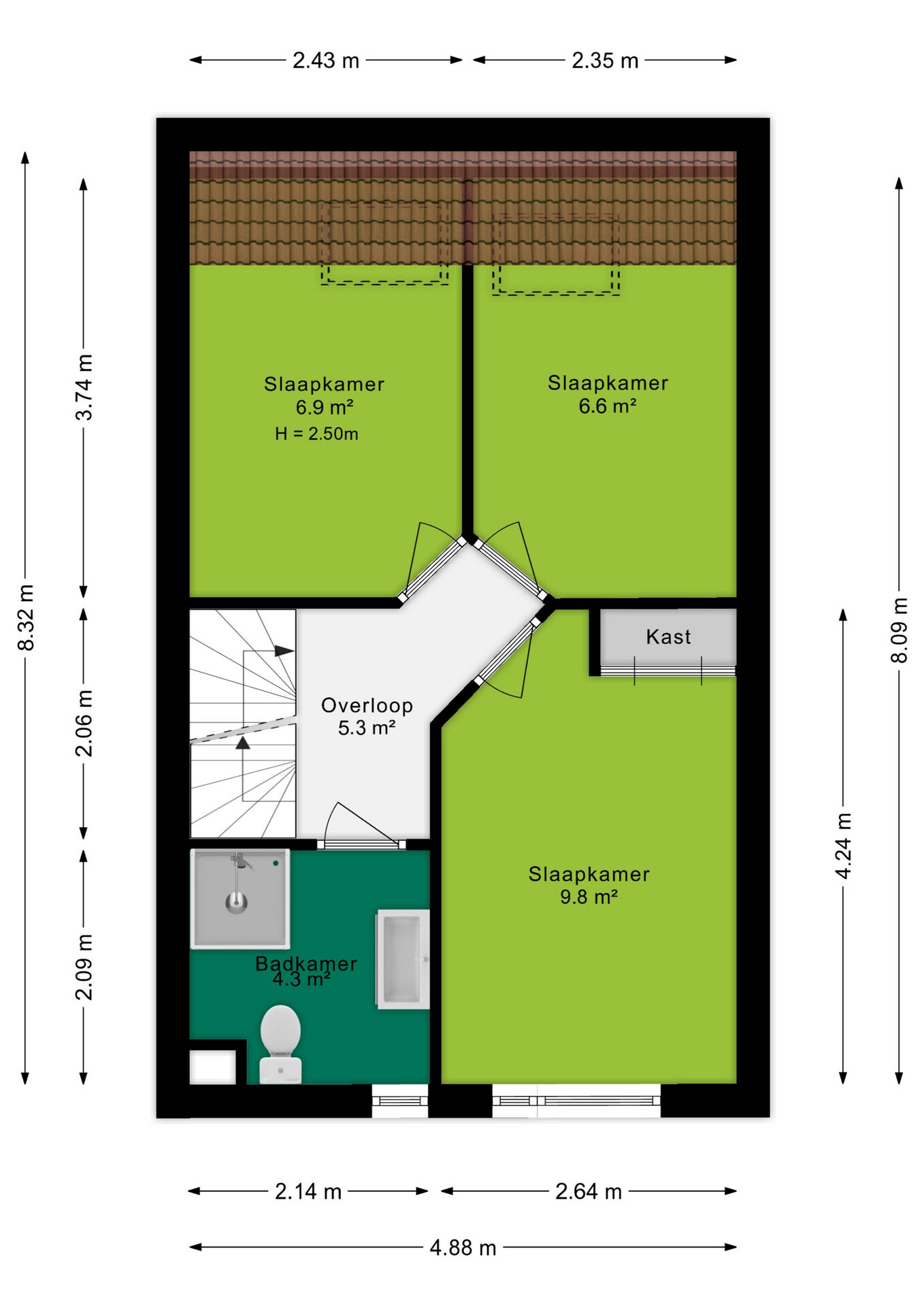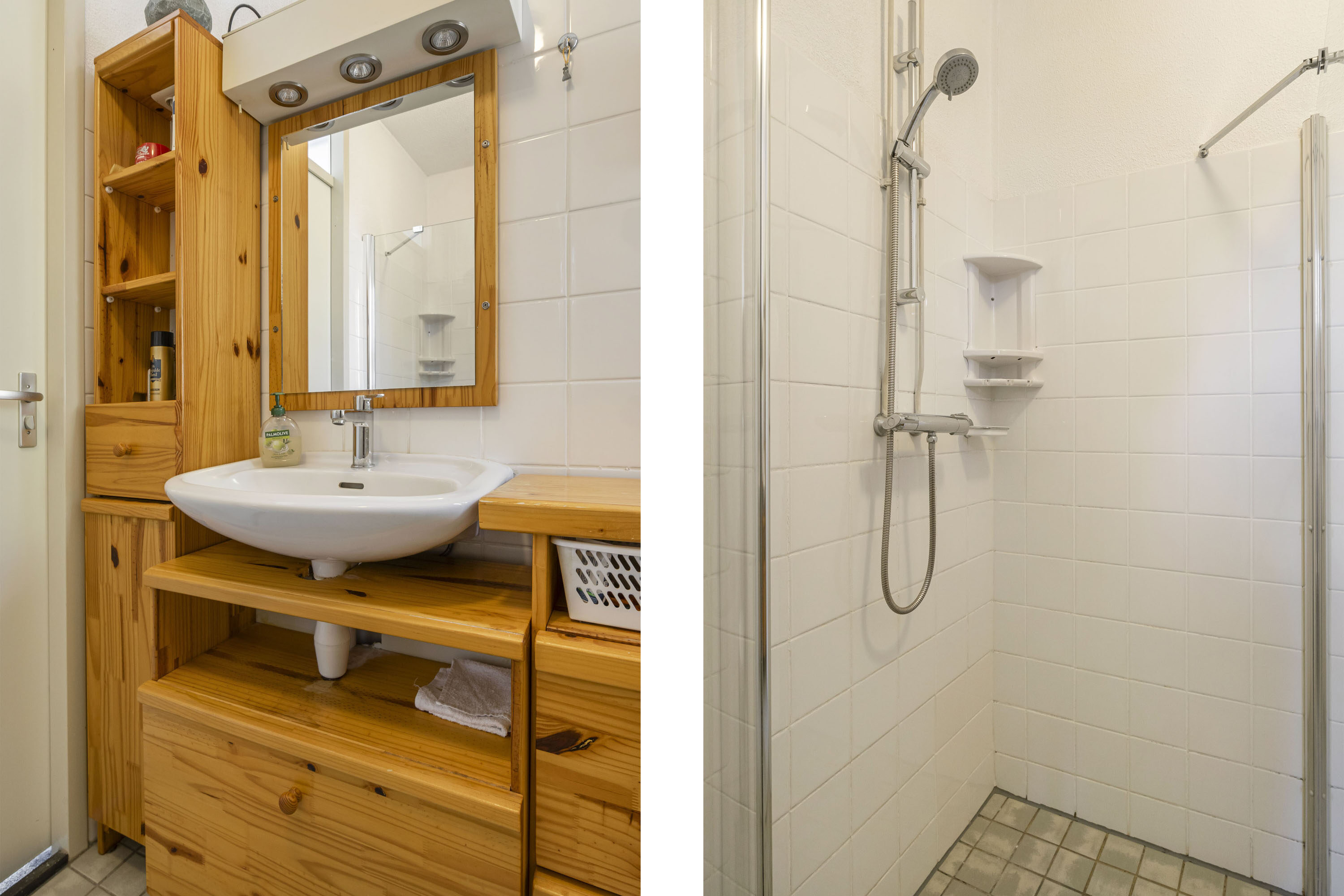 De eerste verdieping biedt drie fijne slaapkamers. Aan de voorzijde bevindt zich een slaapkamer van circa 10 m², voorzien van een praktische inbouwkast. Aan de achterzijde vind je twee slaapkamers van circa 7 m², beide met een dakraam. De badkamer is voorzien van een wastafel, inloopdouche, toilet en designradiator.
