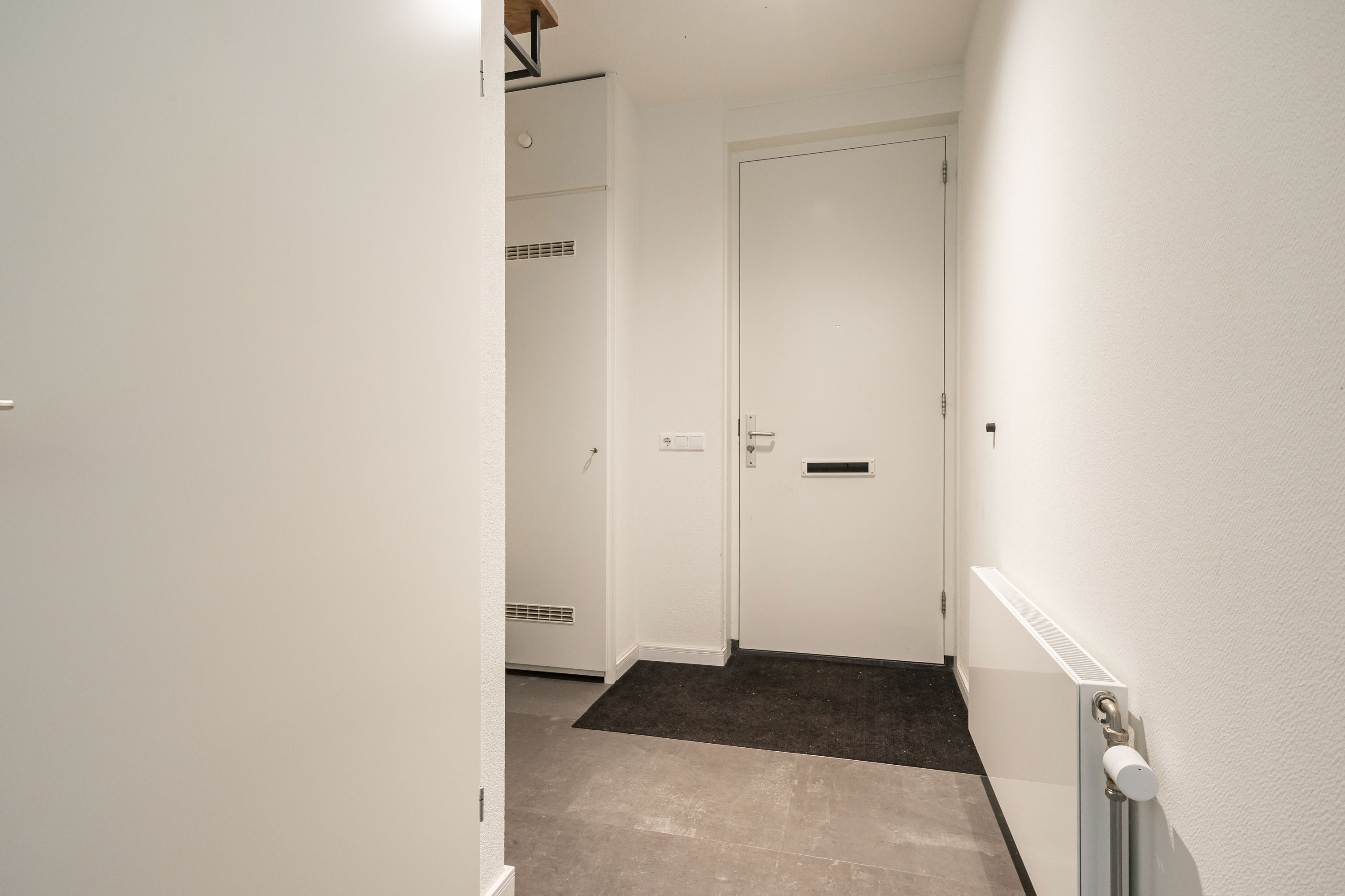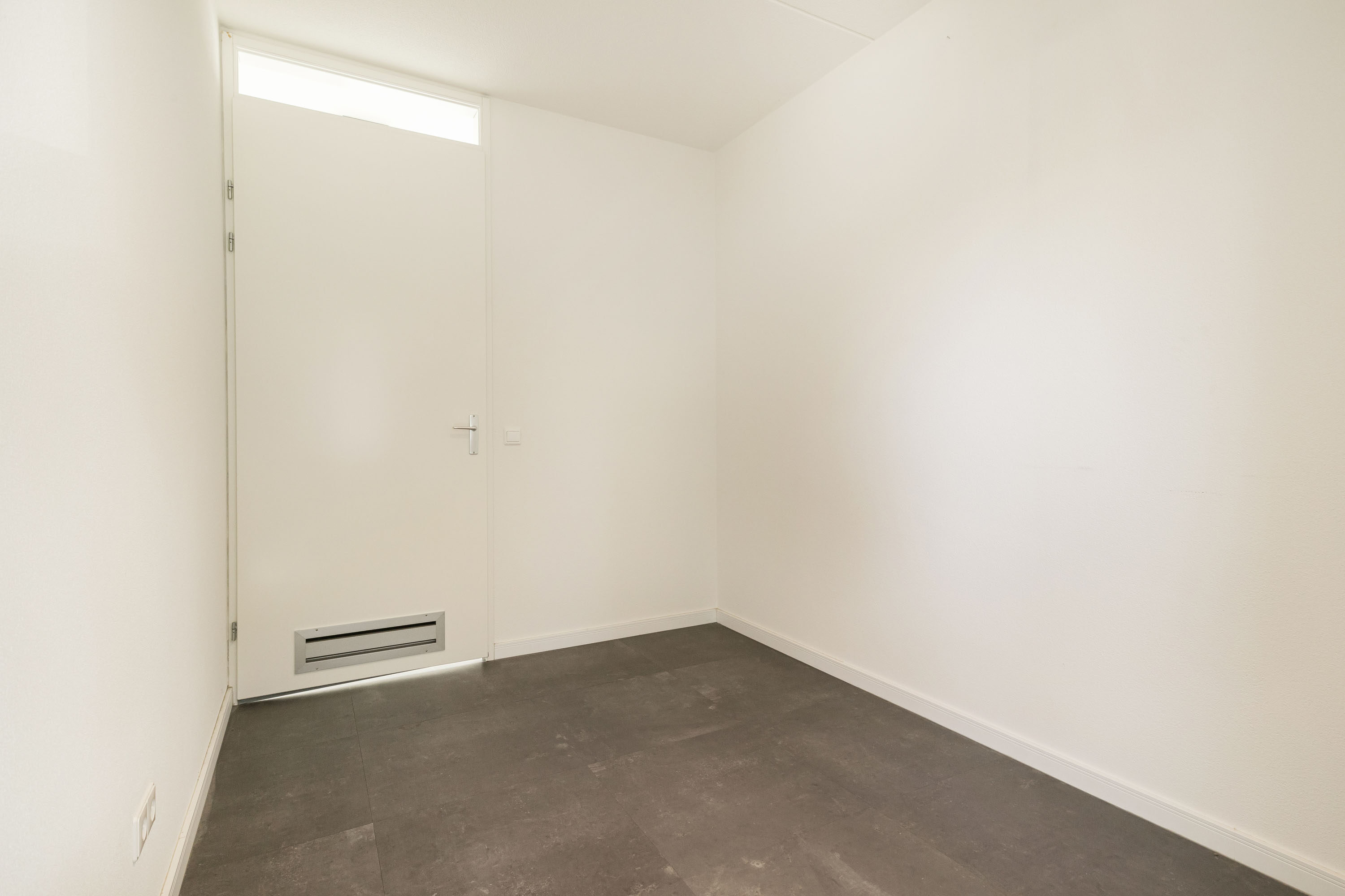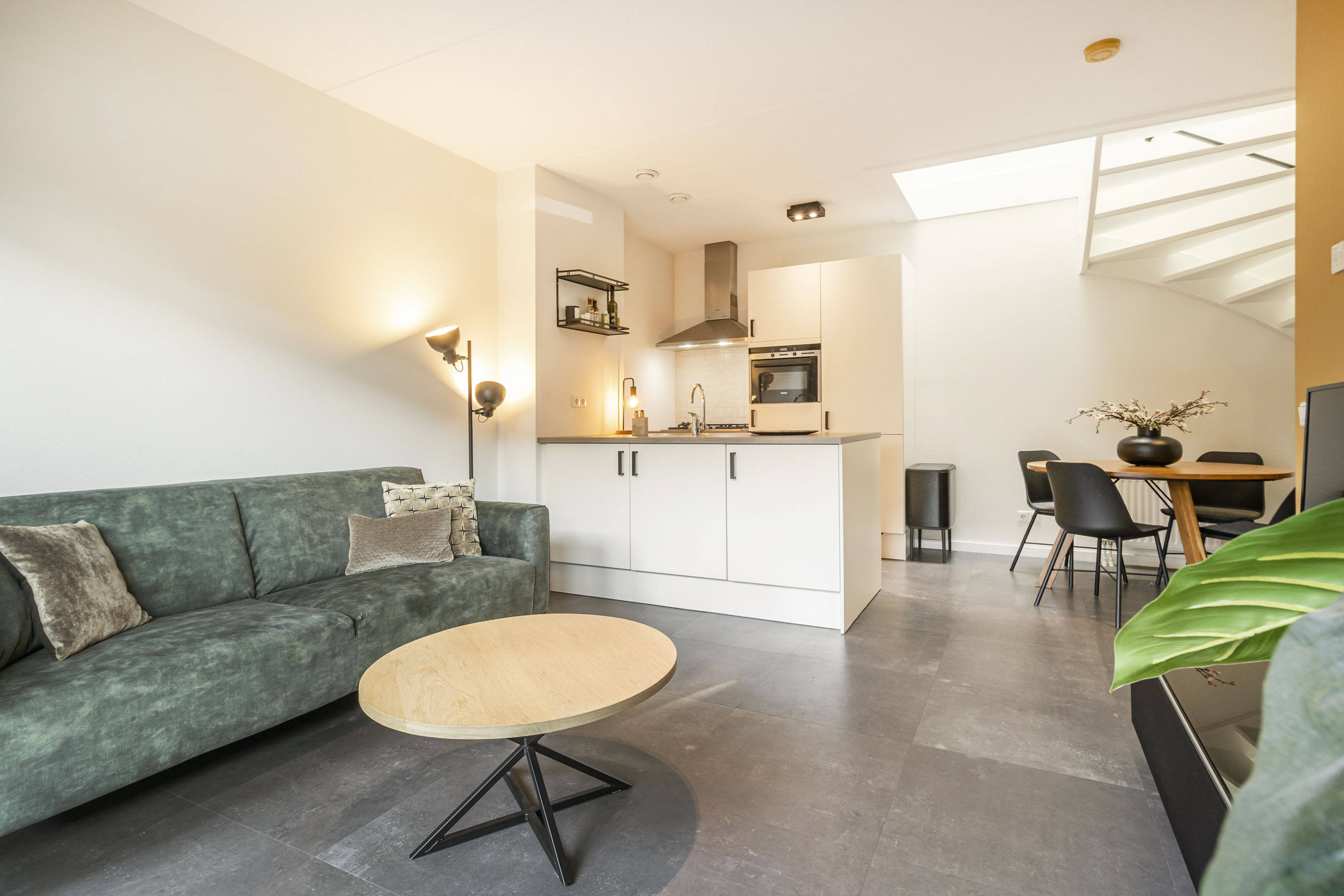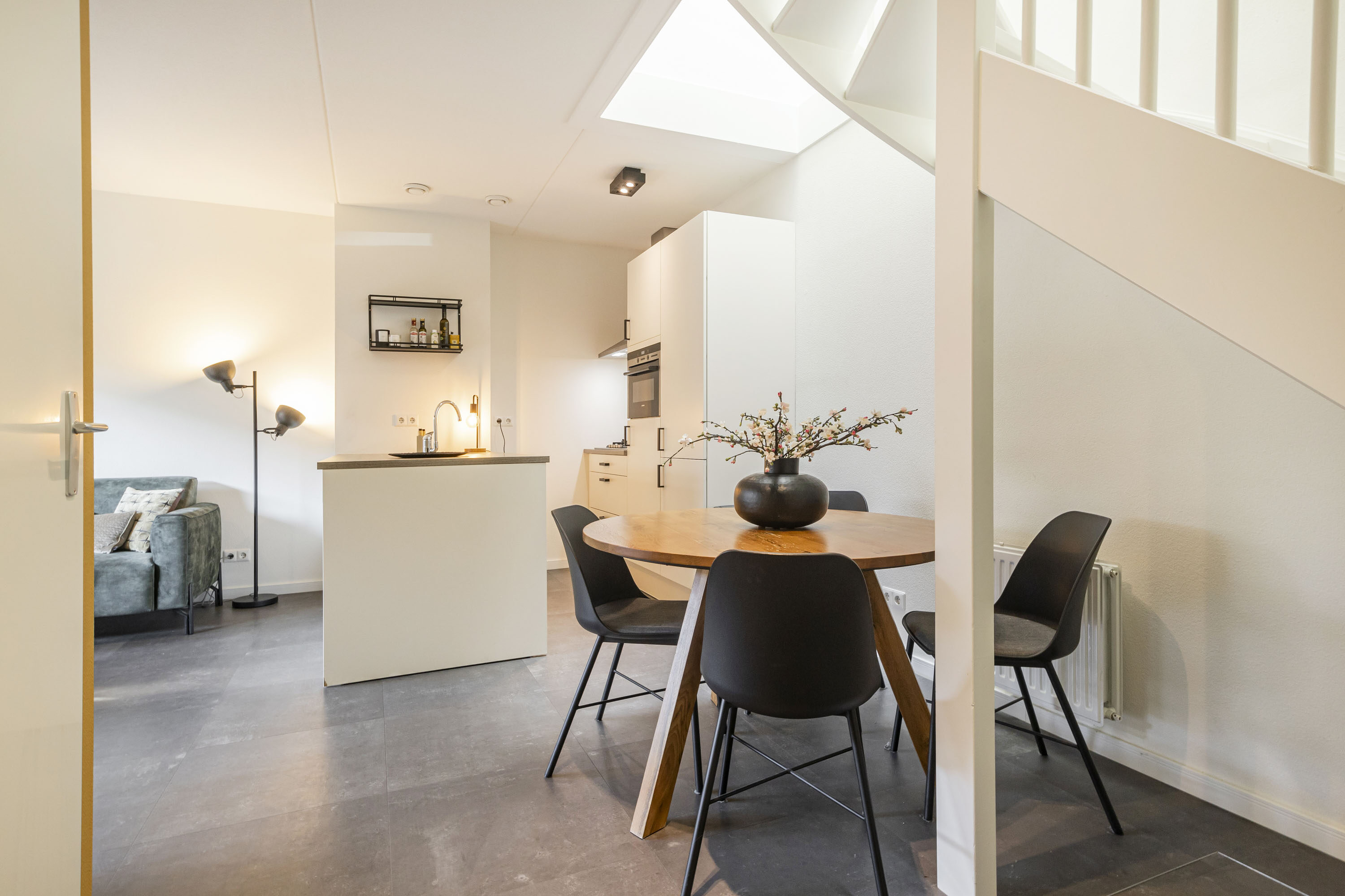 Je komt binnen via de voordeur in de hal met meterkast, toilet en toegang tot de open keuken met aangrenzend de woonkamer. De lichte woonkamer heeft een gezellige zithoek aan de voorzijde en openslaande deuren naar de voortuin. De ruimte is strak afgewerkt met een moderne PVC-vloer en neutrale wanden.