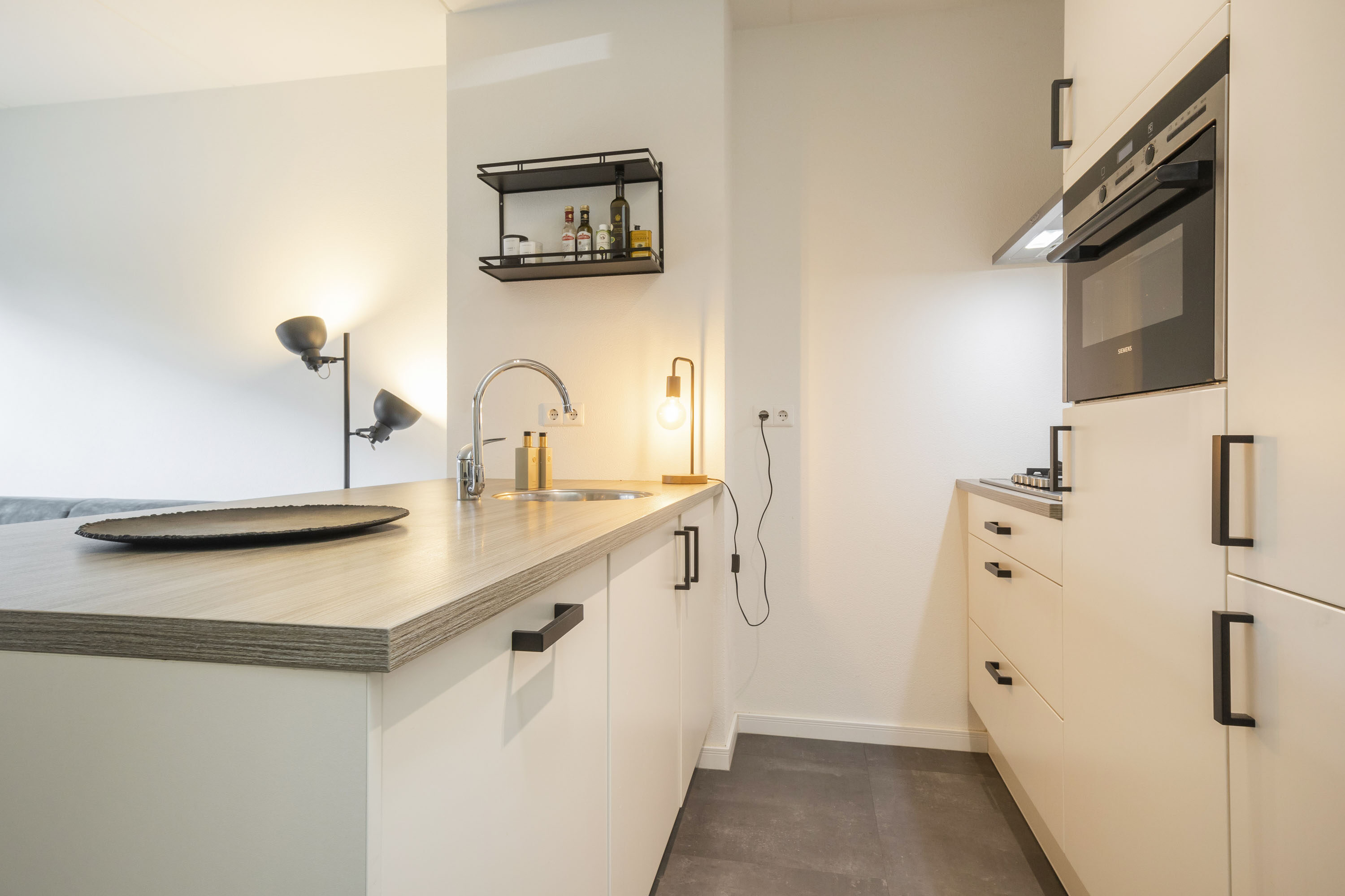 Aan de achterzijde van de woning bevindt zich de open keuken met een stijlvol kookeiland. Voorzien van inbouwapparatuur zoals een inductiekookplaat, afzuigkap, combimagnetron, koelkast, vriezer en vaatwasser. Een fijne plek om uitgebreid te koken, borrelen of samen te eten.