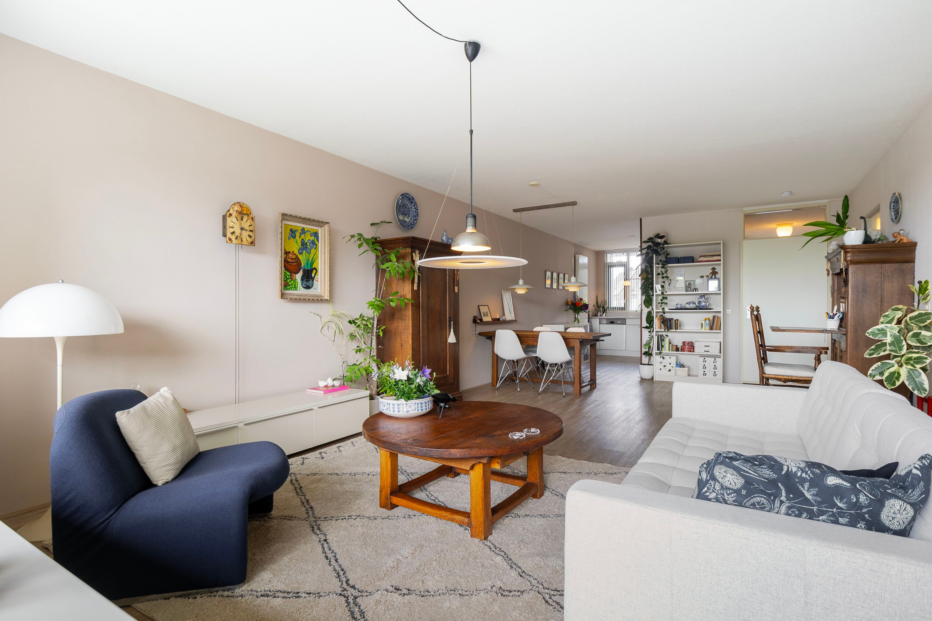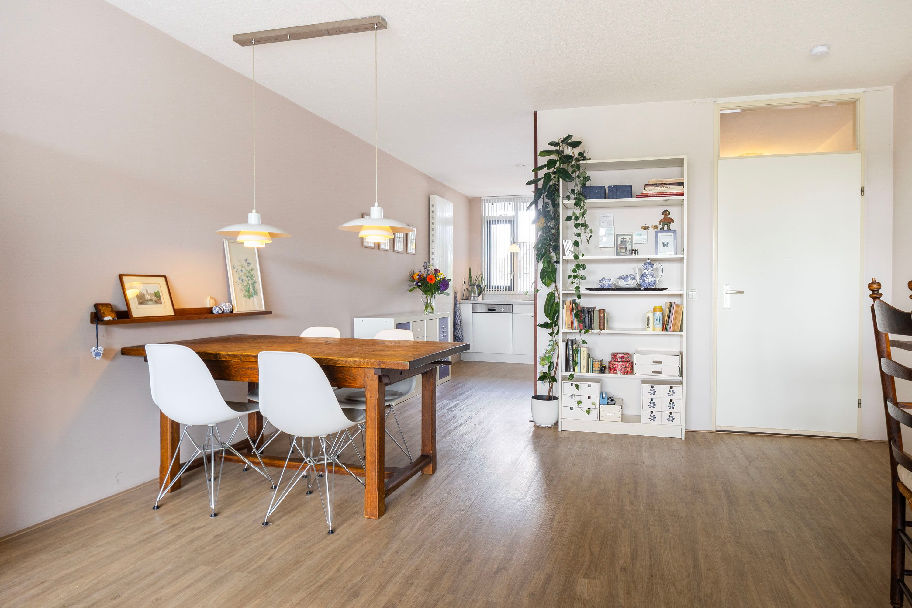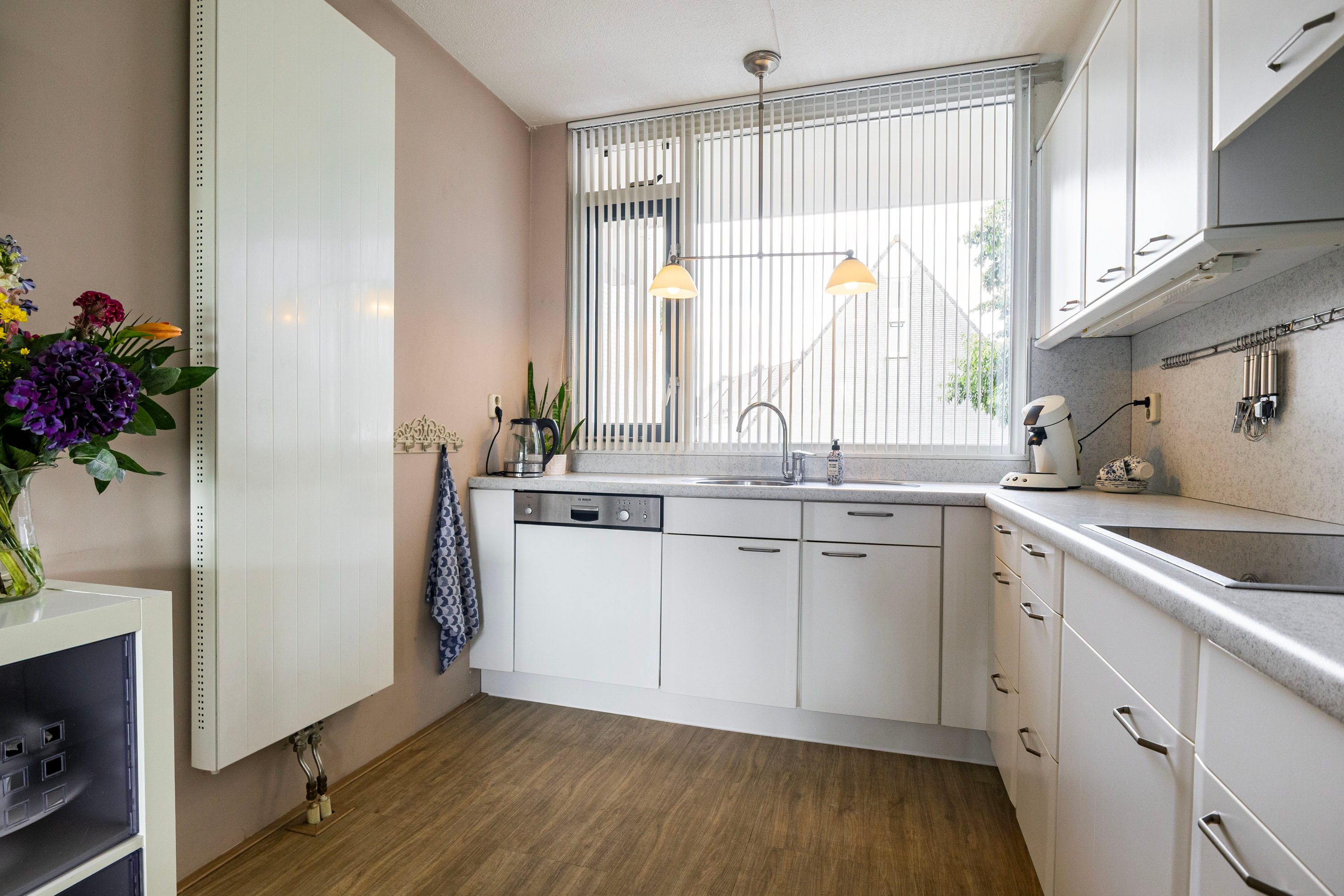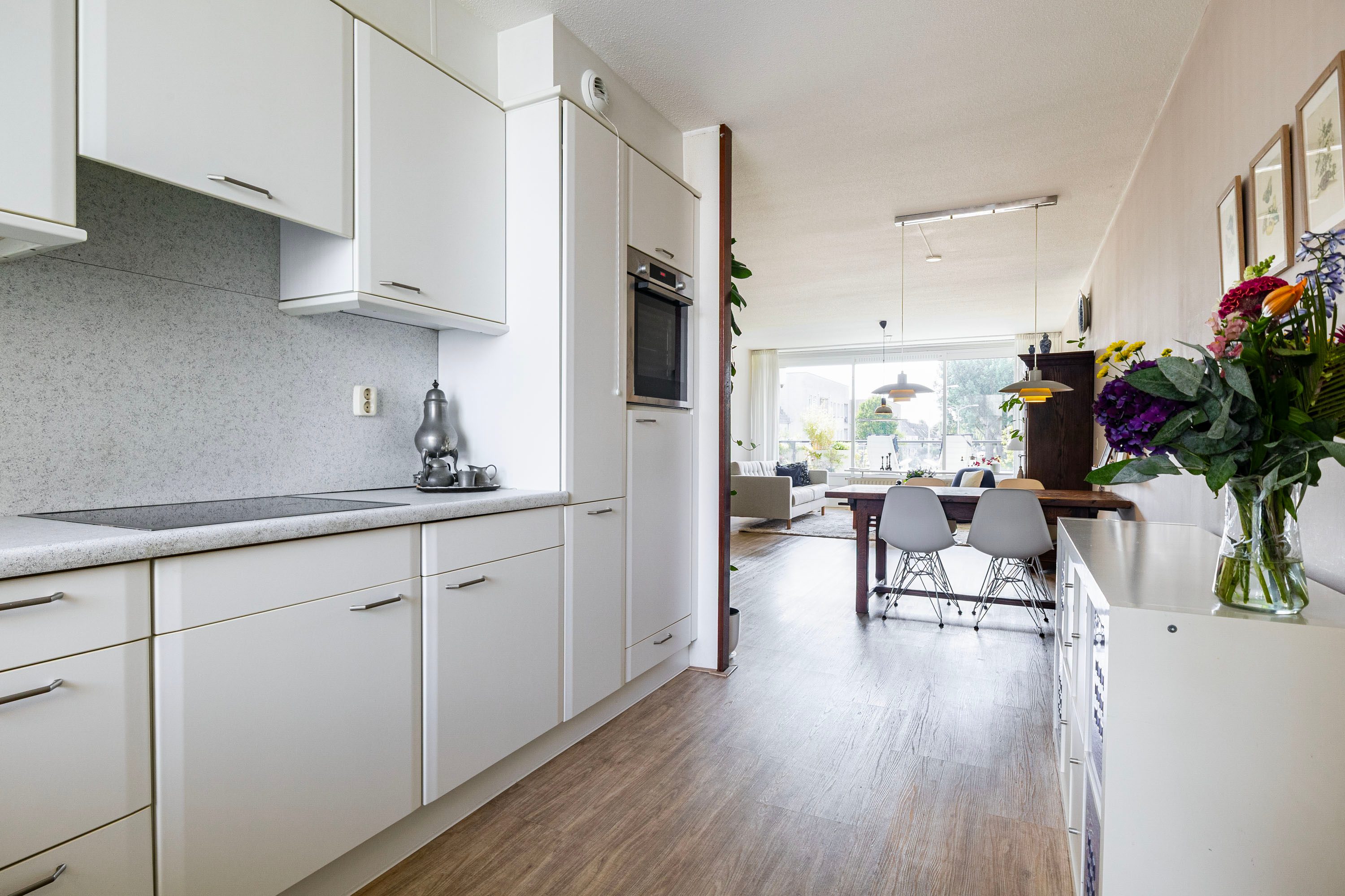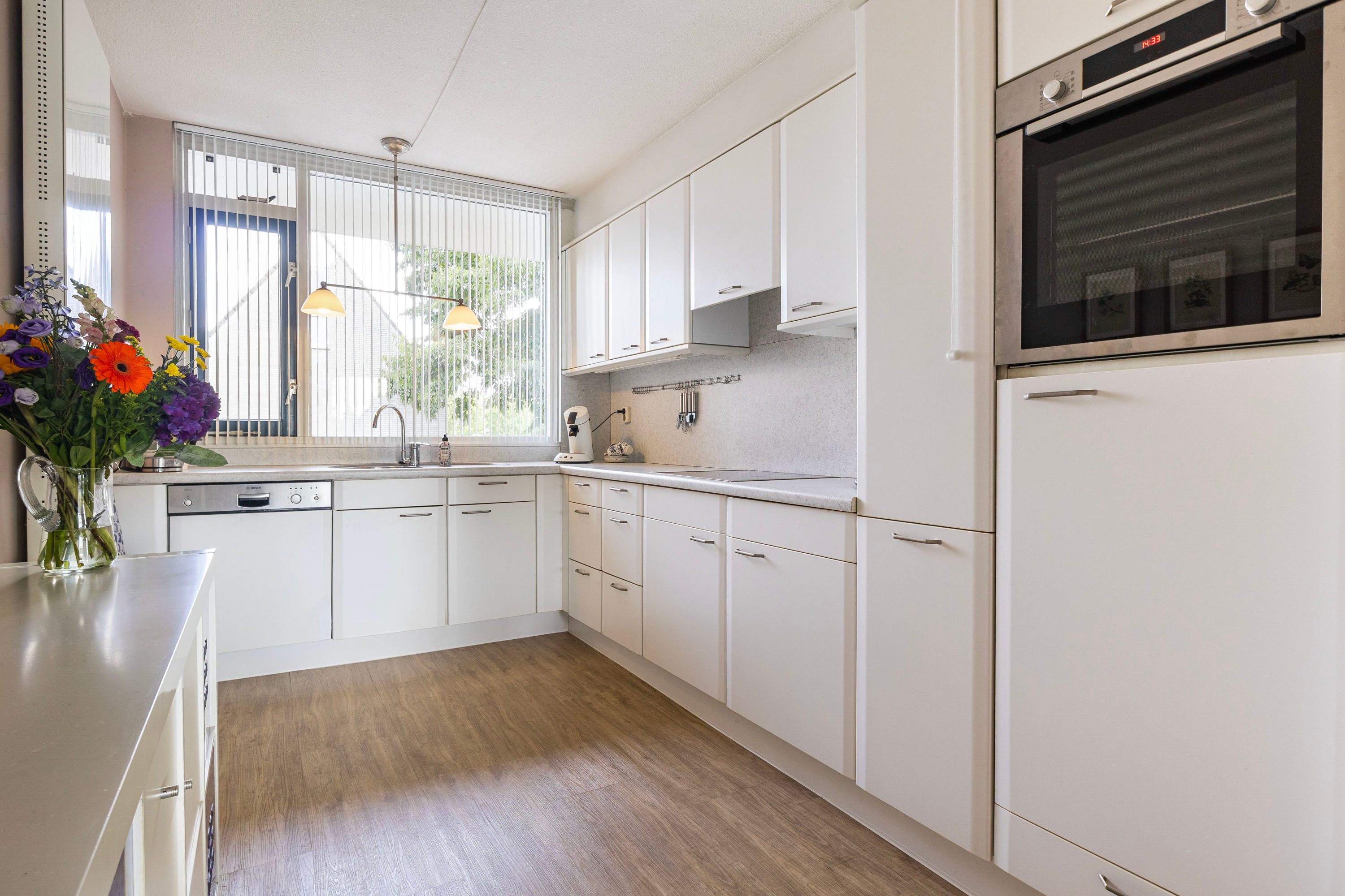 Vanuit de hal heb je toegang tot de lichte en ruime woonkamer van 34 m². Grote raampartijen zorgen voor veel lichtinval en een vrij uitzicht. De woonkamer loopt naadloos over in de open keuken, die is ingericht in een praktische hoekopstelling en voorzien is van diverse inbouwapparatuur, waaronder een inductiekookplaat, oven, koelkast en vaatwasser.