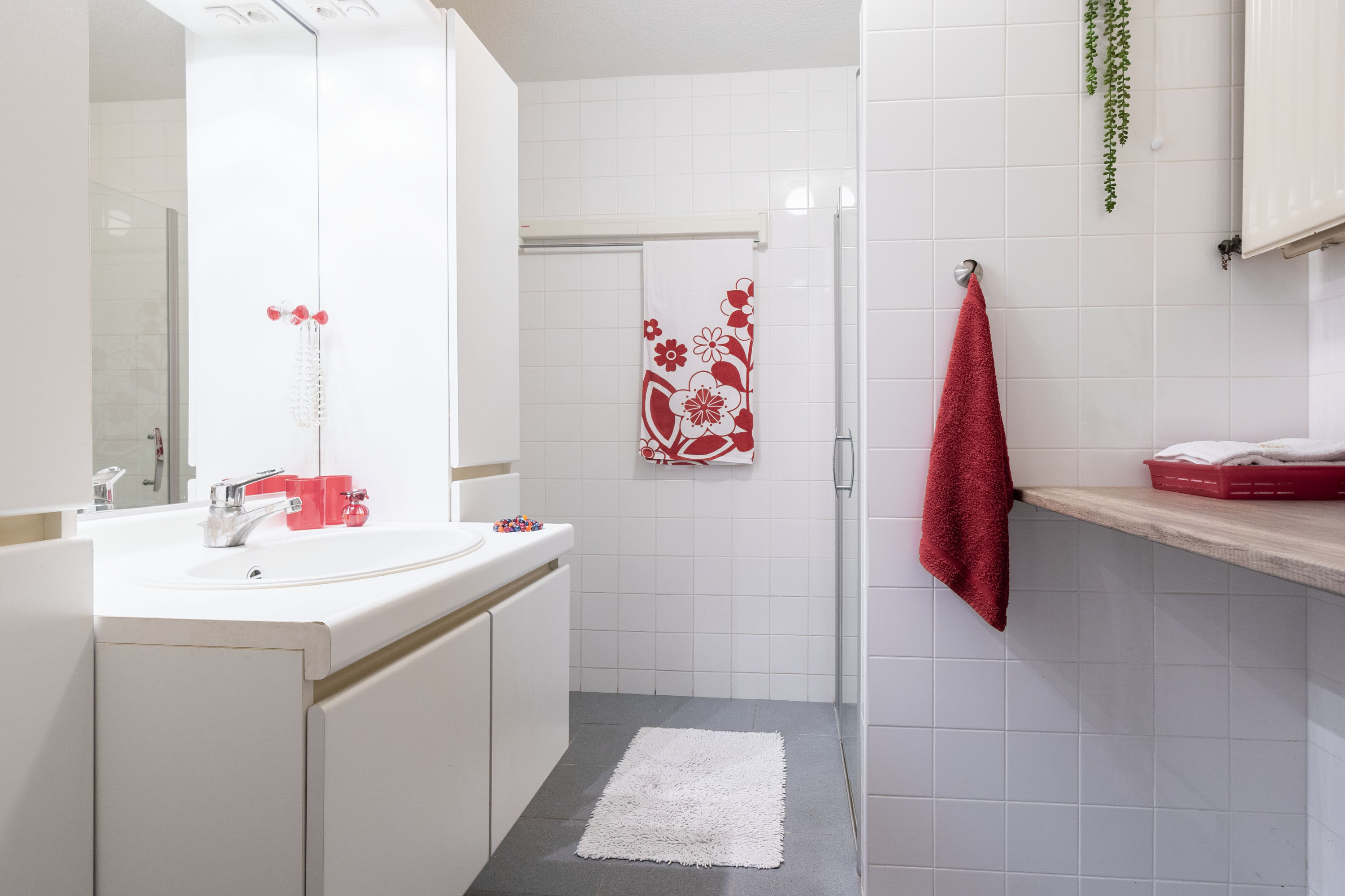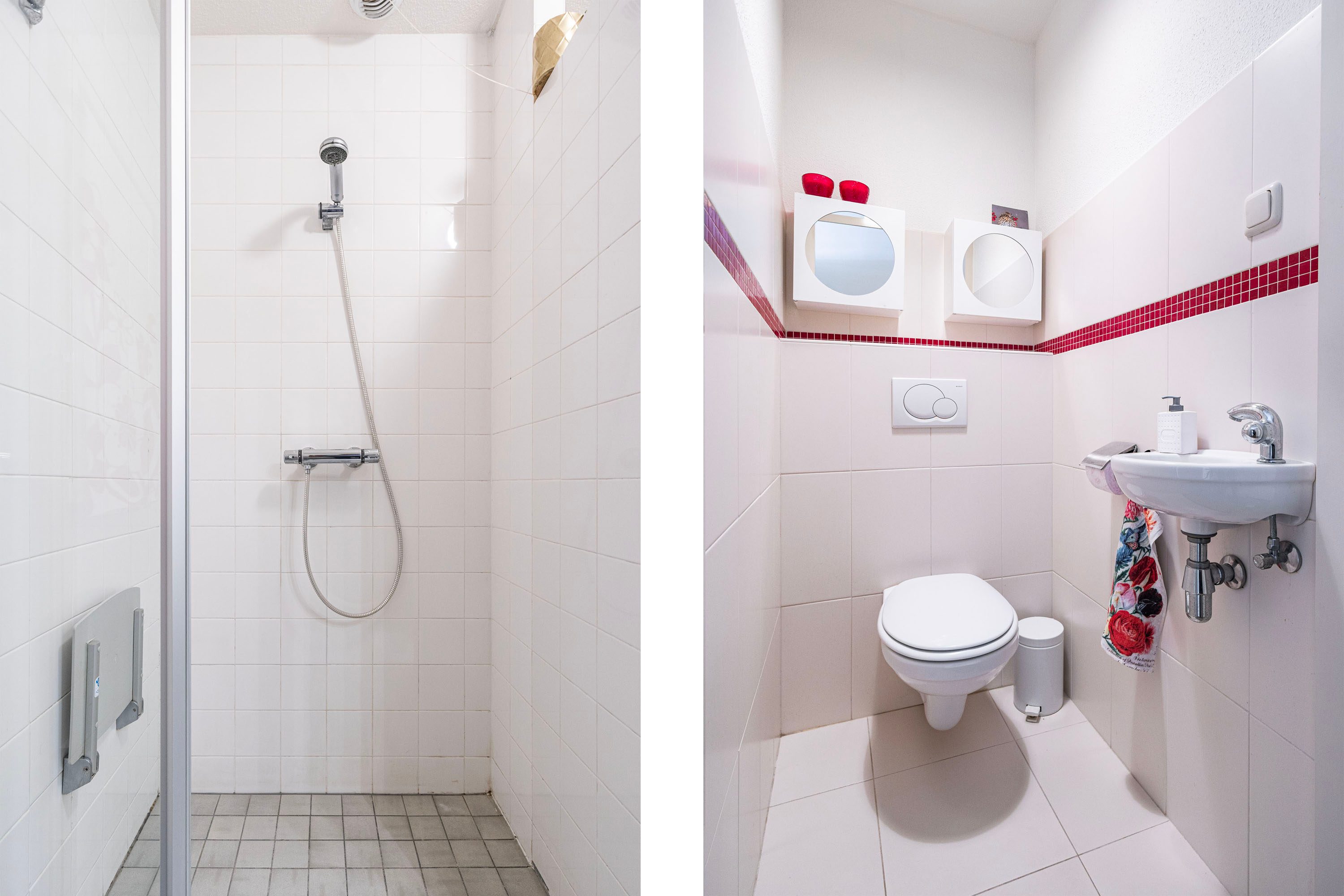 De badkamer beschikt over een wastafelmeubel en een inloopdouche, terwijl het separate toilet extra gemak biedt in het dagelijks gebruik.