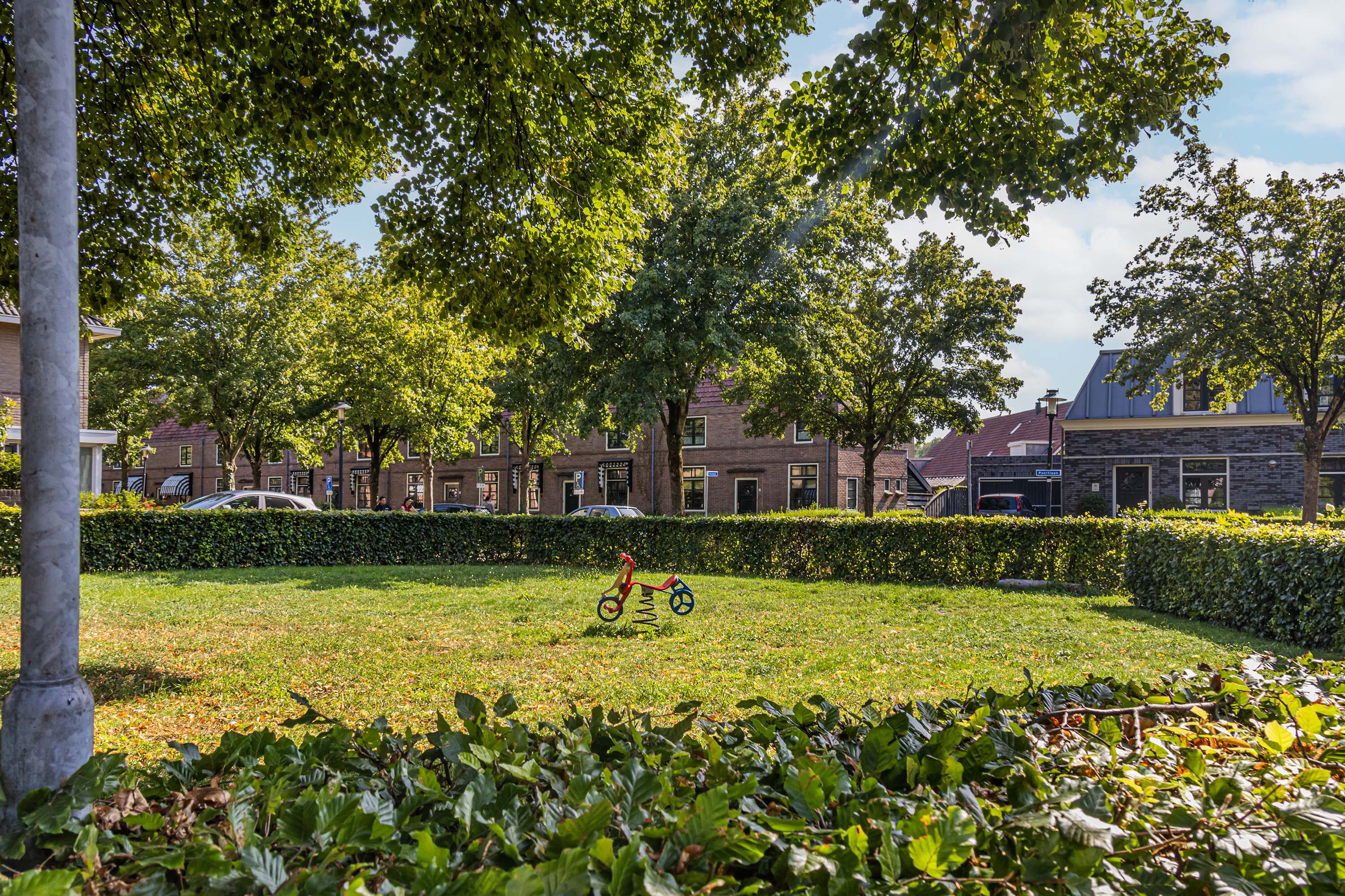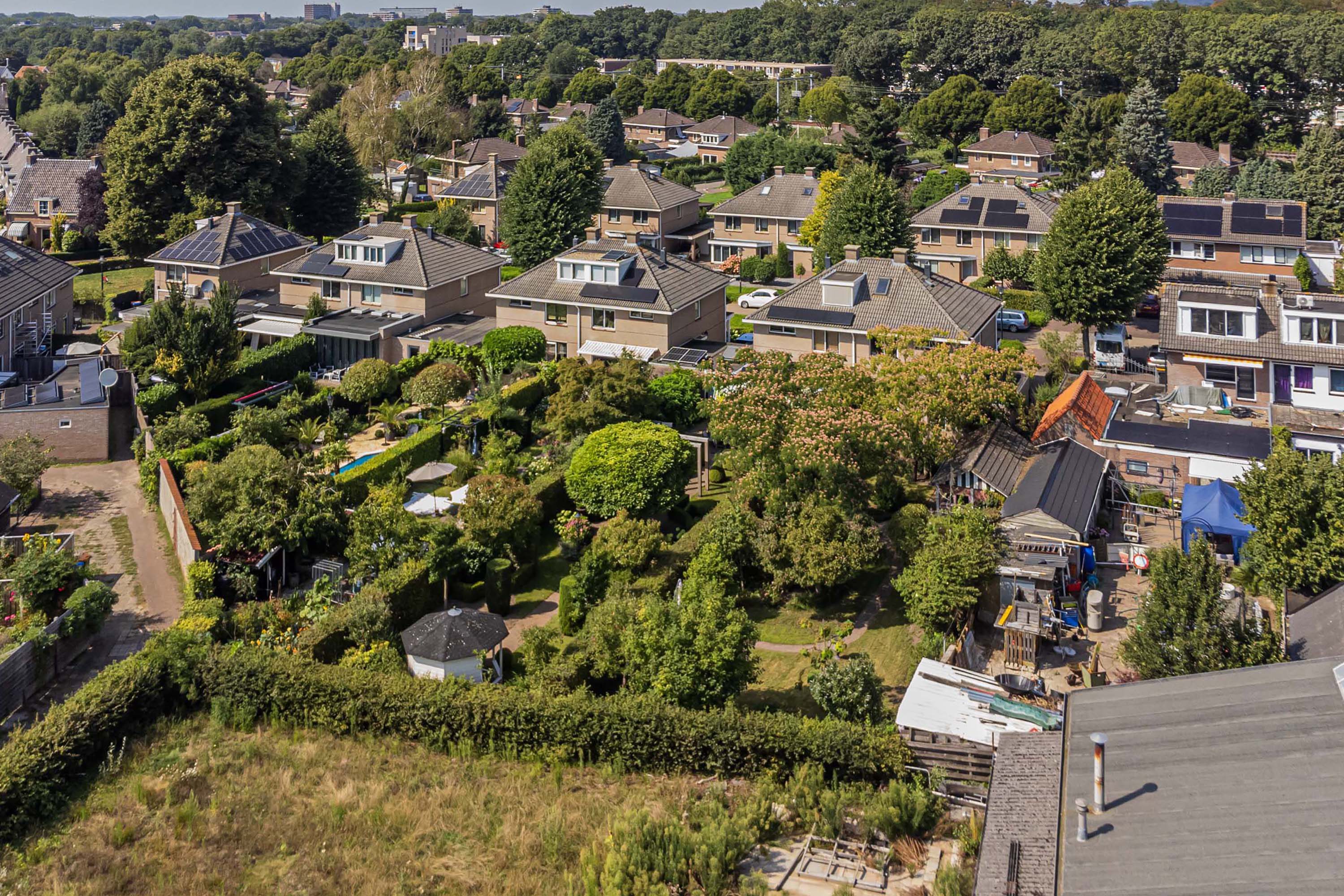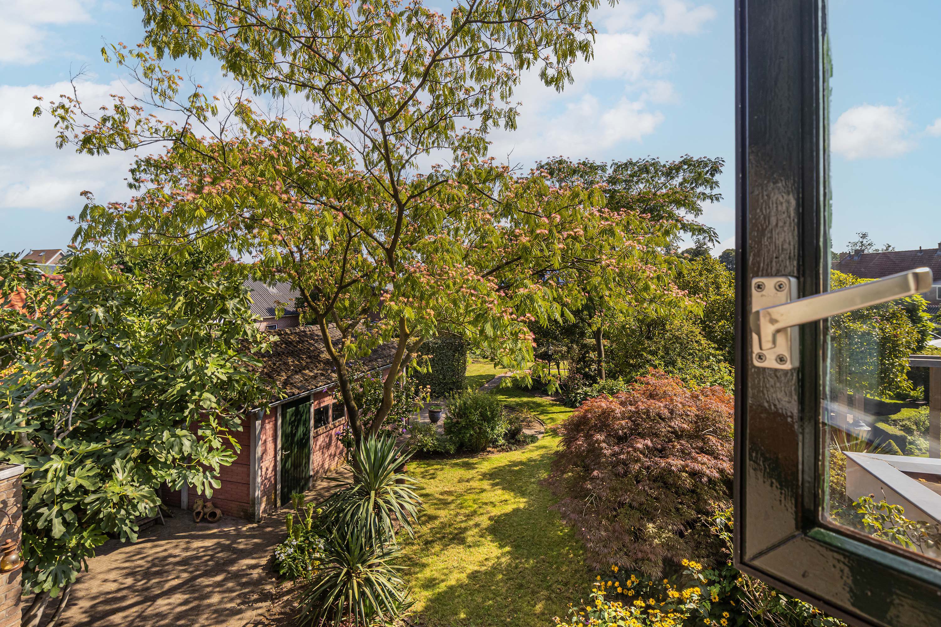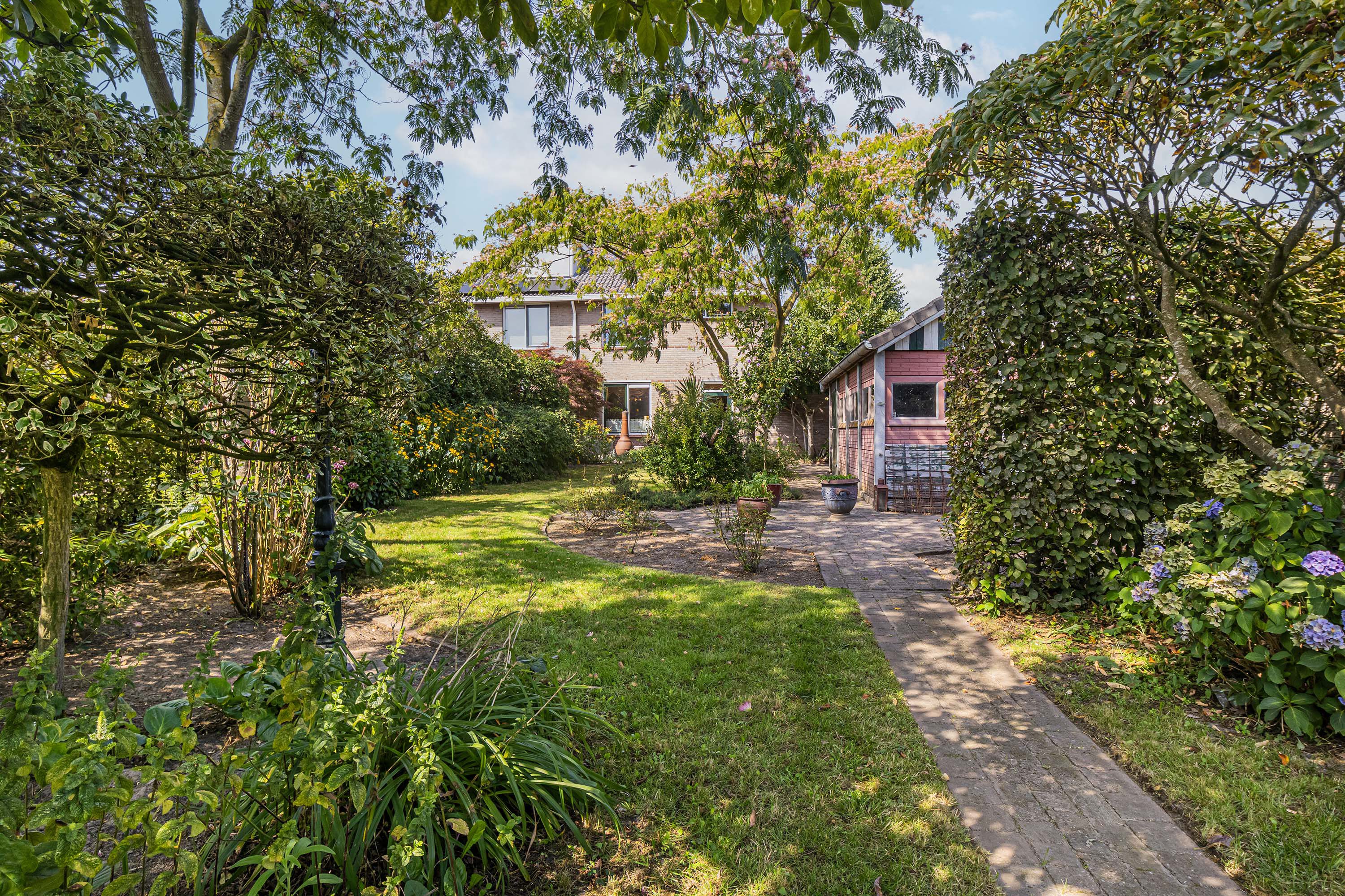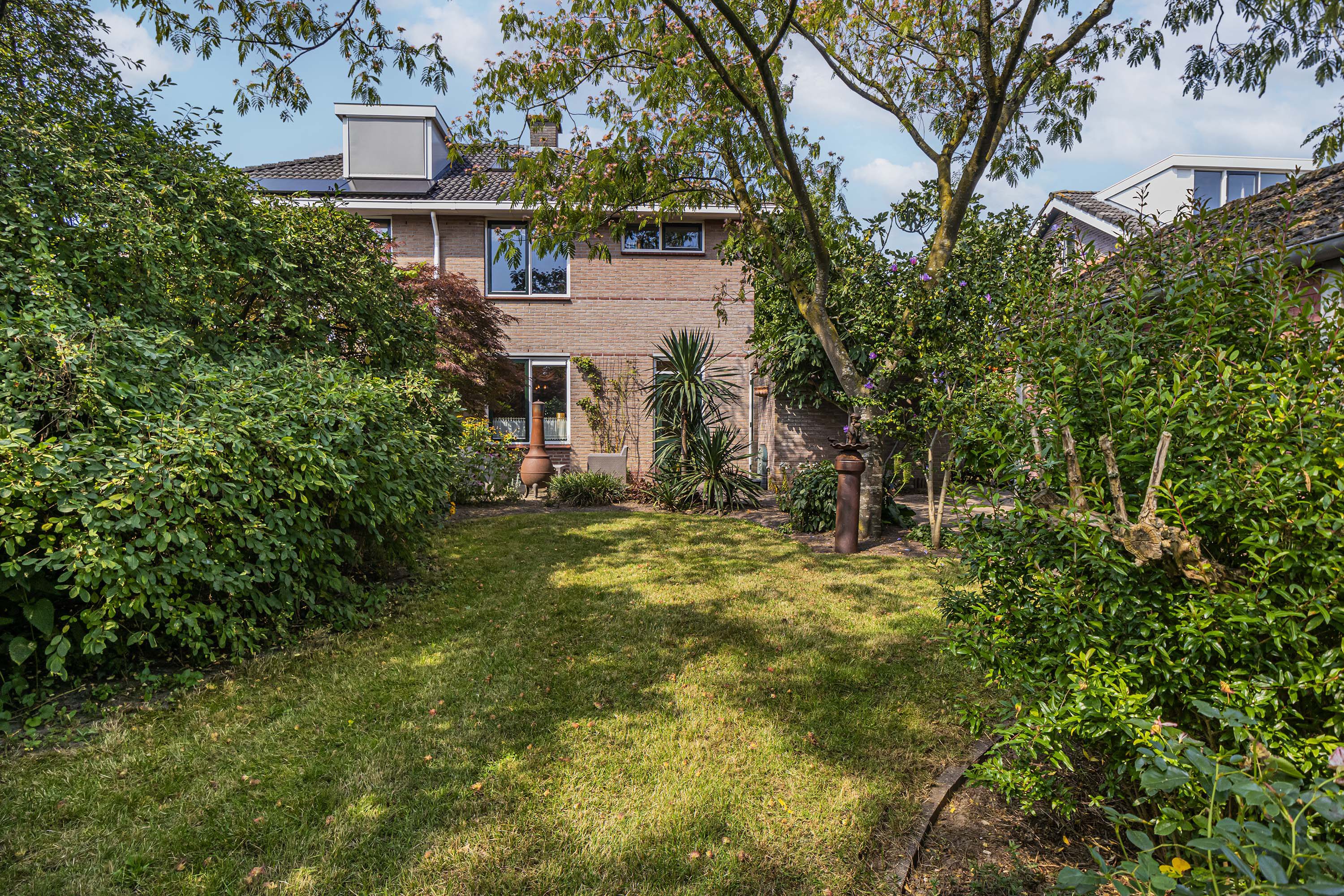 De achtertuin, met een indrukwekkende diepte van meer dan 32 meter, ligt op het zuiden en is bereikbaar via de keuken, de garage en een achterom. Deze ruime tuin biedt tal van mogelijkheden om gezellige zithoeken te realiseren en tegelijkertijd een fijne speelplek te creëren voor kinderen. Verder is er een praktische berging aanwezig, perfect voor extra opslag.