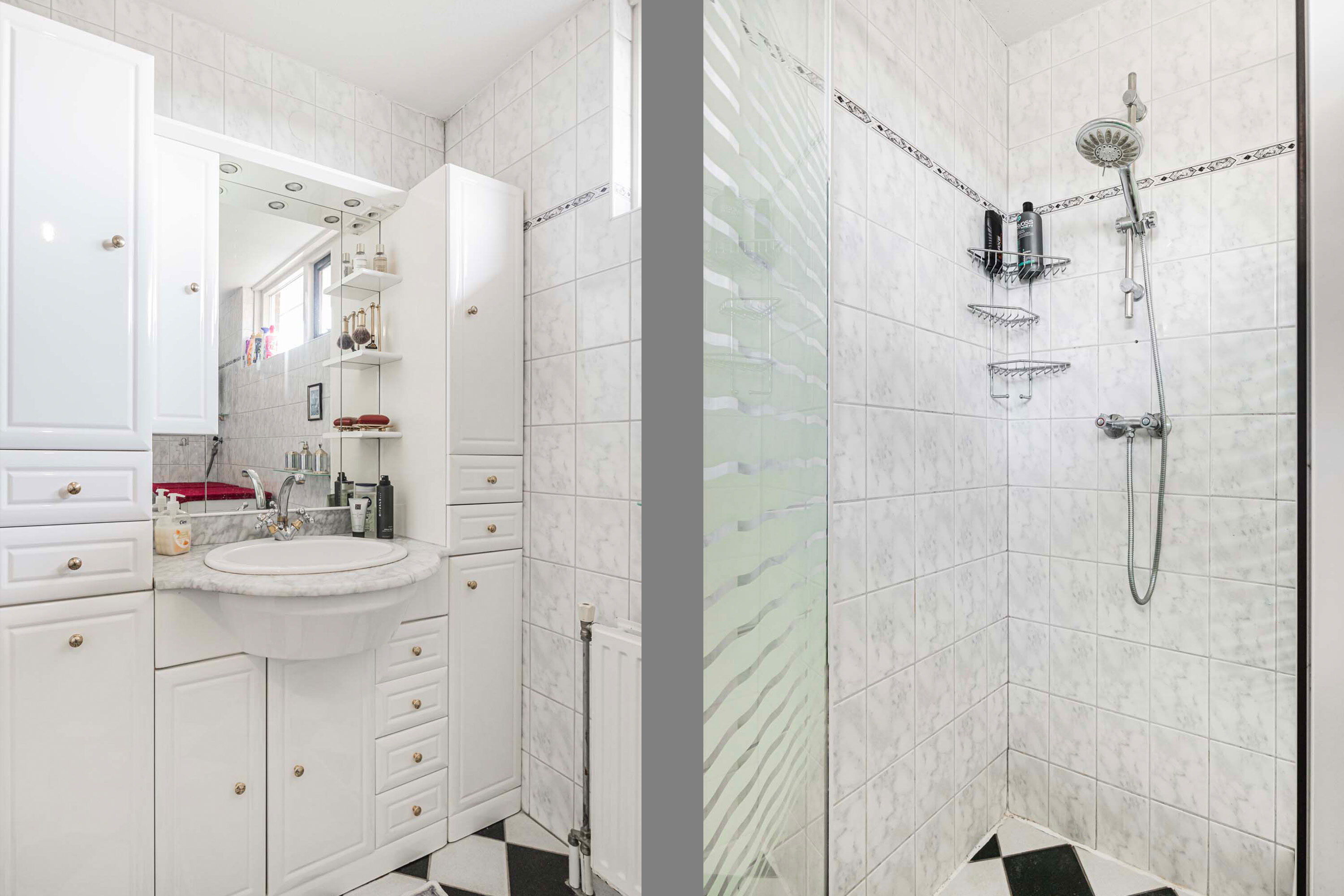 De ruime overloop geeft toegang tot alle vertrekken op deze verdieping. Er zijn drie lichte slaapkamers met oppervlaktes van respectievelijk 11,7 m², 11,2 m² en 10,4 m². Alle kamers zijn voorzien van ramen, wat zorgt voor veel daglicht. De badkamer heeft een wastafelmeubel, toilet en een douche. Tevens zijn hier de aansluitingen aanwezig voor de wasmachine en droger. Het raam in de badkamer zorgt voor natuurlijke ventilatie.