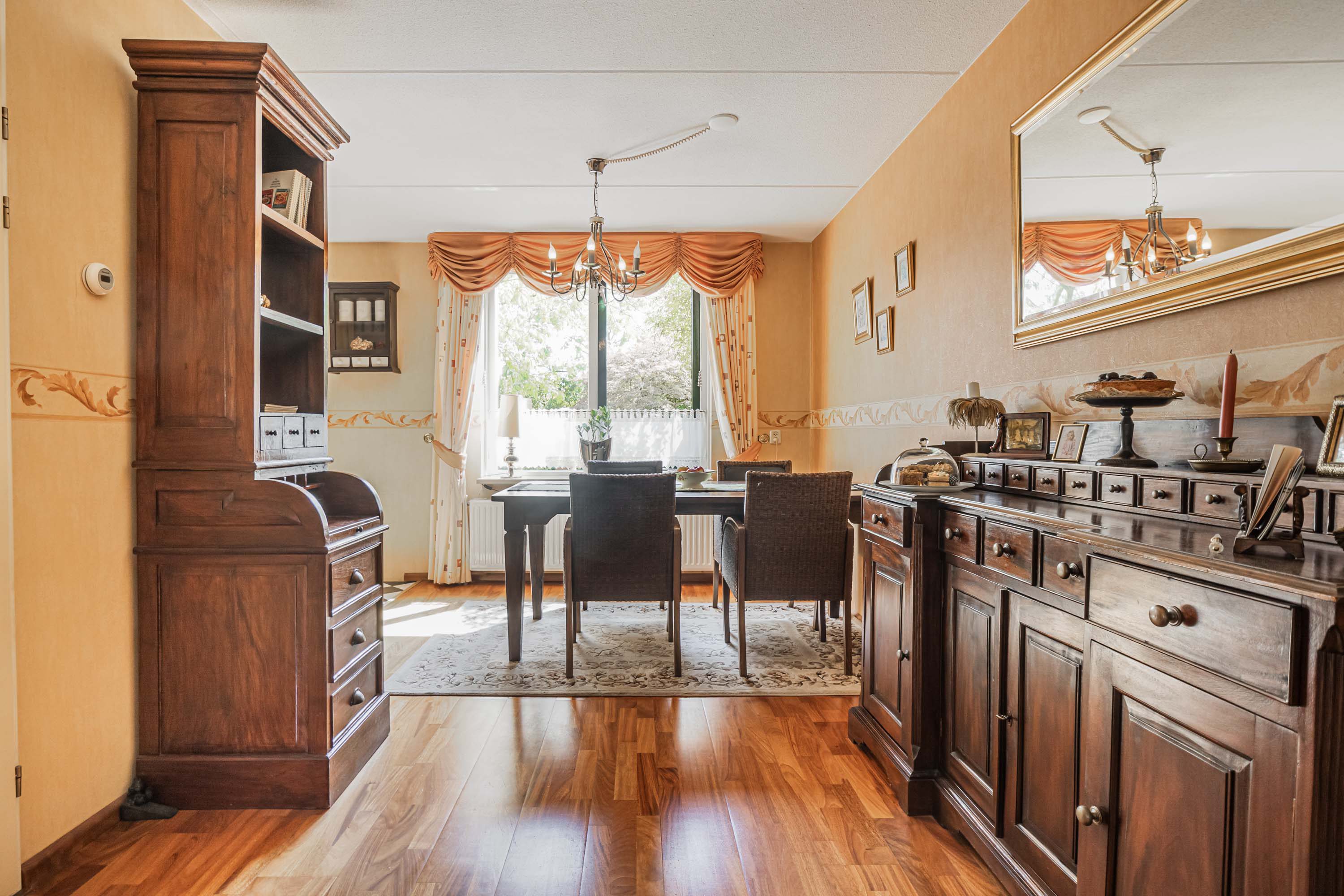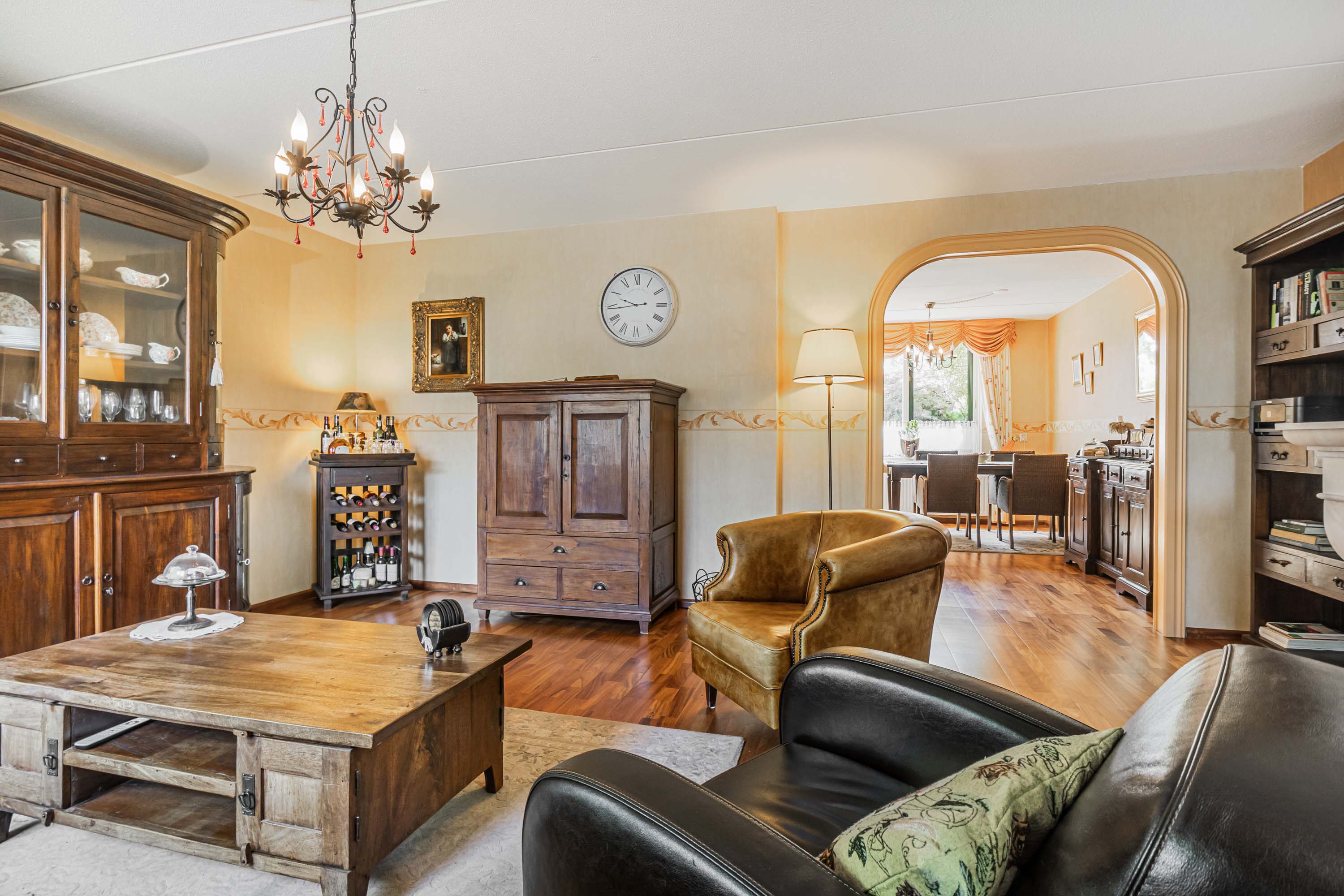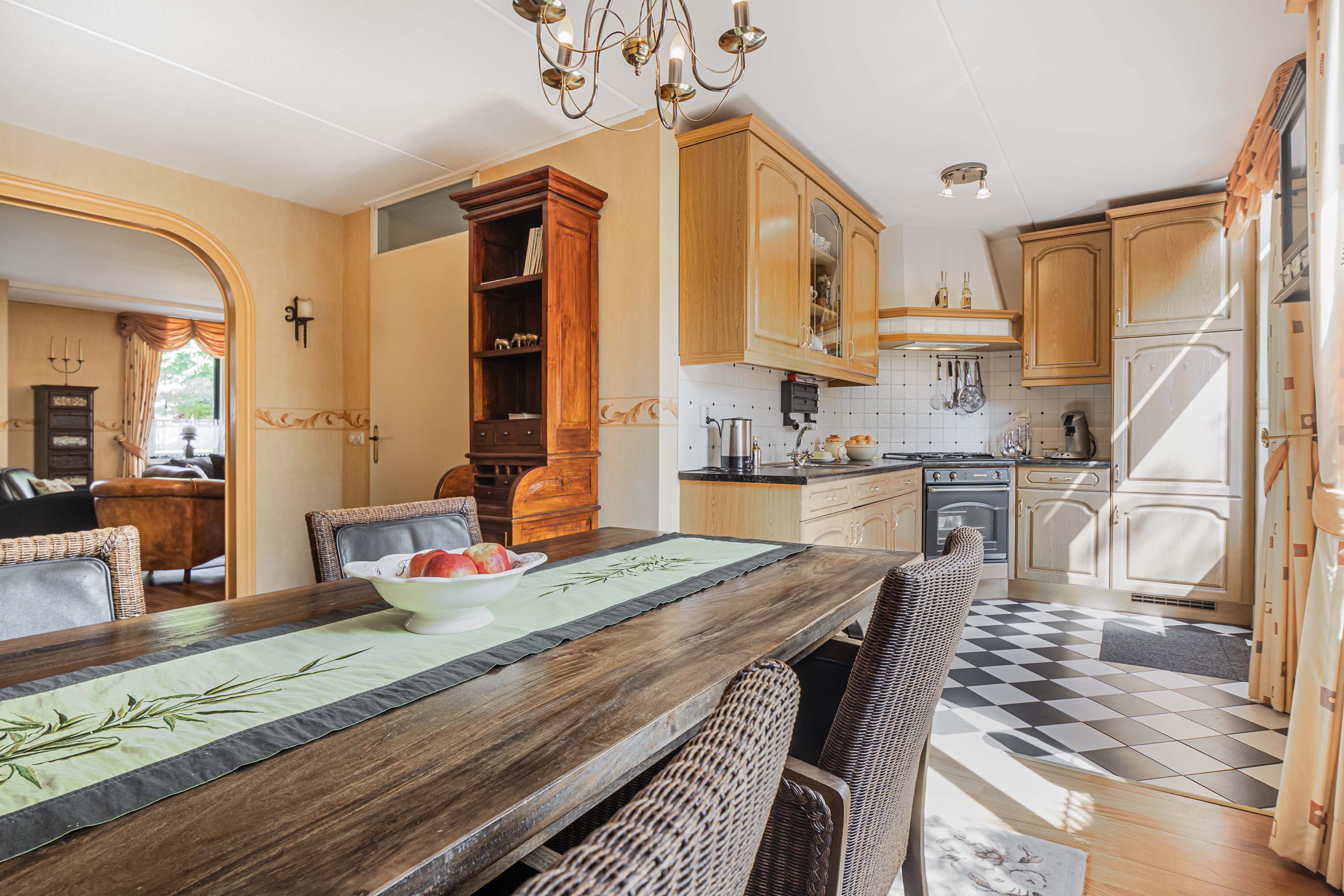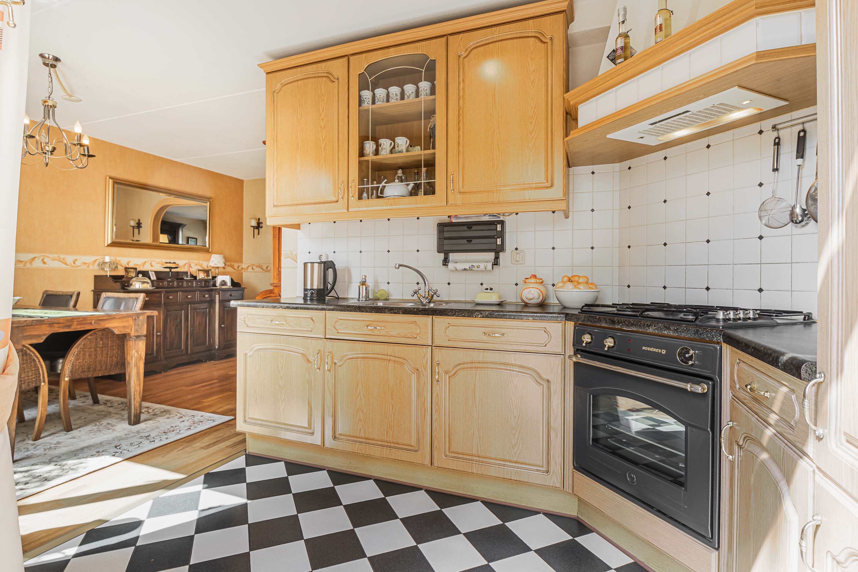 Via de entree, waar zich het toilet, de trapopgang en de meterkast bevinden, betreed je de royale woonkamer. Dankzij de grote raampartijen profiteert de woonkamer van veel natuurlijk daglicht. Er is volop ruimte voor zowel een comfortabele zitbank als meerdere fauteuils. De sfeervolle open haard zorgt voor extra warmte en een knusse ambiance. Vanuit de woonkamer is het eetgedeelte te bereiken, dat voldoende plaats biedt voor een lange eettafel. Vanuit hier loop je door naar de keuken. De keuken is voorzien van diverse inbouwapparatuur, waaronder een gasfornuis, afzuigkap, oven en koelkast. Daarnaast biedt de keuken directe toegang tot de tuin.