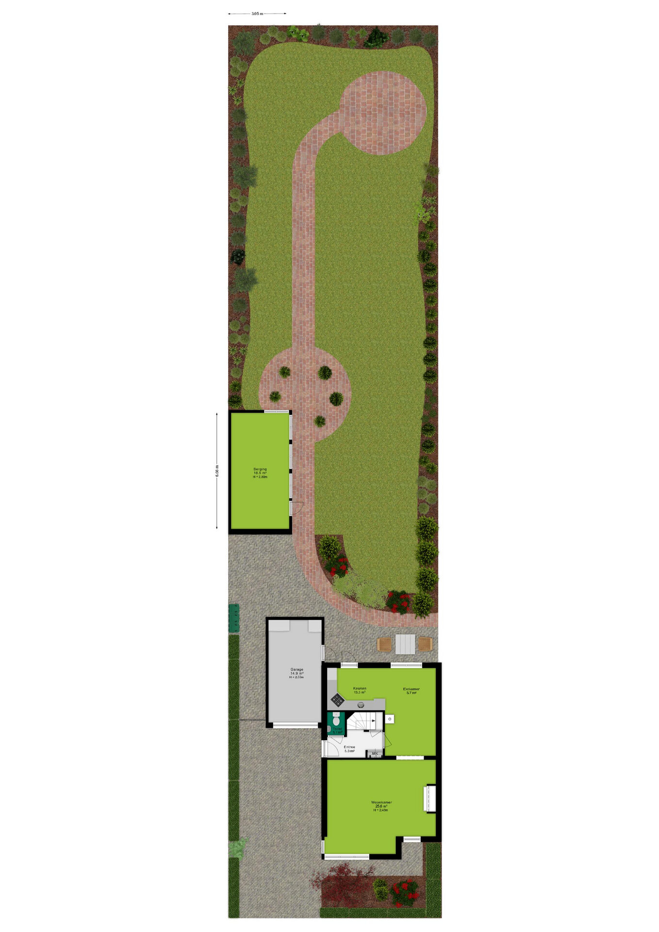 - Royale, zuidelijk gelegen tuin van meer dan 32 meter diep;