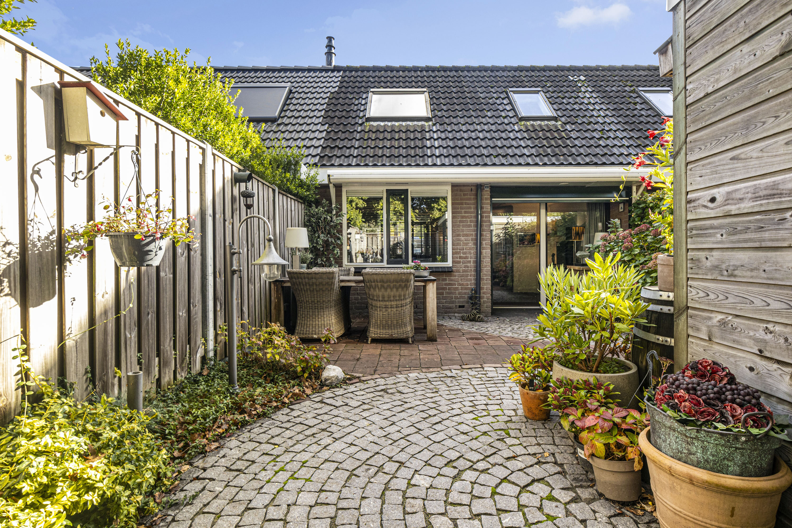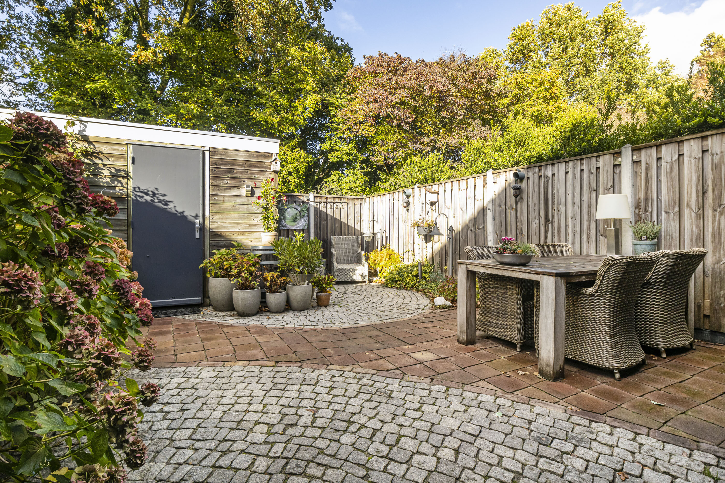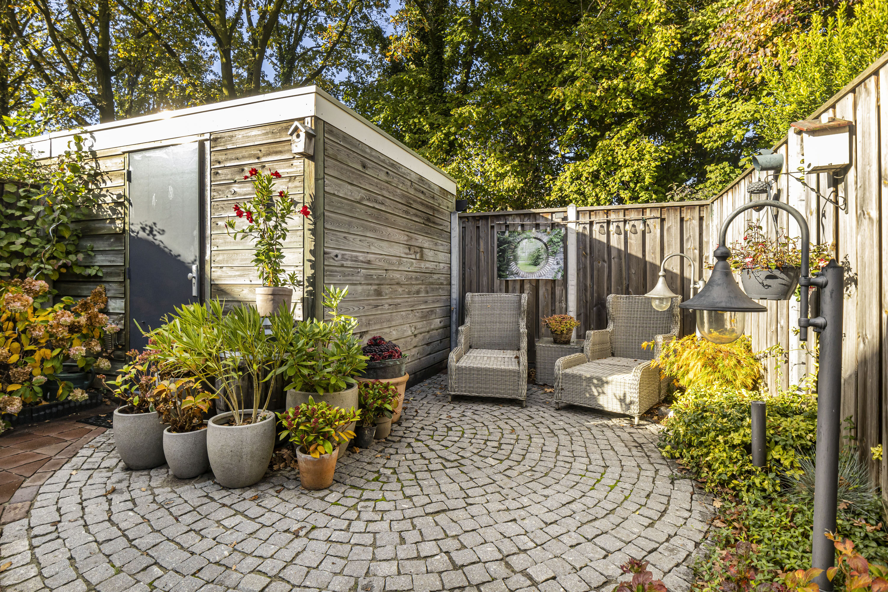 Via de schuifpui in de woonkamer stap je de ruime achtertuin in. Een smalle overkapping maakt droog naar buiten gaan makkelijk en langs de achtergevel loopt zonwering over de volle lengte. Achter in de tuin staat de berging, die aan de buitenzijde is voorzien van een rolluik. Via de berging is de tuin ook achterom bereikbaar. Achter de tuin ligt een groenstrook richting de weg, waardoor je geen directe inkijk hebt. De tuin ligt op het noord/westen, met de gehele dag door een zonnige plek.