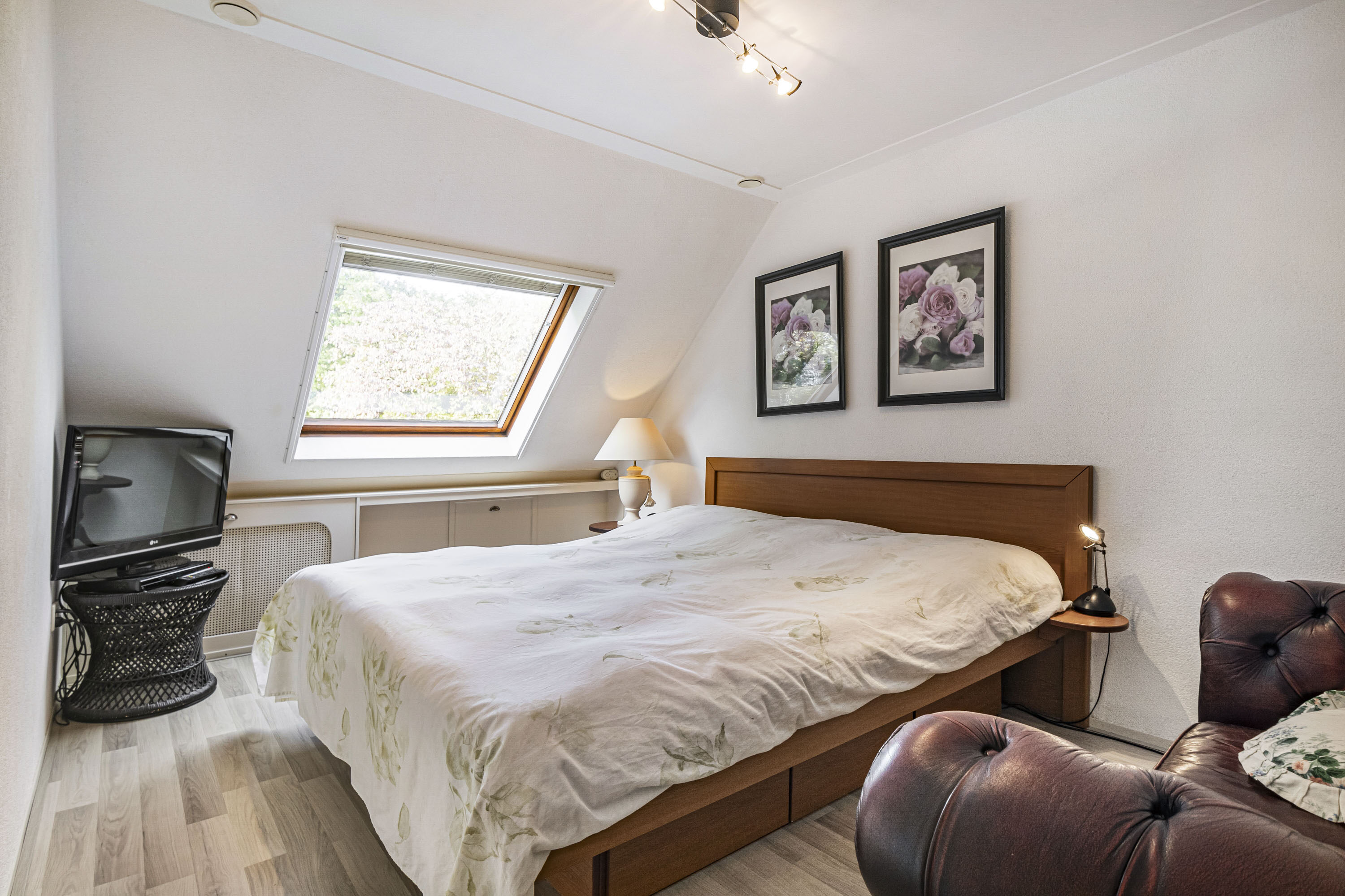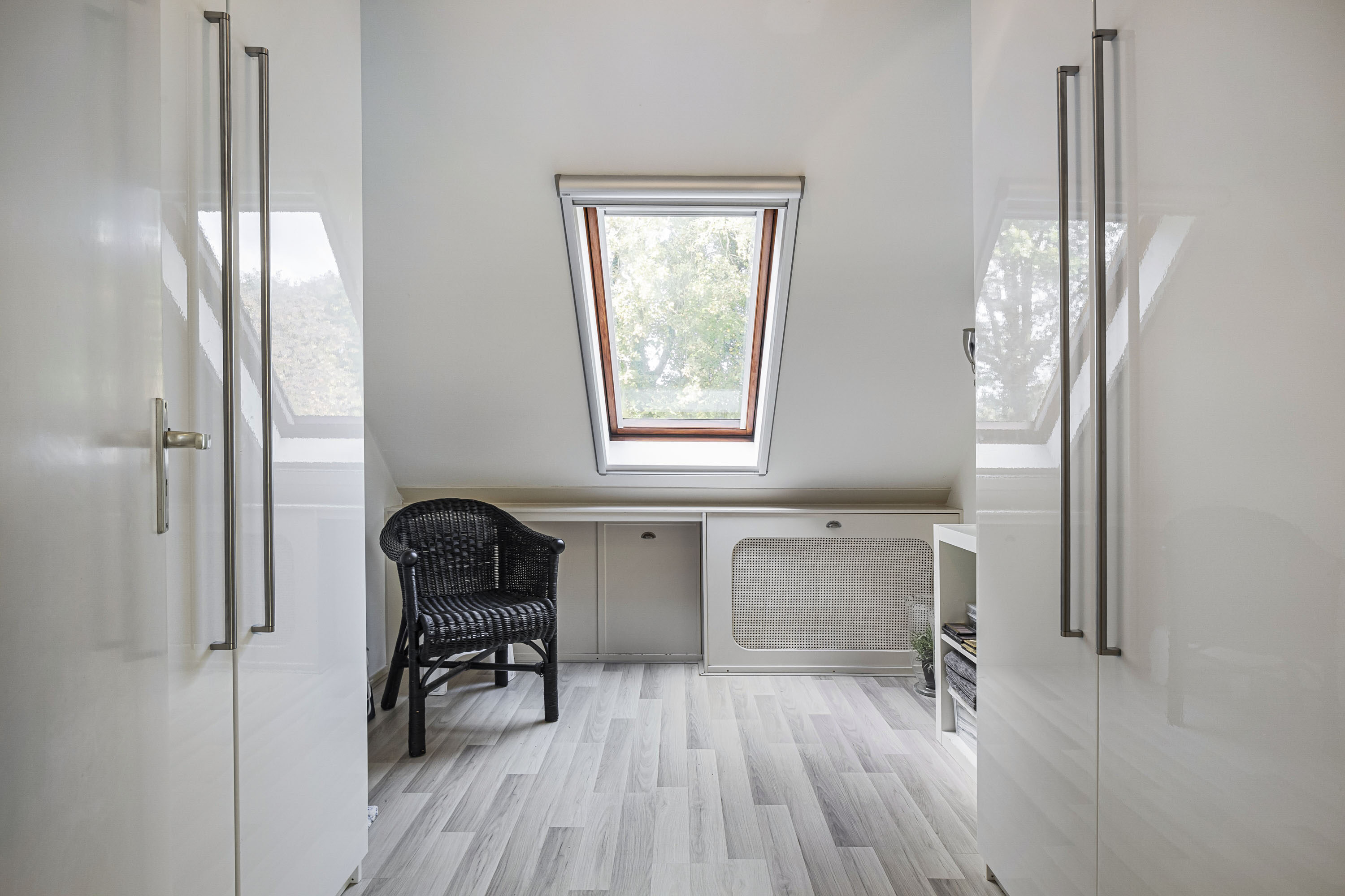 De overloop biedt toegang tot drie slaapkamers, elk met een prettig lichtinval door dakramen. In de hoofdslaapkamer en de kamer ernaast bevindt zich handige bergruimte achter het schot. De derde slaapkamer is ook ideaal te gebruiken als werk- of hobbyruimte. De badkamer is compleet uitgerust met een wastafel, ligbad met bubbelstand, inloopdouche en een aansluiting voor de wasmachine.