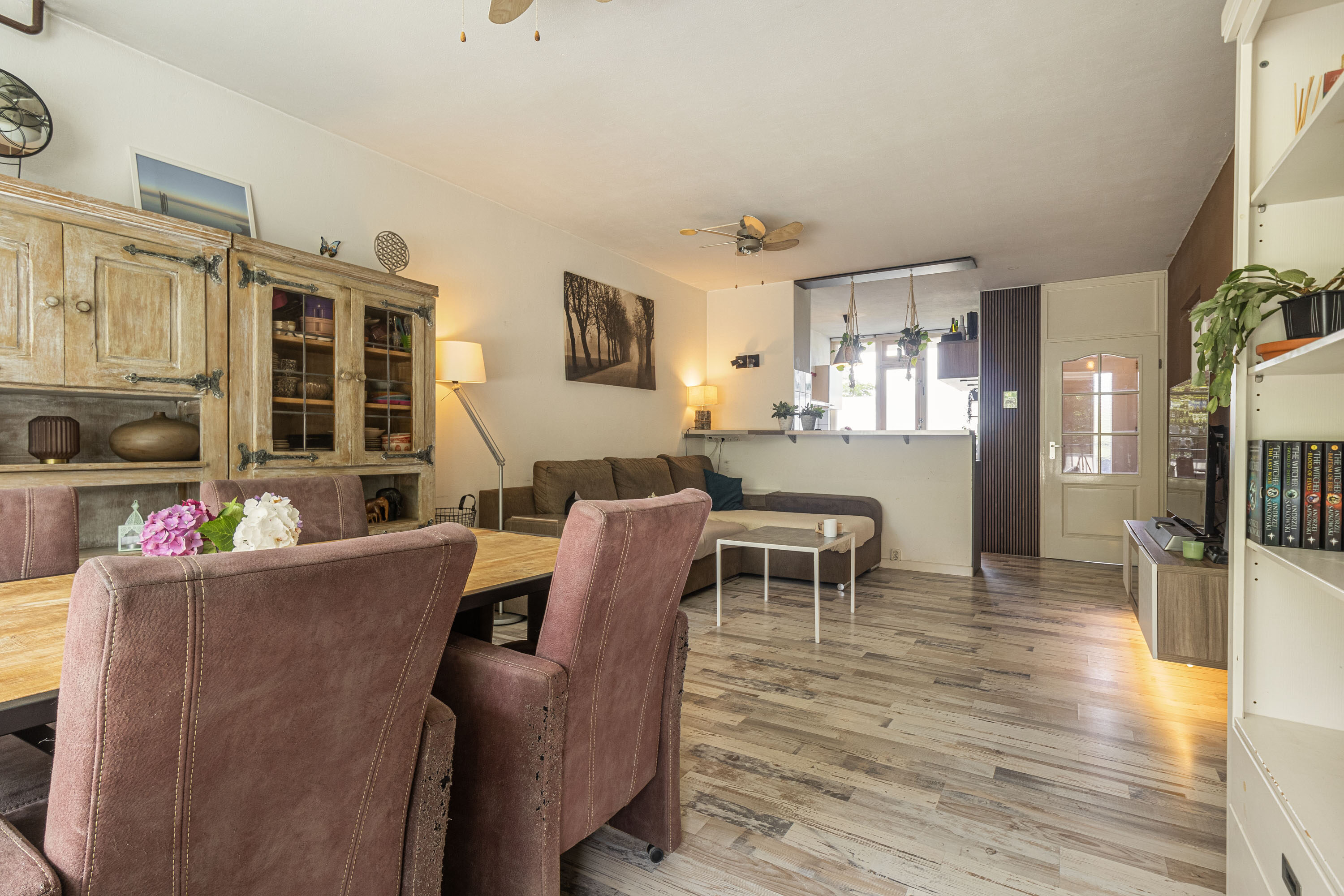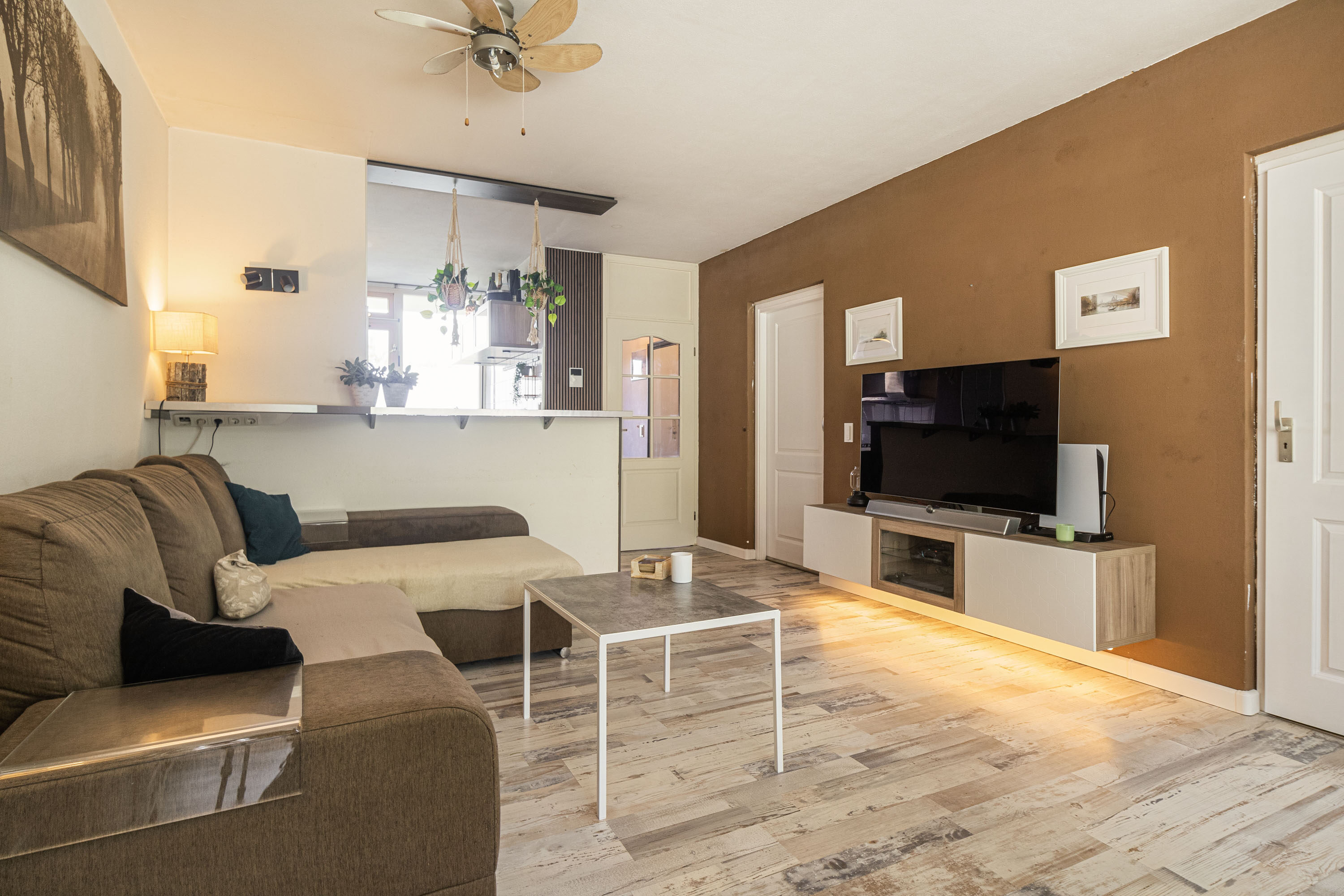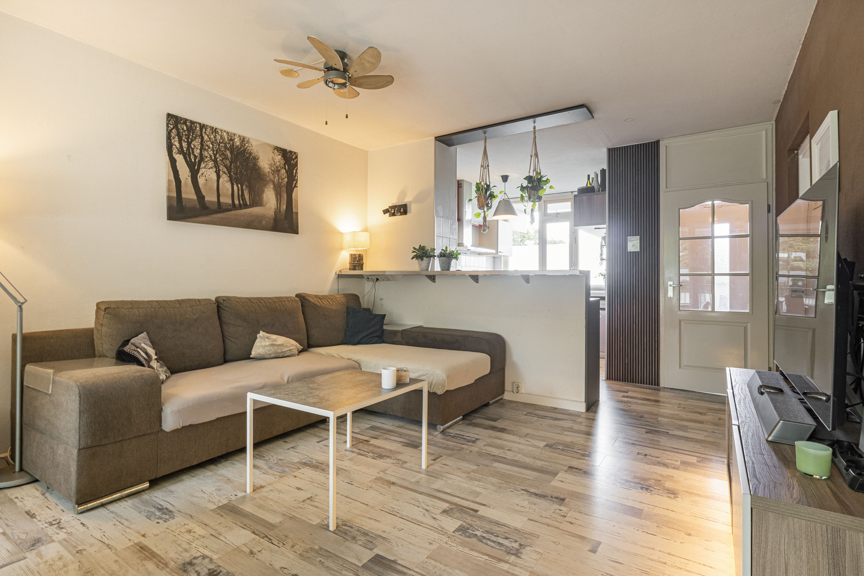 Je komt het appartement binnen via de centrale hal, die toegang biedt tot vrijwel alle ruimtes. In de leefruimte, aan de voorzijde, bevindt zich de keuken, voorzien van een gasfornuis, oven en koelkast. Dankzij de open verbinding tussen de keuken en de woonkamer ontstaat er een gezellige en uitnodigende sfeer. Of je nu aan het koken bent of aan tafel zit, de open opzet zorgt ervoor dat je voortdurend met elkaar in contact blijft.