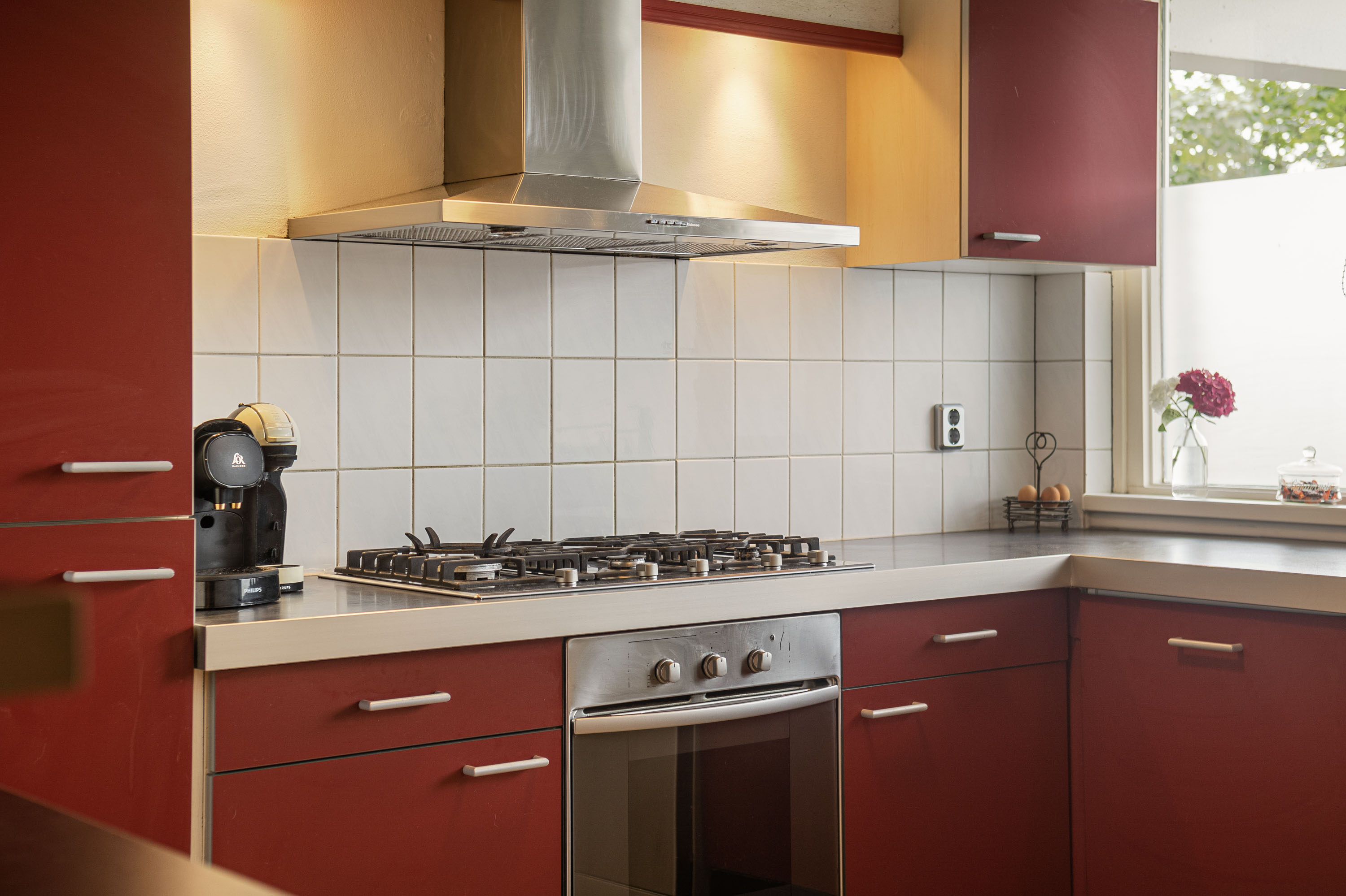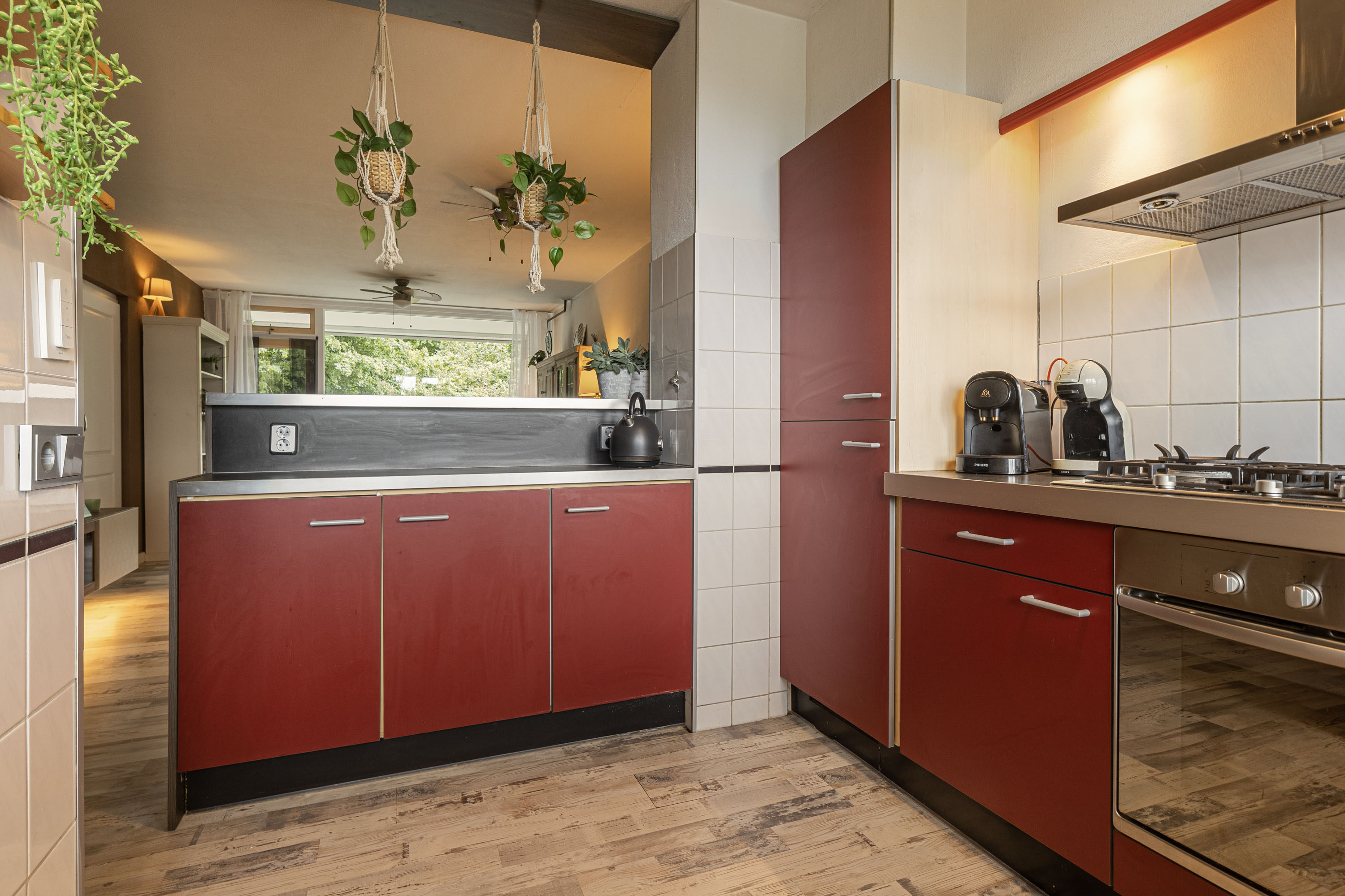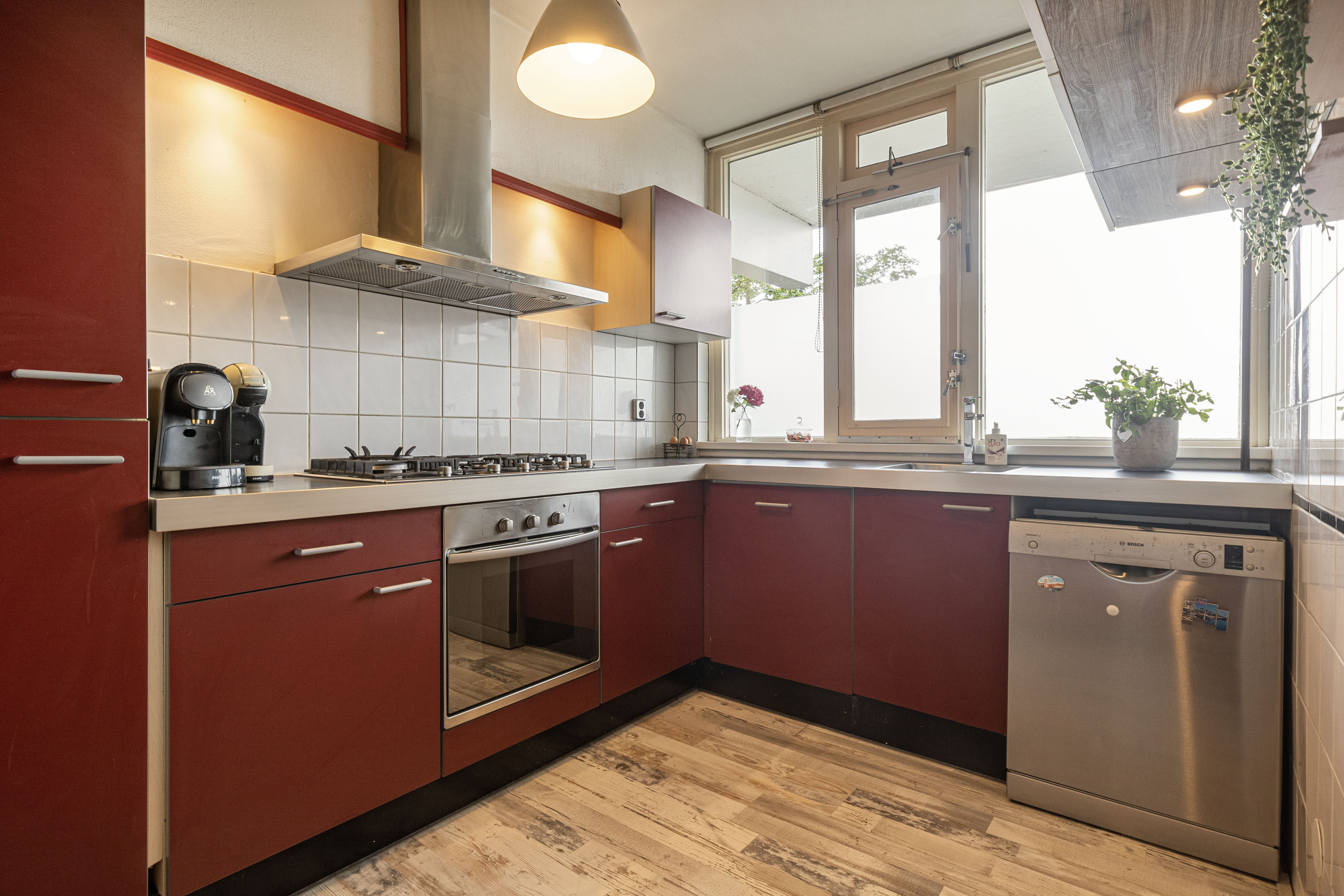 Je komt het appartement binnen via de centrale hal, die toegang biedt tot vrijwel alle ruimtes. In de leefruimte, aan de voorzijde, bevindt zich de keuken, voorzien van een gasfornuis, oven en koelkast. Dankzij de open verbinding tussen de keuken en de woonkamer ontstaat er een gezellige en uitnodigende sfeer. Of je nu aan het koken bent of aan tafel zit, de open opzet zorgt ervoor dat je voortdurend met elkaar in contact blijft.