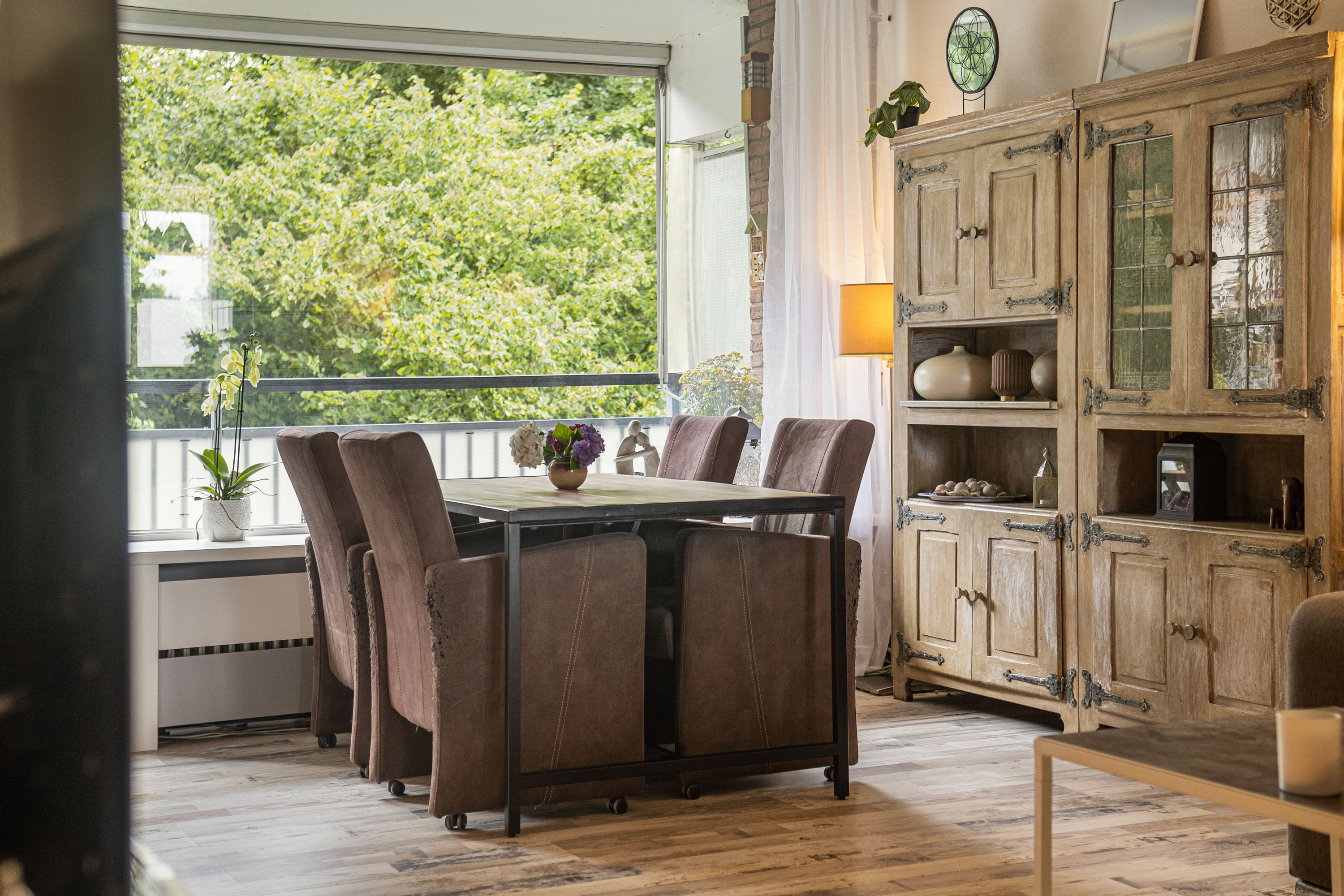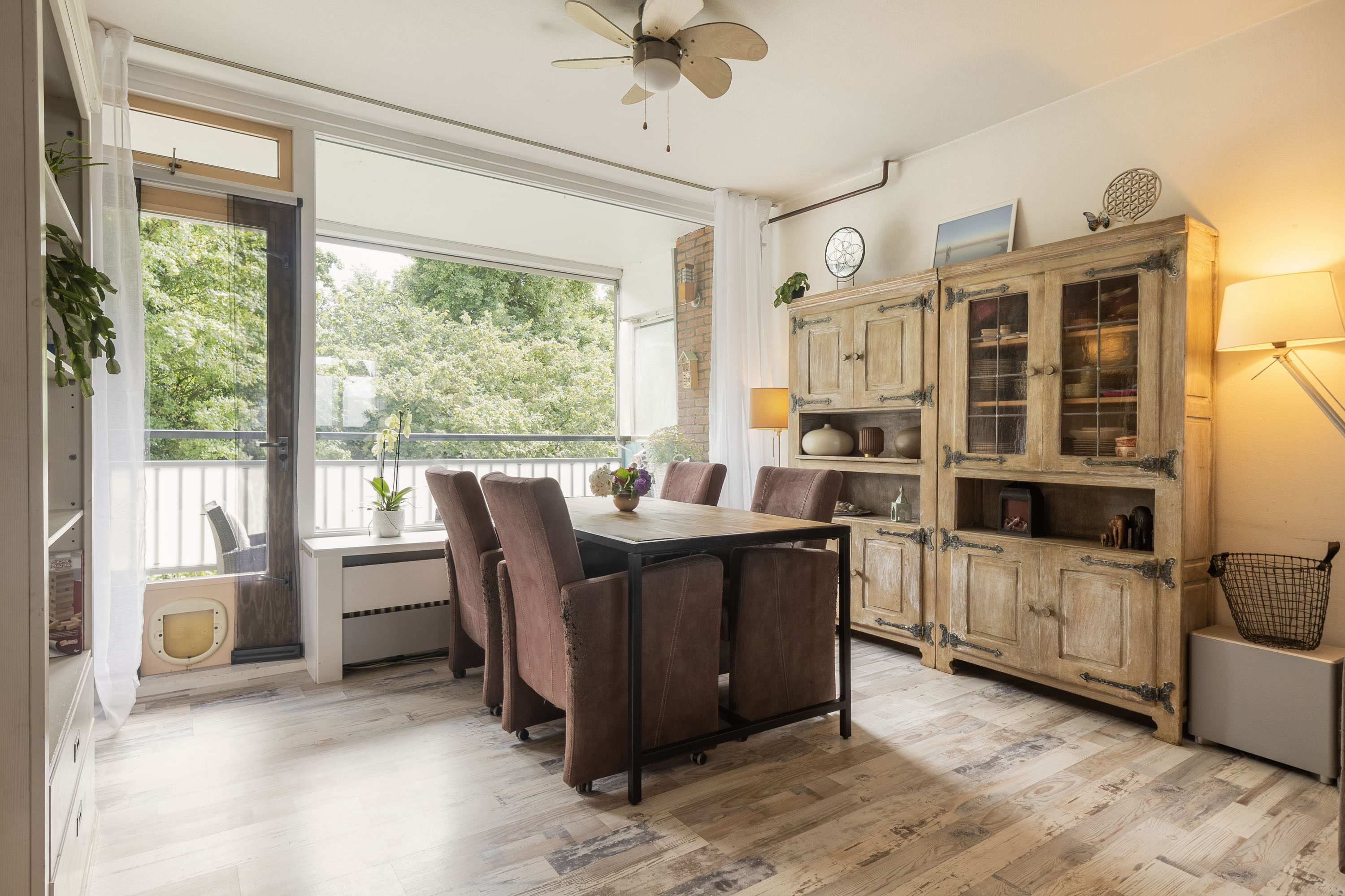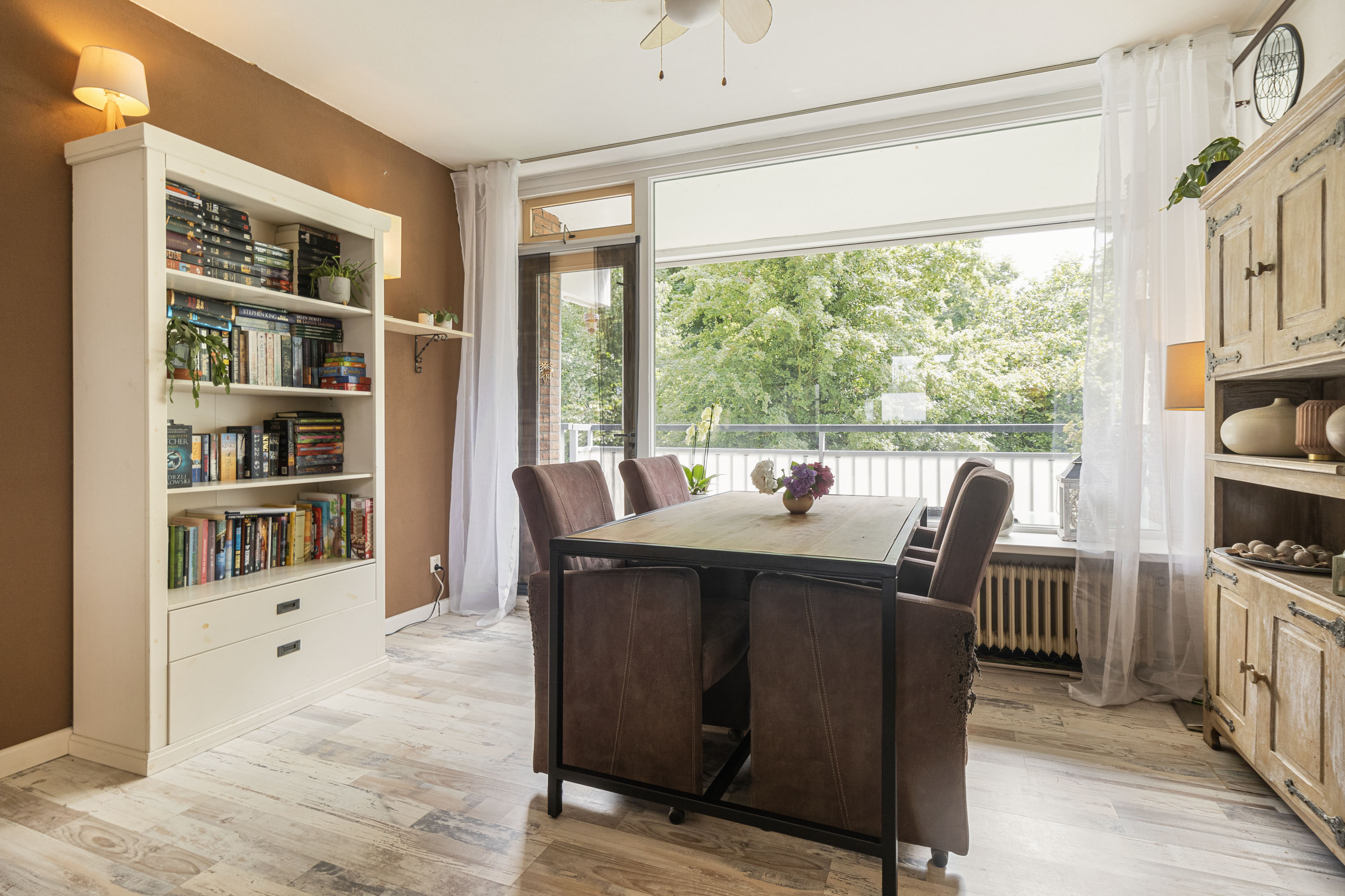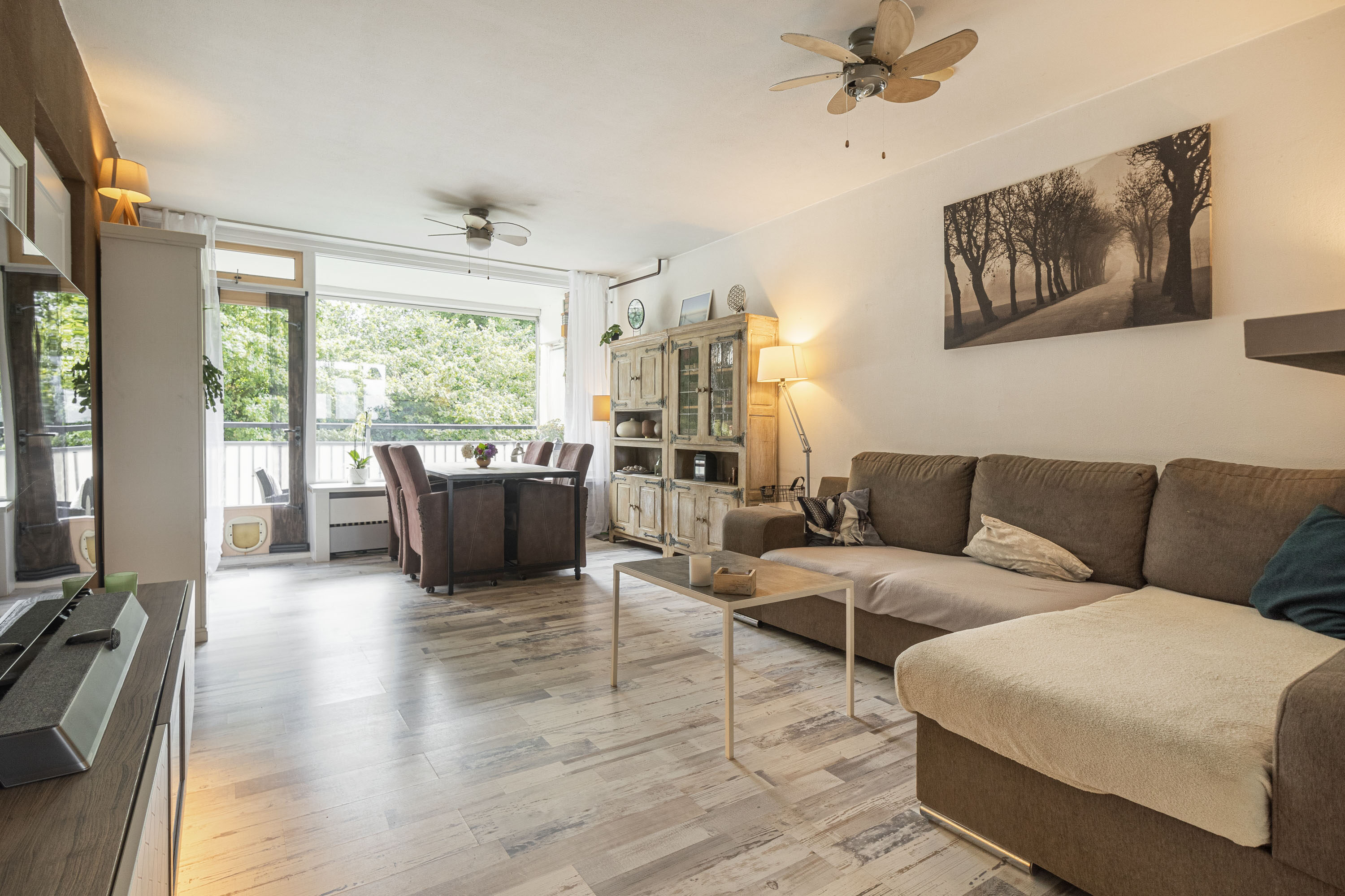 De woonkamer is licht en ruim, met een fijn uitzicht op het groen. Vanuit hier stap je zó het balkon op, waar je tot laat in de middag of avond heerlijk van de zon kunt genieten.
