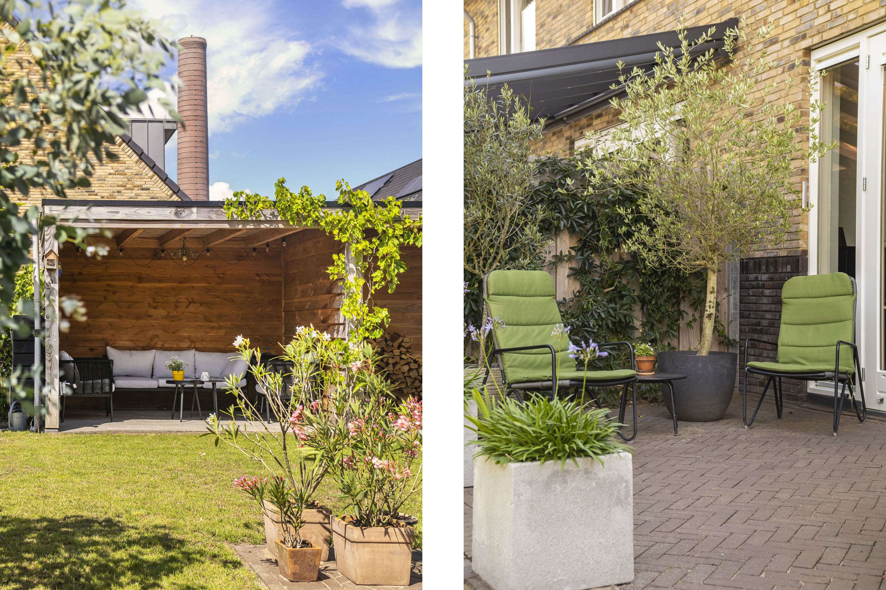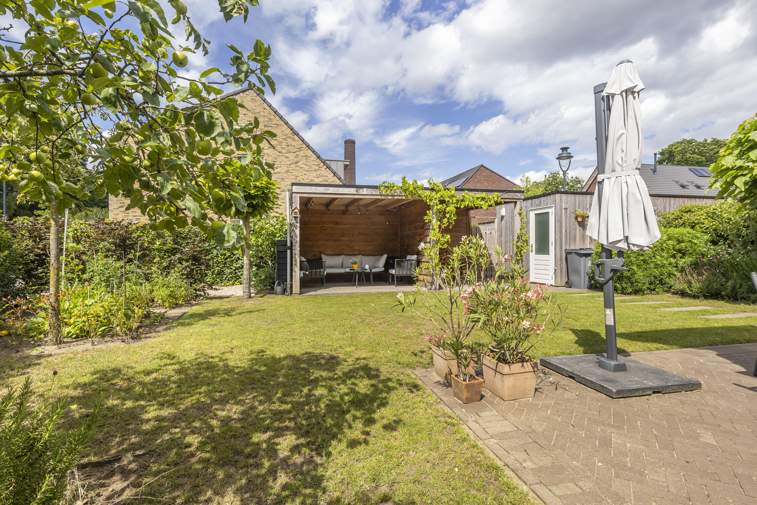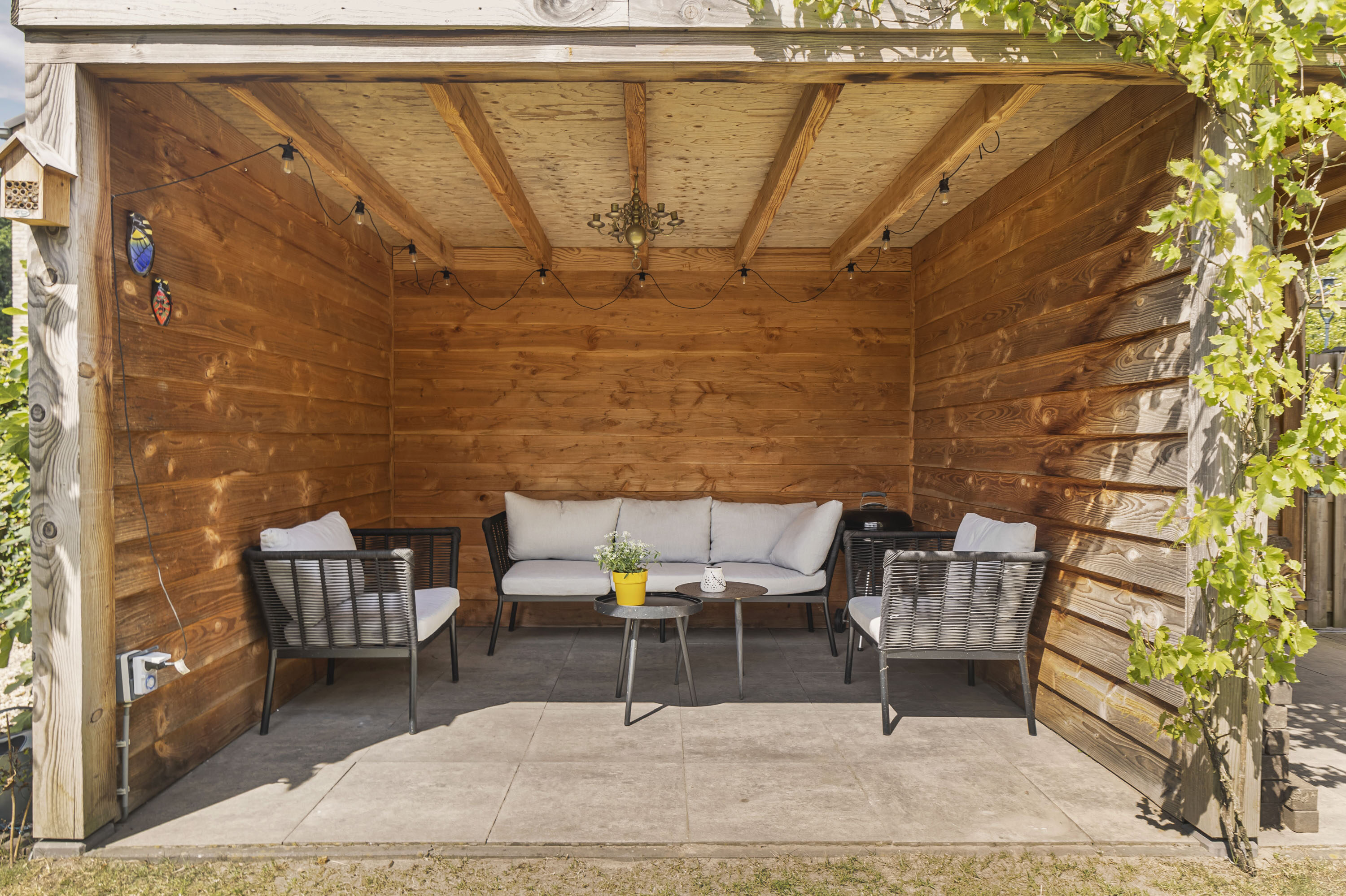 De achtertuin is gelegen op het westen, wat betekent dat je hier kunt genieten van de middag- en avondzon. Door de ligging rondom het huis is er altijd wel een plekje in de zon of schaduw te vinden. Een van de grote pluspunten is de veranda, waar je ook bij minder mooi weer buiten kunt zitten. Achterin staat een houten berging, ideaal voor fietsen of tuingereedschap. De tuin is achterom bereikbaar en aan de zijkant van het perceel is een grindpad aangelegd als parkeerplek op eigen terrein.
