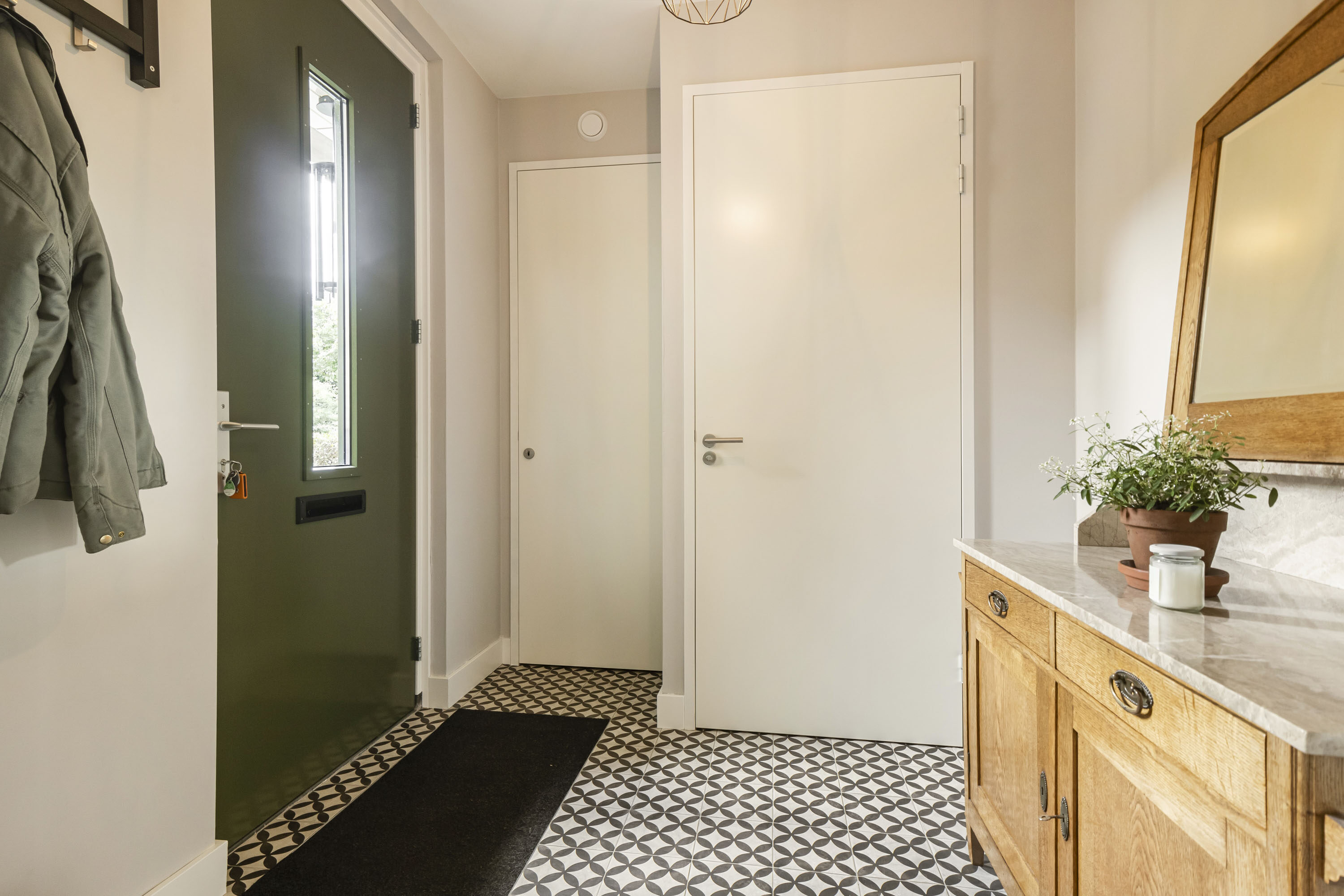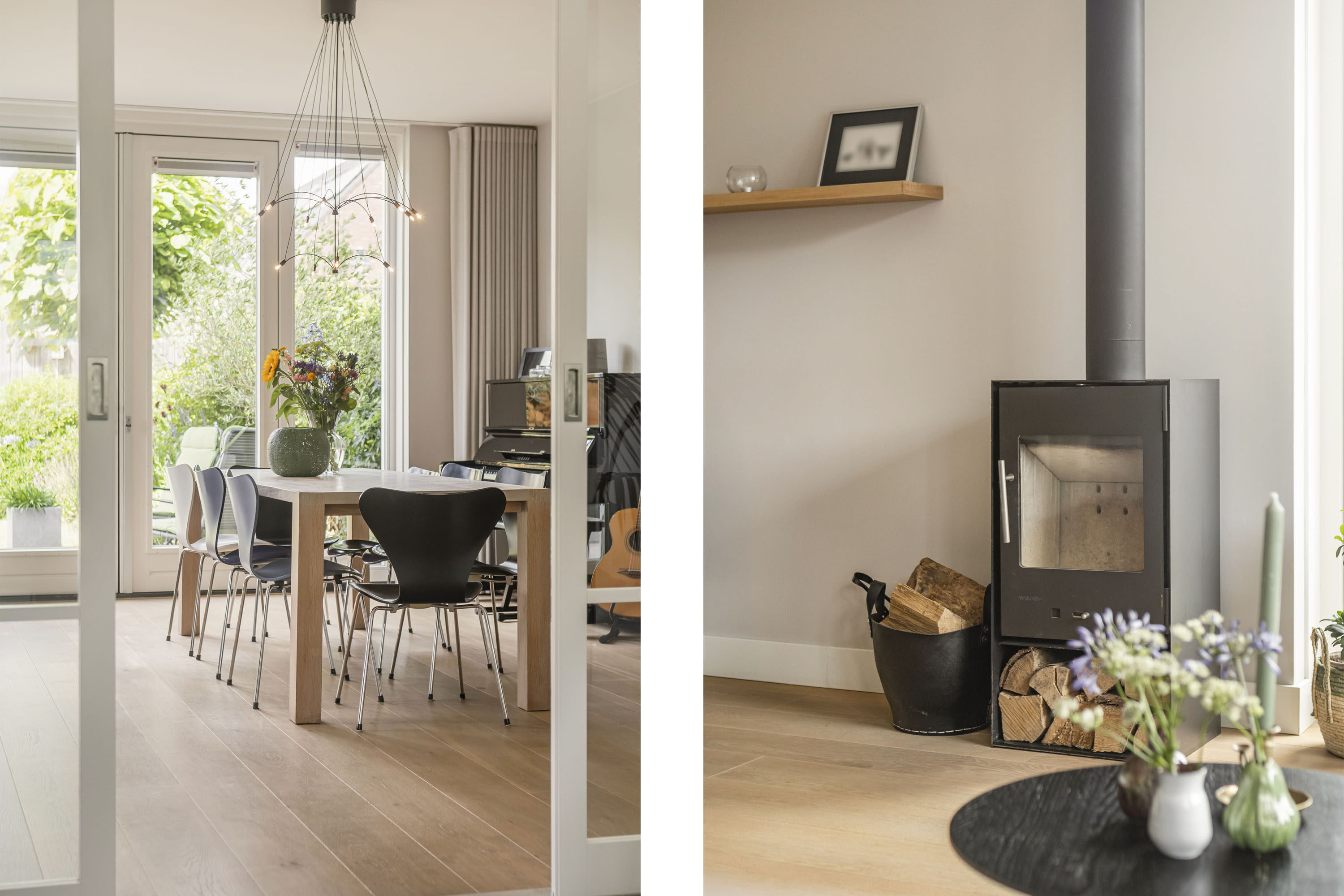 De entree is uitnodigend, met een sfeervolle vloer en toegang tot het toilet. Vanuit hier loop je door naar de woonkeuken, die voorzien is van een kookeiland en veel opbergruimte, een echte leefkeuken met ruimte voor koken en samenzijn. Via de ensuite deuren kom je in de lichte woonkamer. Dankzij twee openslaande deuren naar de tuin en een groot raam aan de zijkant is het hier heerlijk licht. De houtkachel zorgt voor extra sfeer. Er is voldoende ruimte voor een eettafel én een comfortabele zithoek.