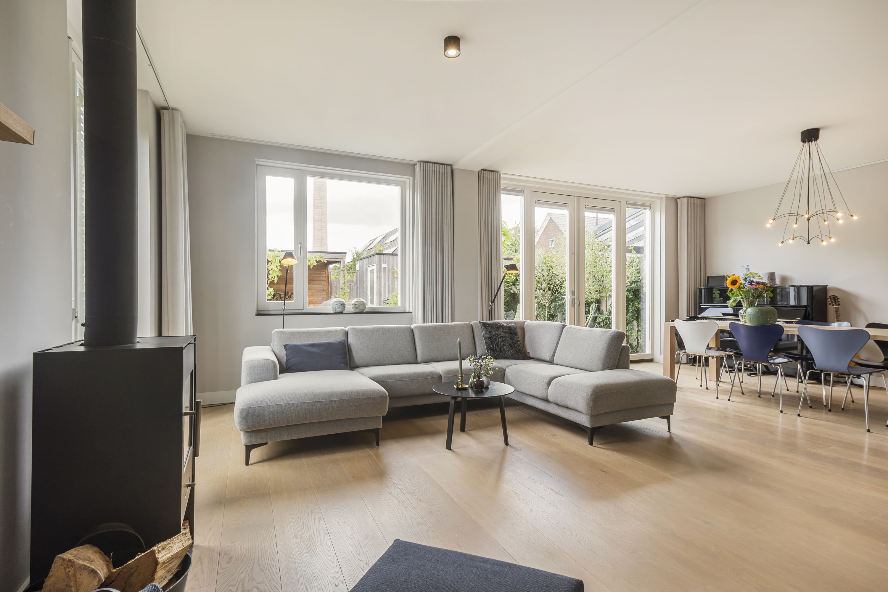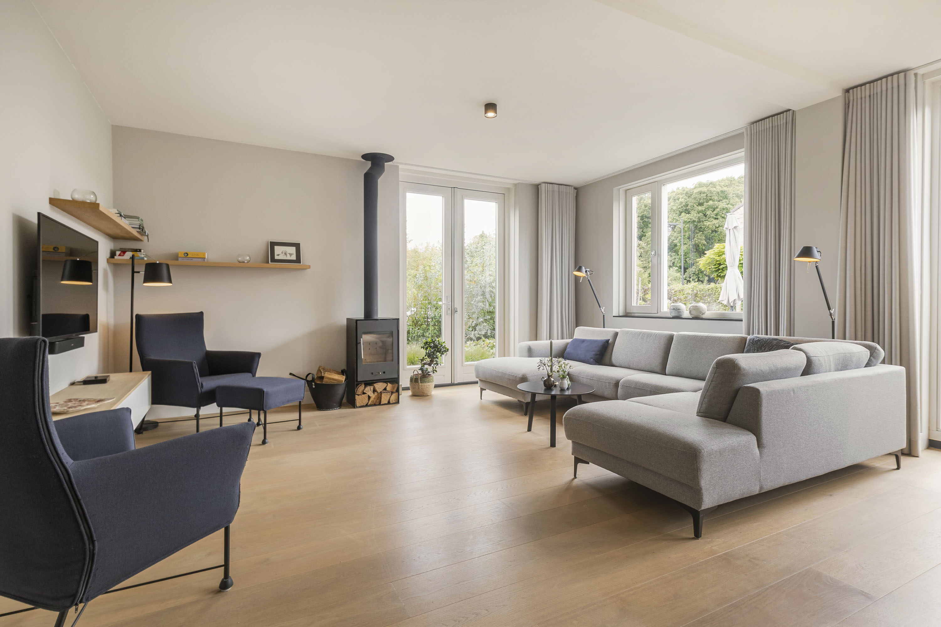 + Grote woonkamer met veel lichtinval, houtkachel en openslaande deuren
