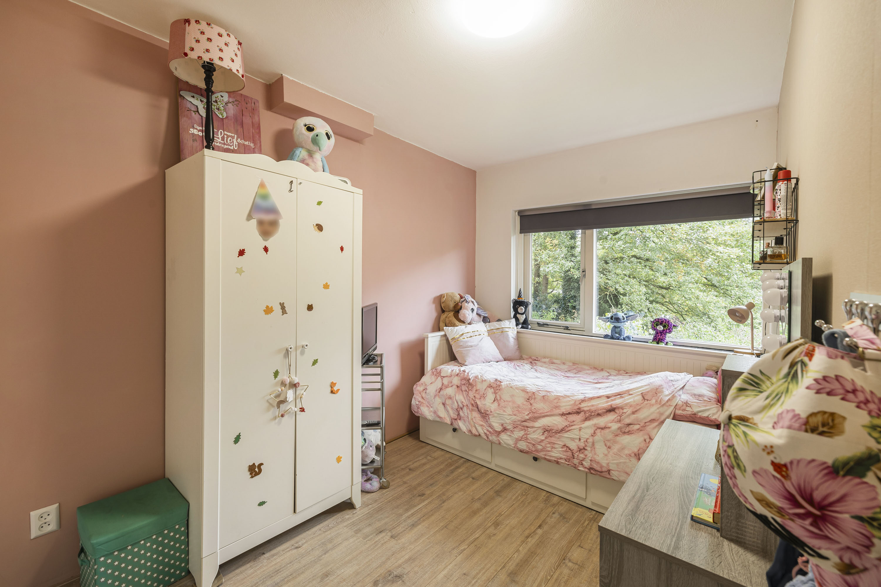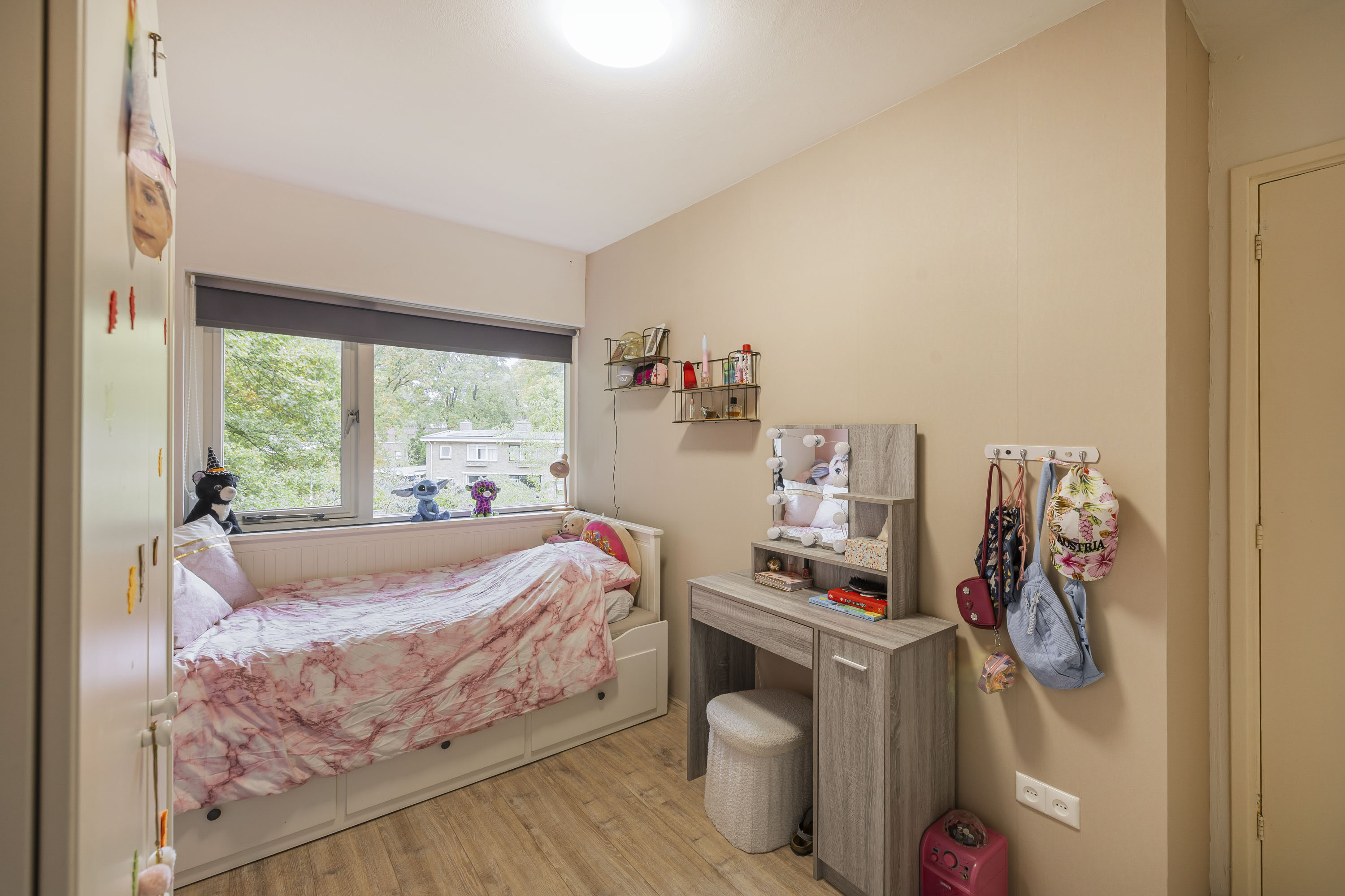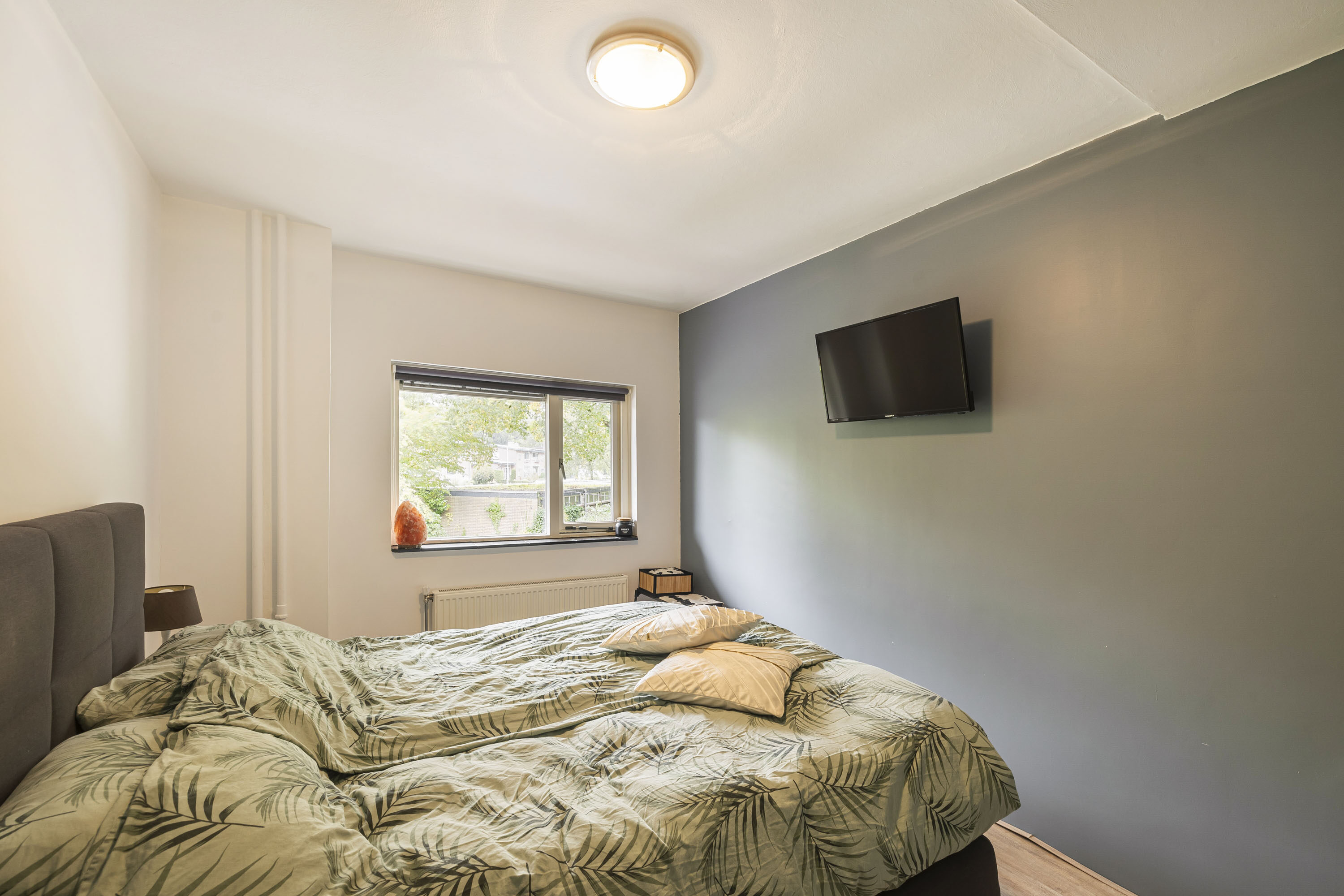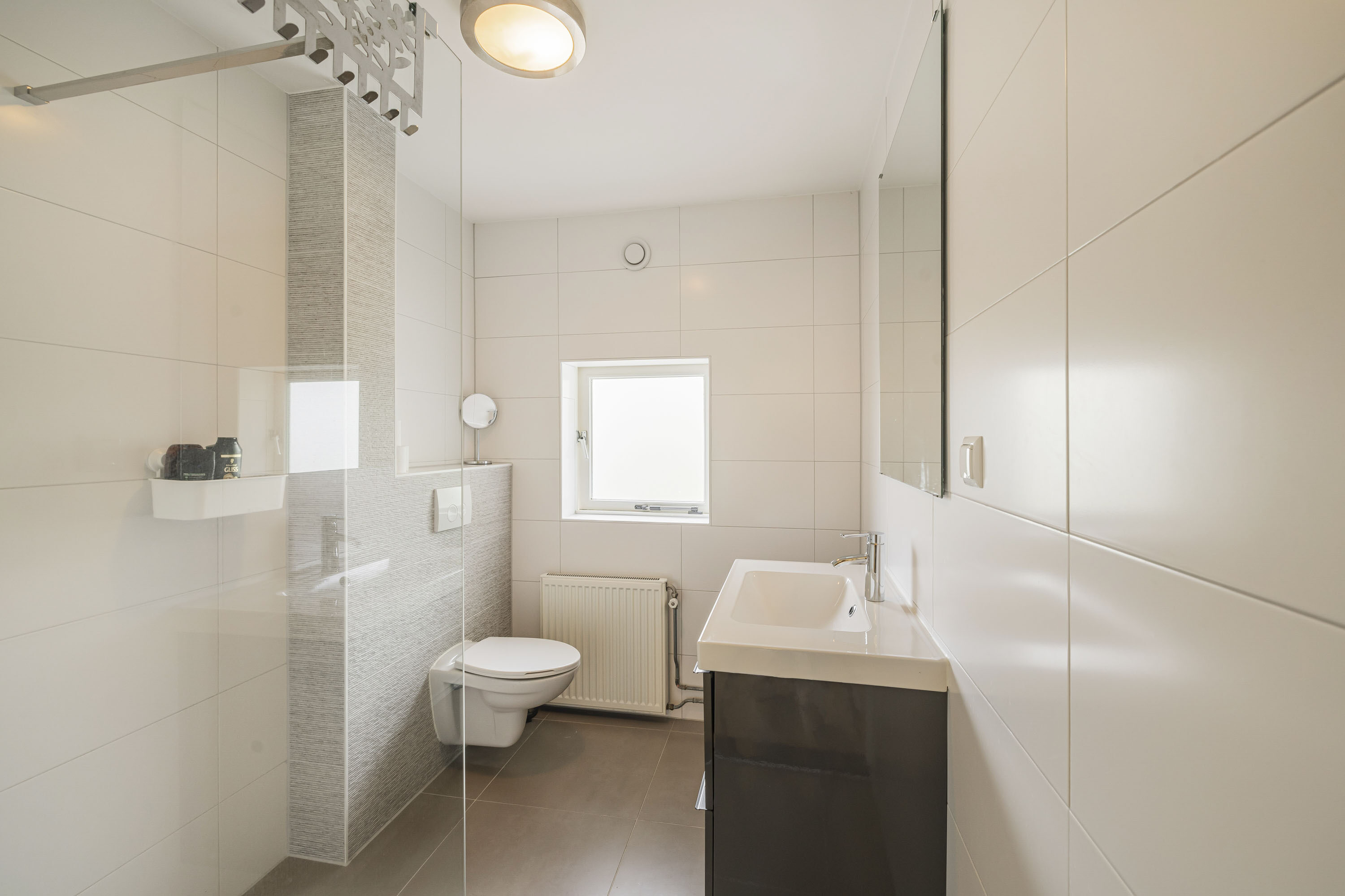 Via de vaste trap kom je op de overloop, die toegang geeft tot drie slaapkamers van 6,5 m², 9,7 m² en 12 m². Alle kamers zijn recht opgetrokken en voorzien van een nette laminaatvloer. Daarnaast zijn er op deze verdieping vier inbouwkasten aanwezig, wat zorgt voor veel opbergruimte. De badkamer aan de voorzijde heeft een moderne en rustgevende uitstraling, met een inloopdouche, wastafelmeubel en toilet.