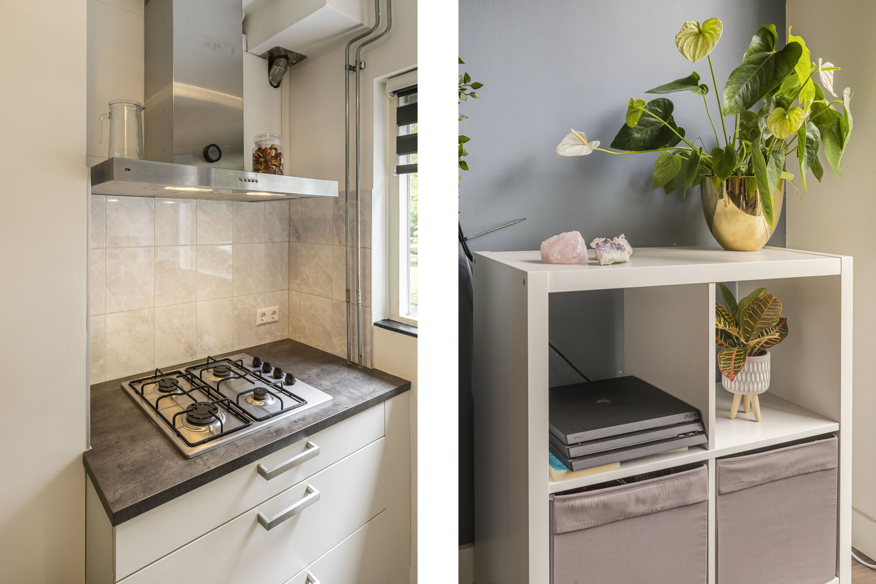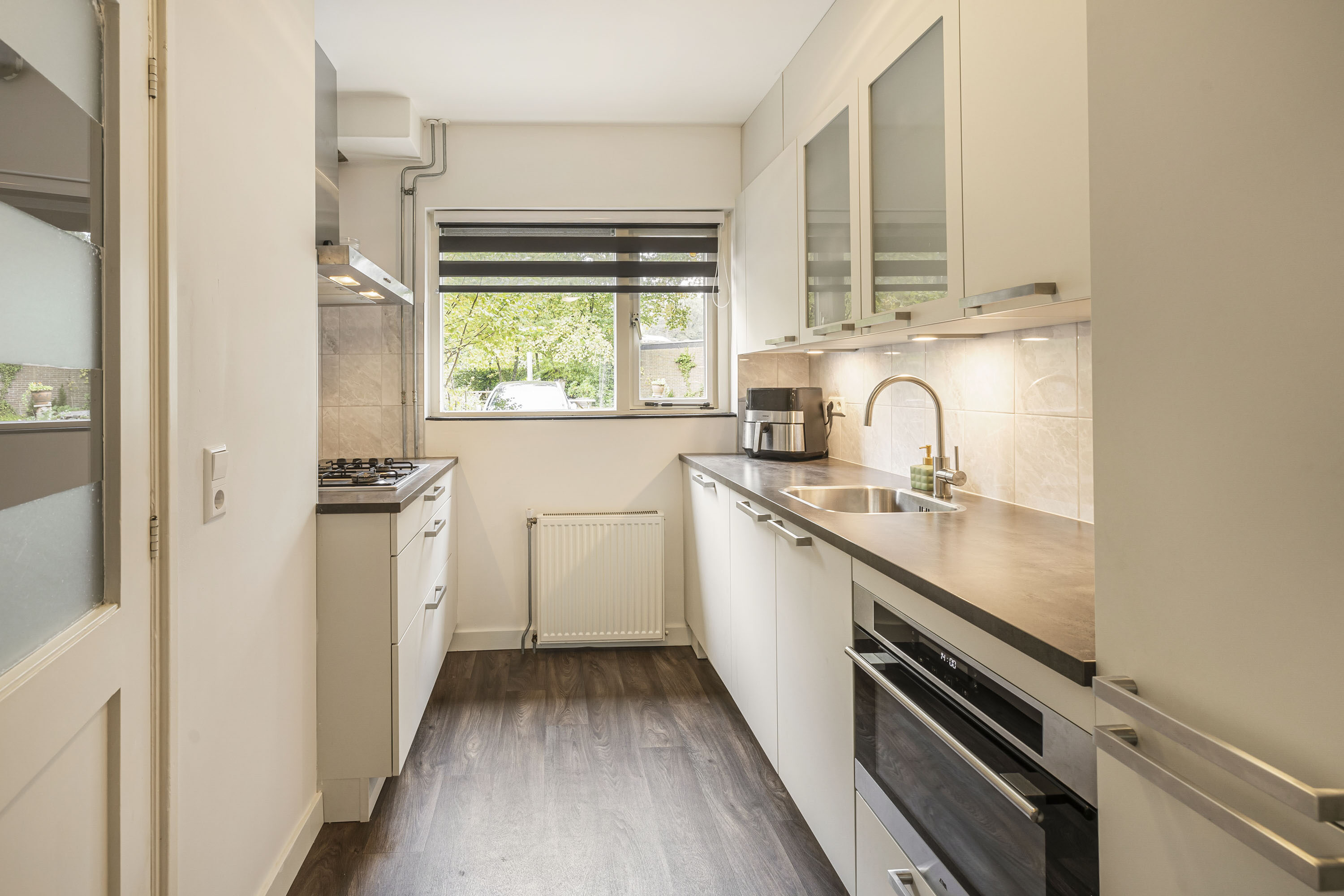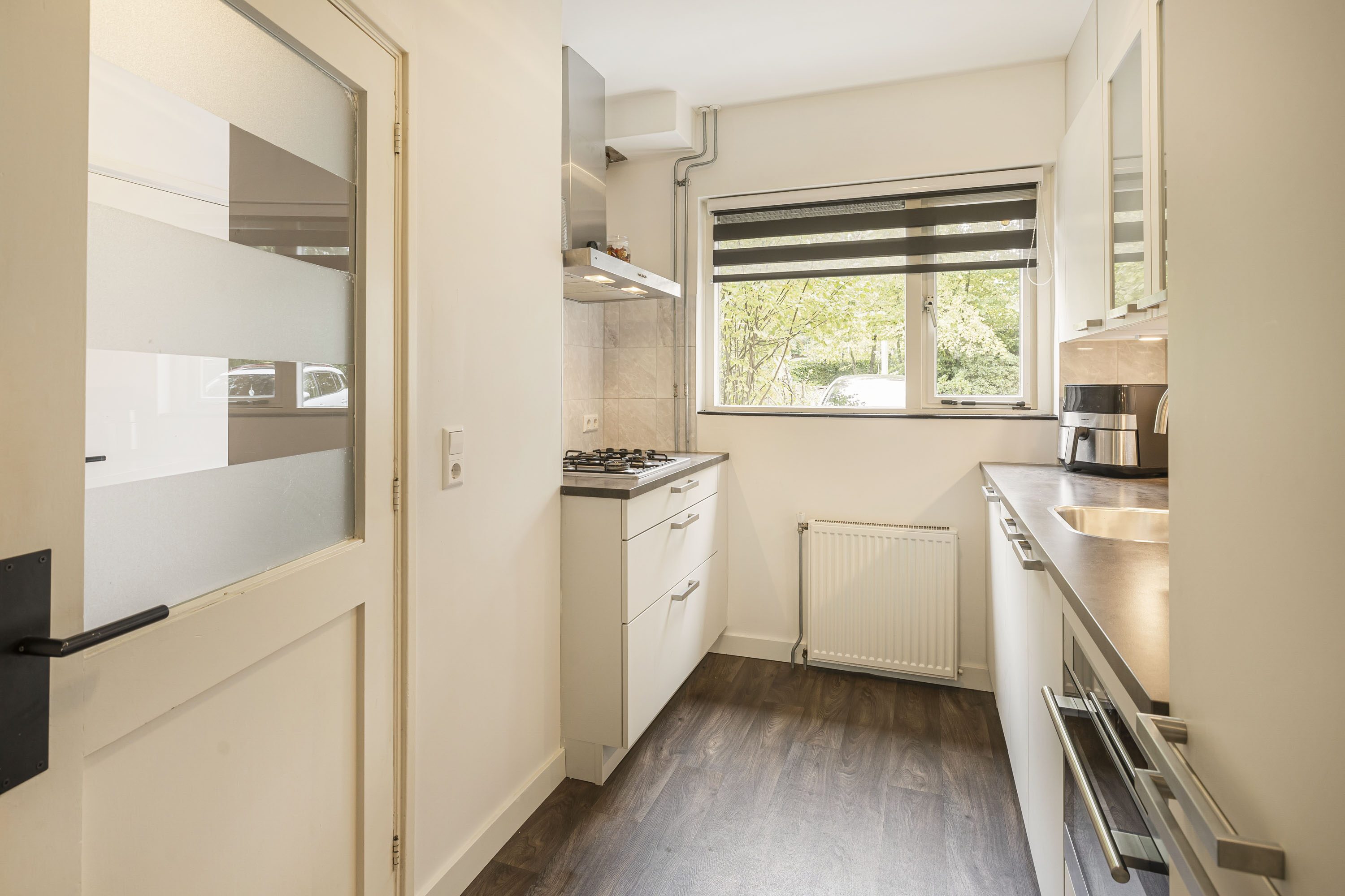 De ruime hal geeft toegang tot het toilet, praktische trapkast, vaste kast en de keuken. De keuken is opgesteld in lichte kleuropstelling met bovenkasten voor een extra bergruimte. De moderne keuken is vernieuwd in 2020 en voorzien van een kookplaat, oven-combimagnetron, koelvriescombinatie en vaatwasser. Vanuit de keuken is er een open verbinding met de woonkamer, die dankzij de ramen over fijn daglicht beschikt. Via een deur in de woonkamer stap je het balkon op, dat een fijne plek biedt om van de middagzon te genieten.