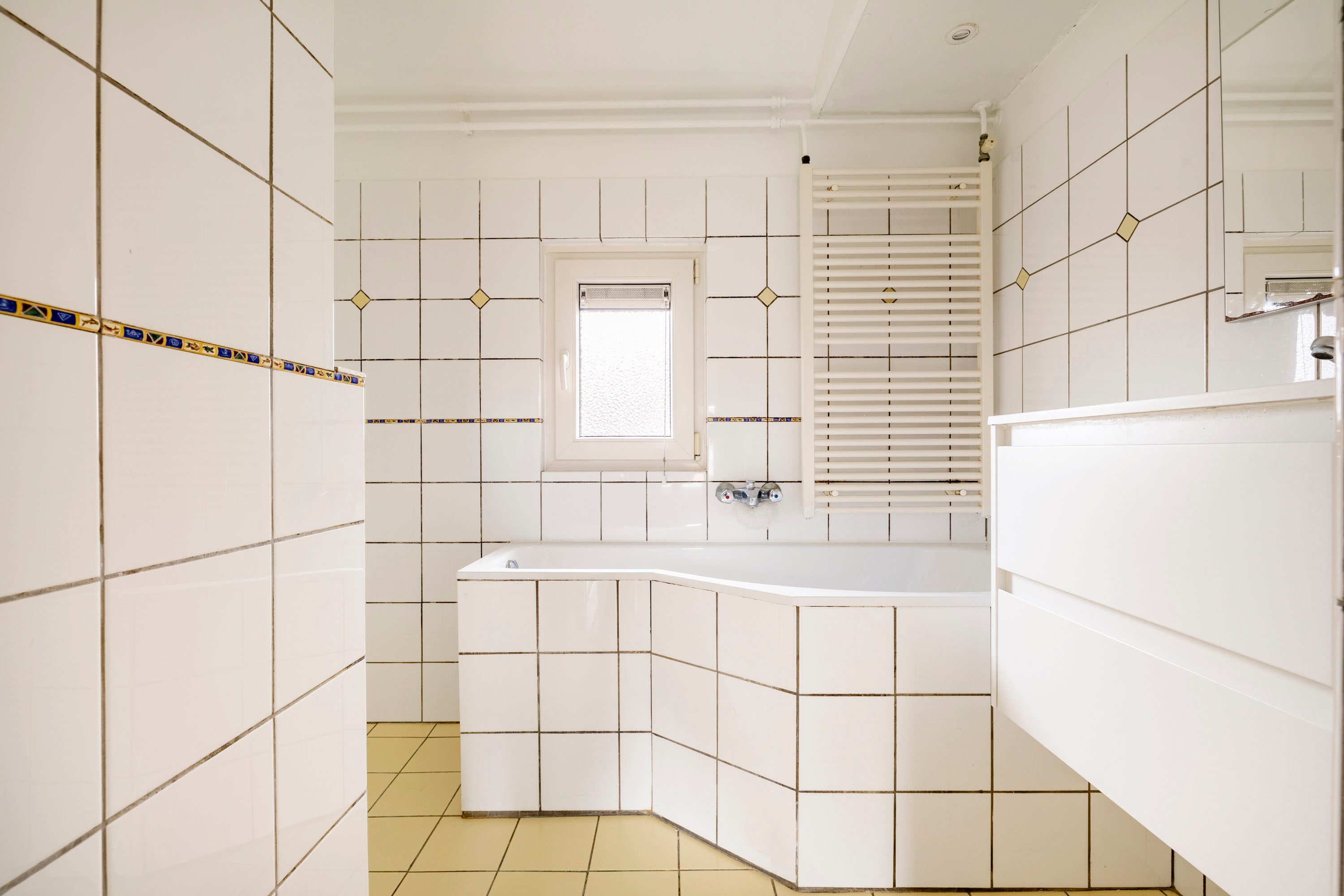De volledig betegelde badkamer is uitgerust met een ligbad, inloopdouche,, wastafel, spiegel met verlichting en designradiator.