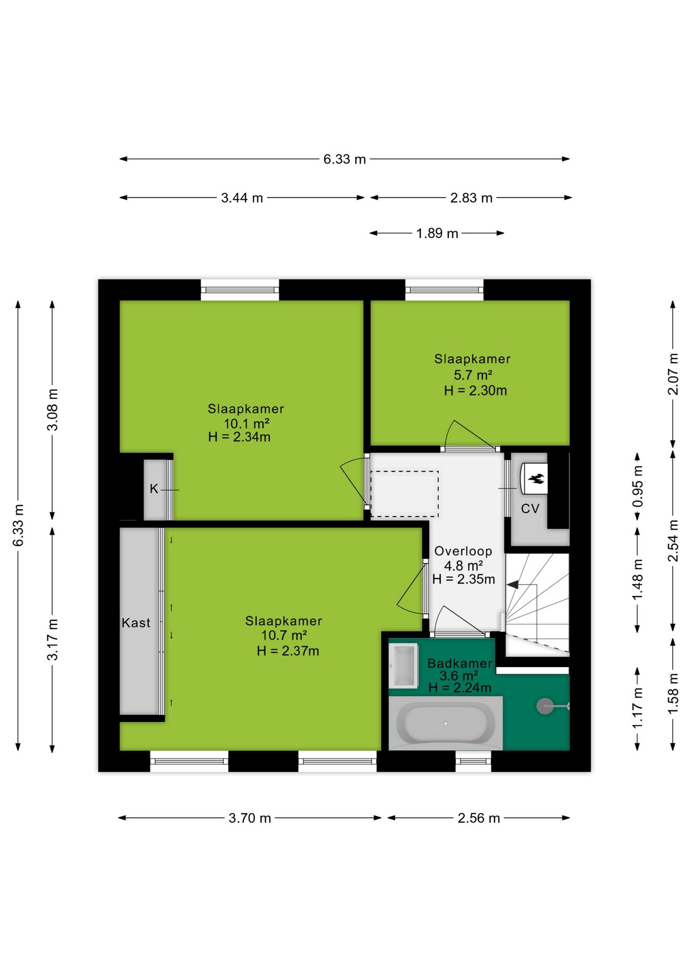 Op de eerste verdieping kom je op een overloop die toegang biedt tot verschillende vertrekken. Hier bevinden zich drie slaapkamers, de badkamer en de C.V.-ruimte.
