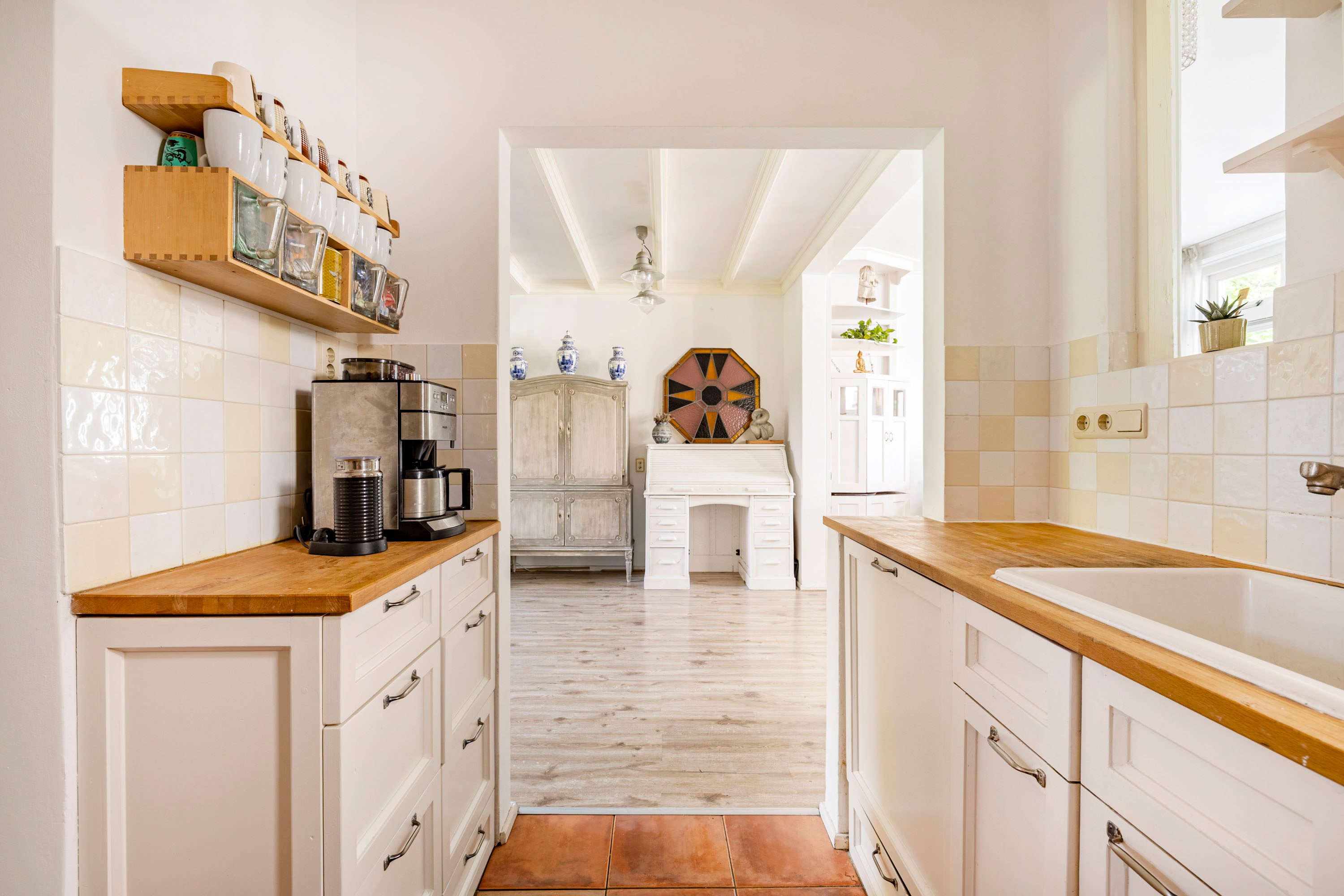 De half open keuken is uitgevoerd in een lichte kleurstelling. Het houten werkblad biedt een mooie uitstraling die past bij de woning. De keuken is volledig uitgerust met diverse inbouwapparatuur, te weten: