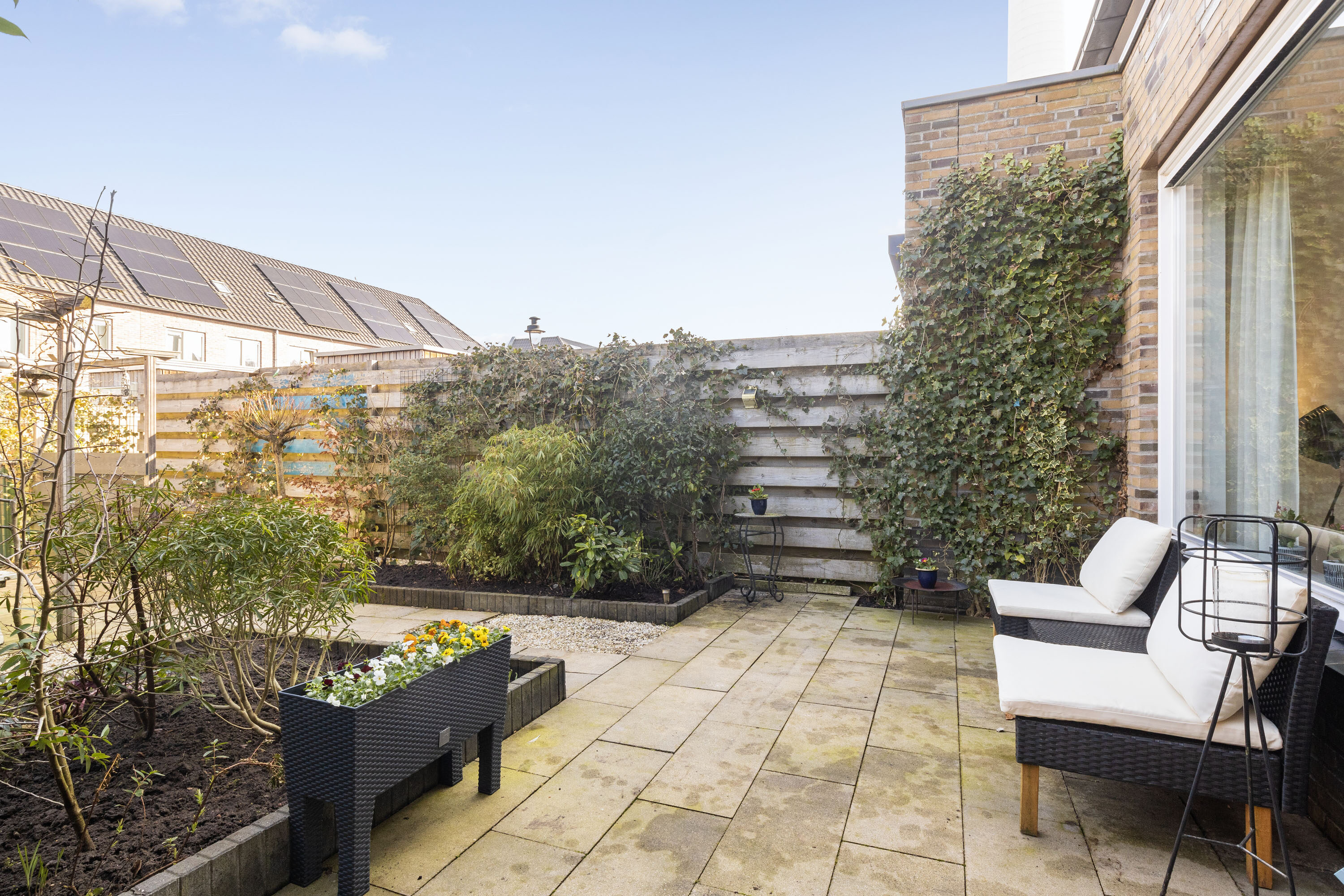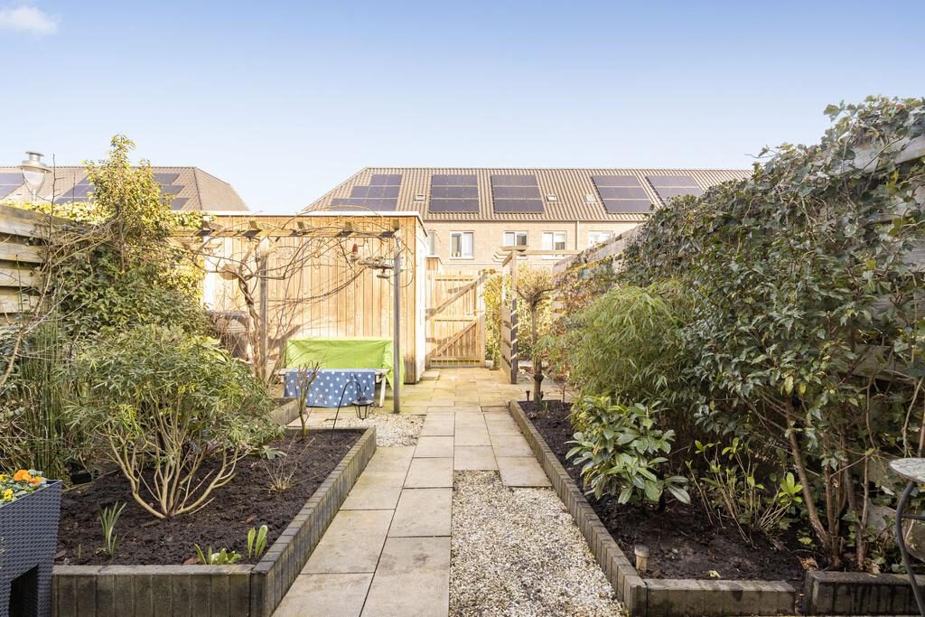 De achtertuin ligt op het noorden en is voorzien van sierstraatwerk, goede erfafscheidingen, diverse planten borders en een pergola.