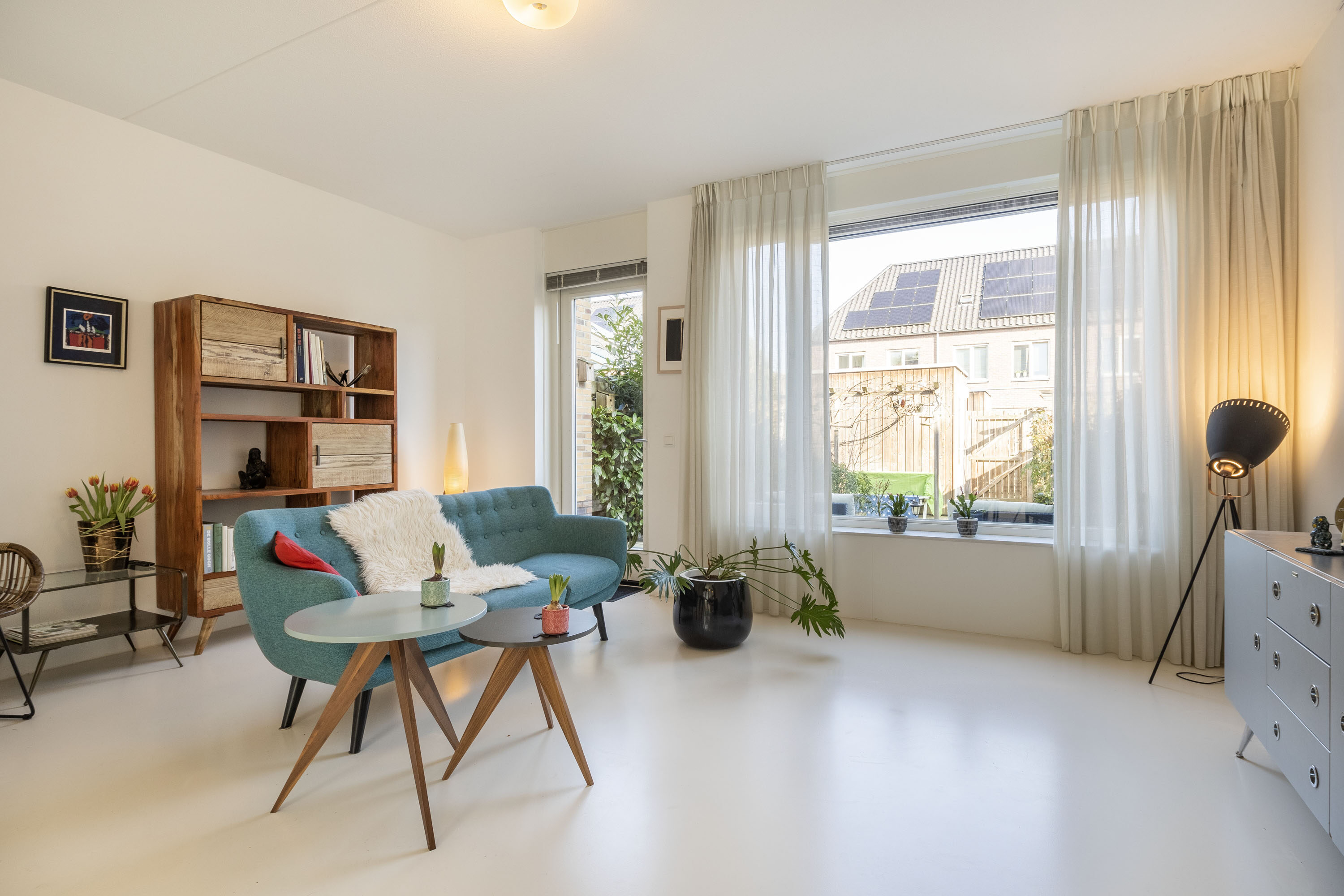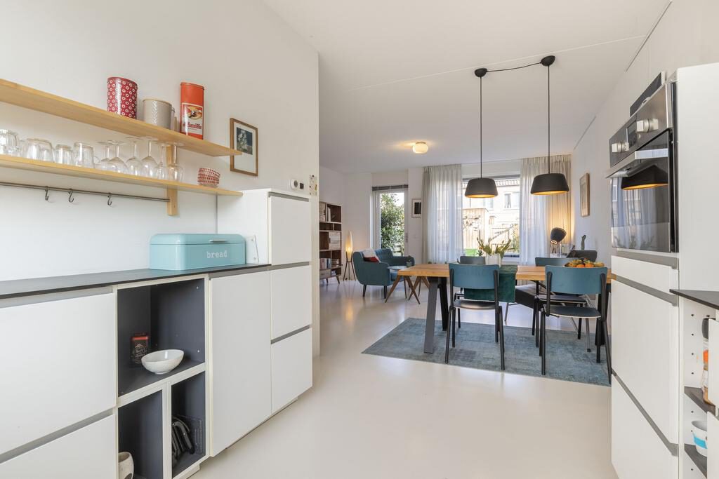 De heerlijke tuingerichte woonkamer beschikt over een kunststof pu-gietvloer en middels een deur is achtertuin gelegen op het noorden te bereiken. De gehele begane grondvloer is voorzien van comfortabele vloerverwarming. De trapkast in de woonkamer biedt extra opbergruimte.