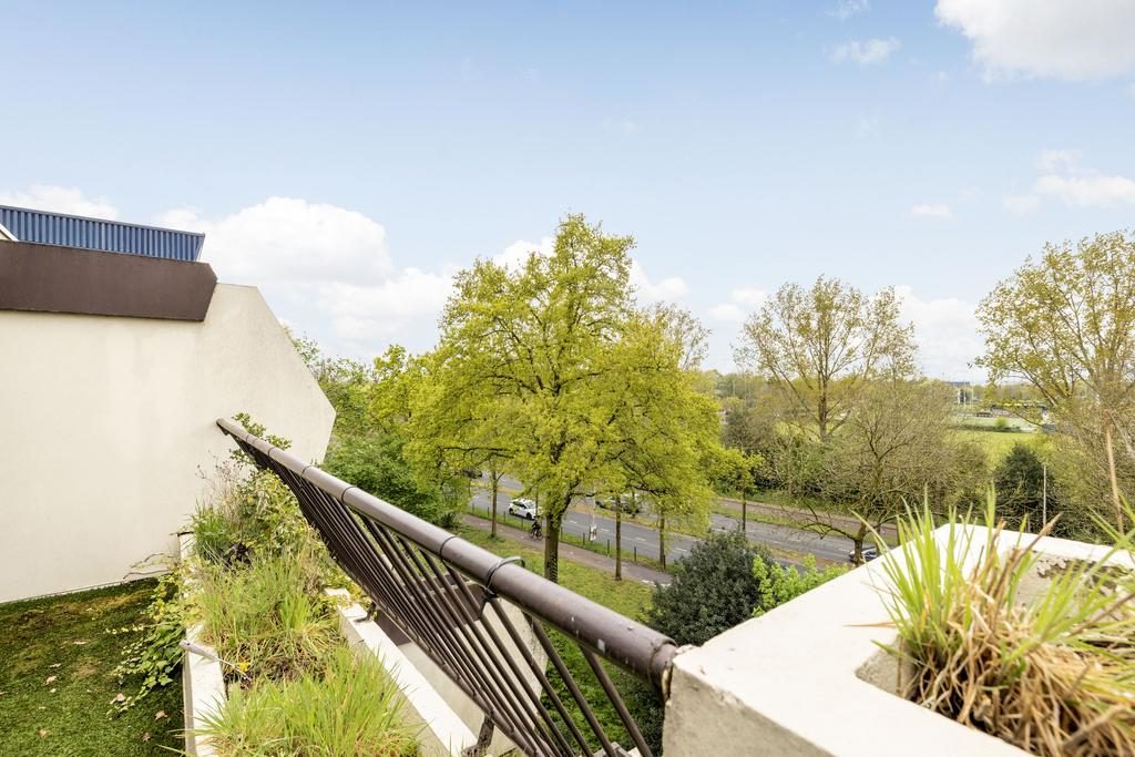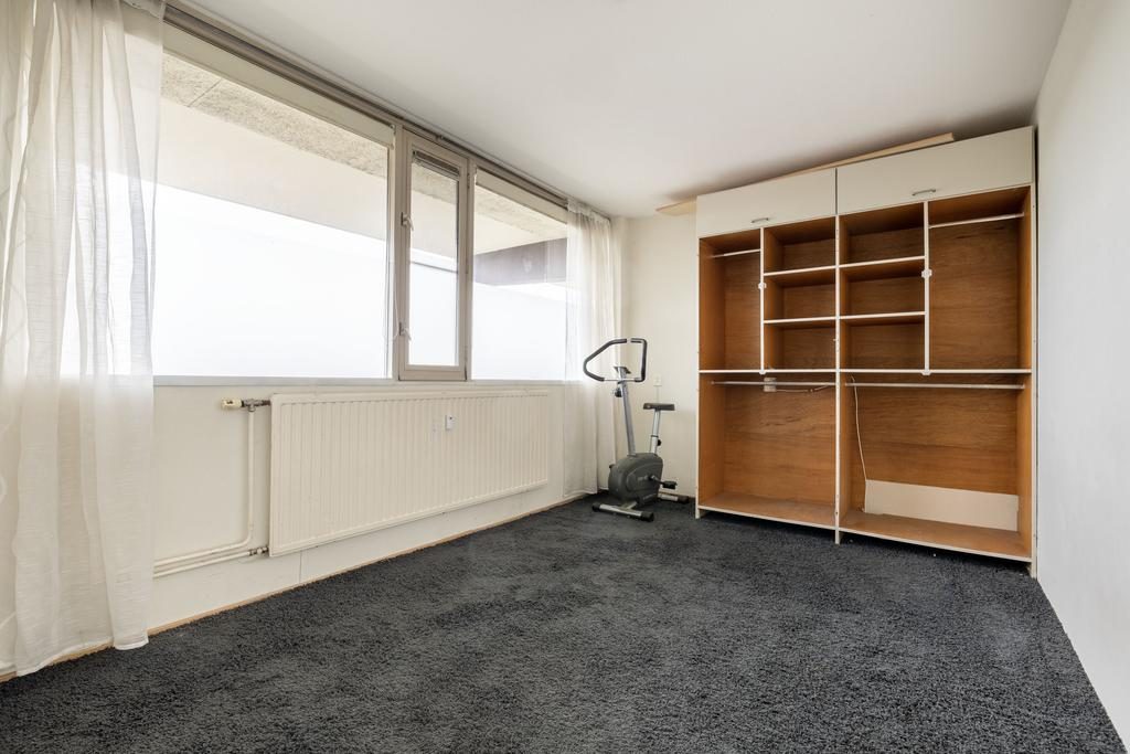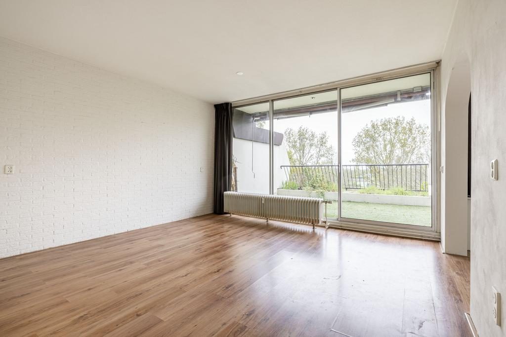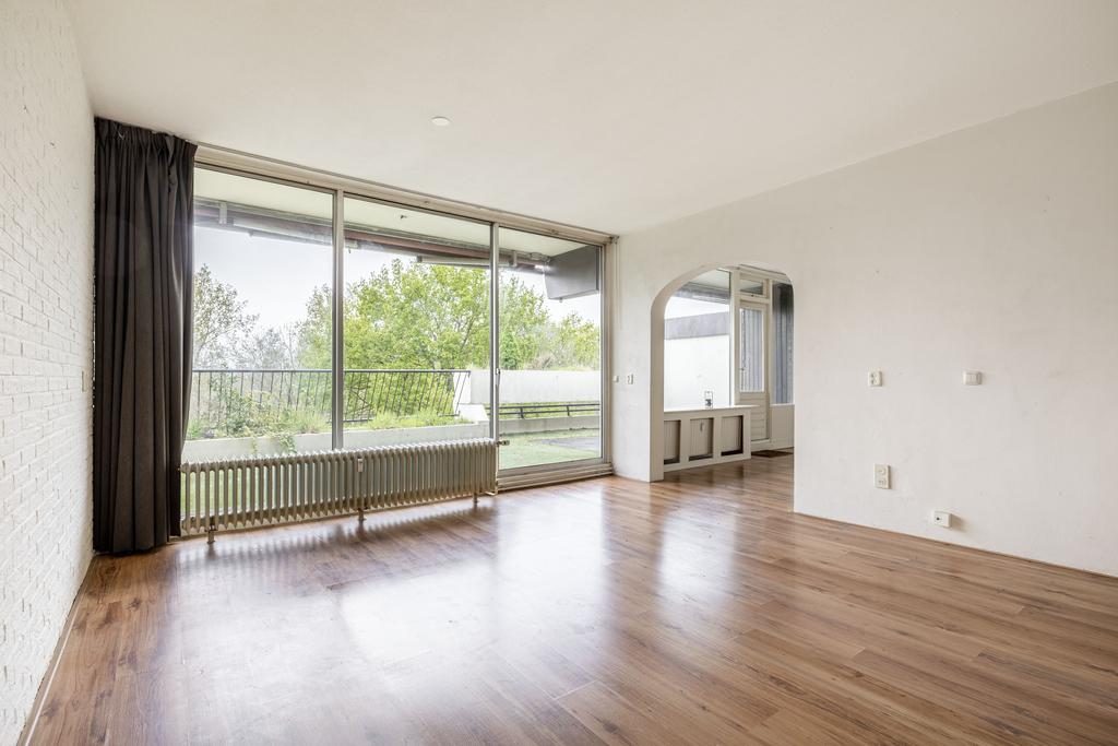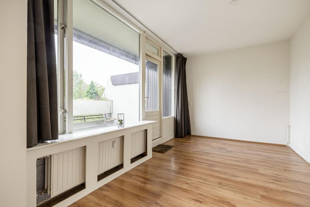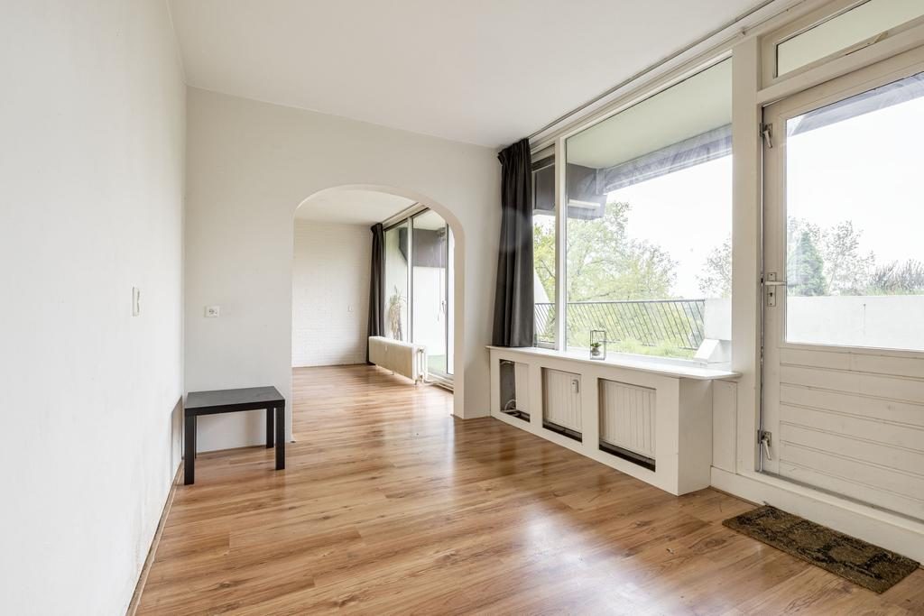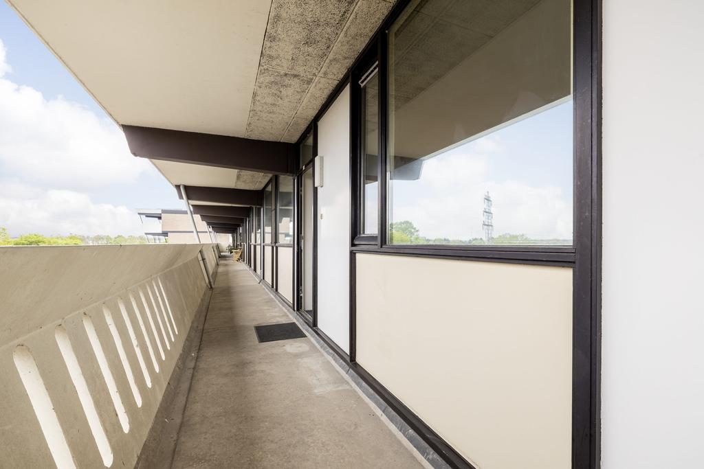 Aan de voorzijde van de woning bevindt zich de slaapkamer. Aangrenzend ligt de ruime woonkamer, die dankzij de grote raampartijen volop daglicht binnenlaat. Vanuit de woonkamer bereik je via een schuifdeur het balkon.