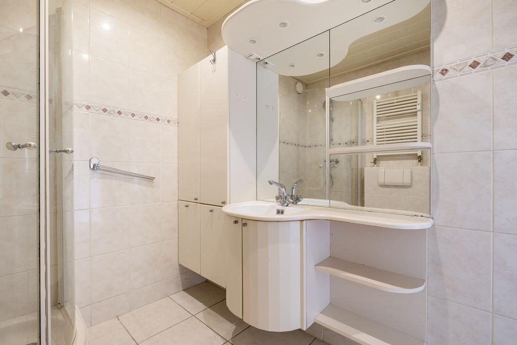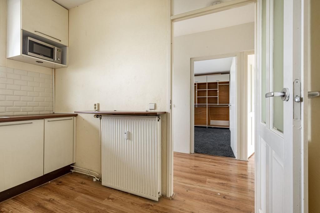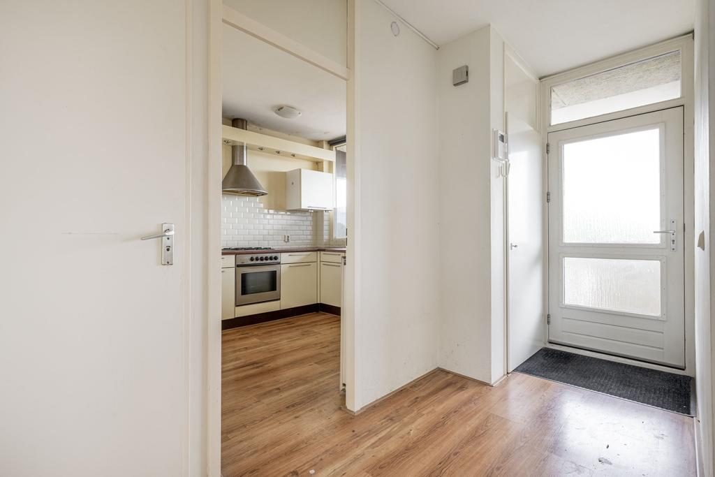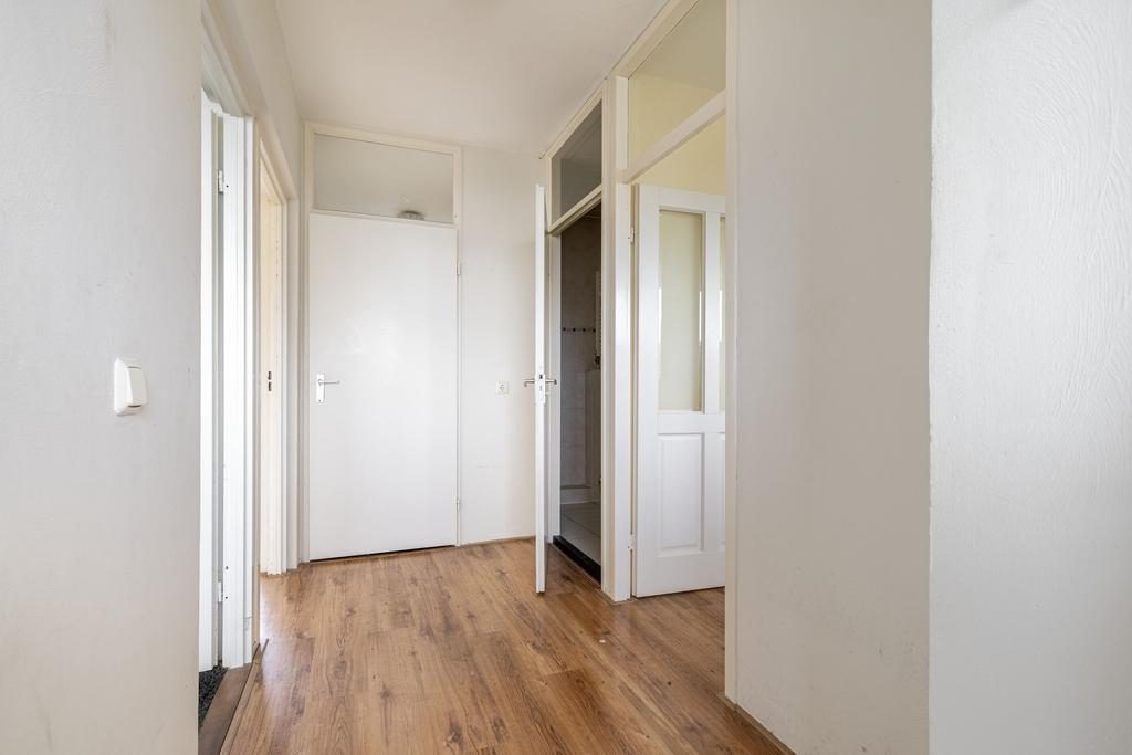Binnenkomst via de entree, waar de meterkast zich bevindt. Aan het einde van de hal is een praktische bergkast te vinden. De keuken is uitgevoerd in een lichte kleurstelling en voorzien van diverse inbouwapparatuur, waaronder een vierpits gasfornuis, afzuigkap, oven, vaatwasser, magnetron en een koel-vriescombinatie. De badkamer, volledig betegeld in een lichte kleur, beschikt over een toilet, wastafel, douche en designradiator.