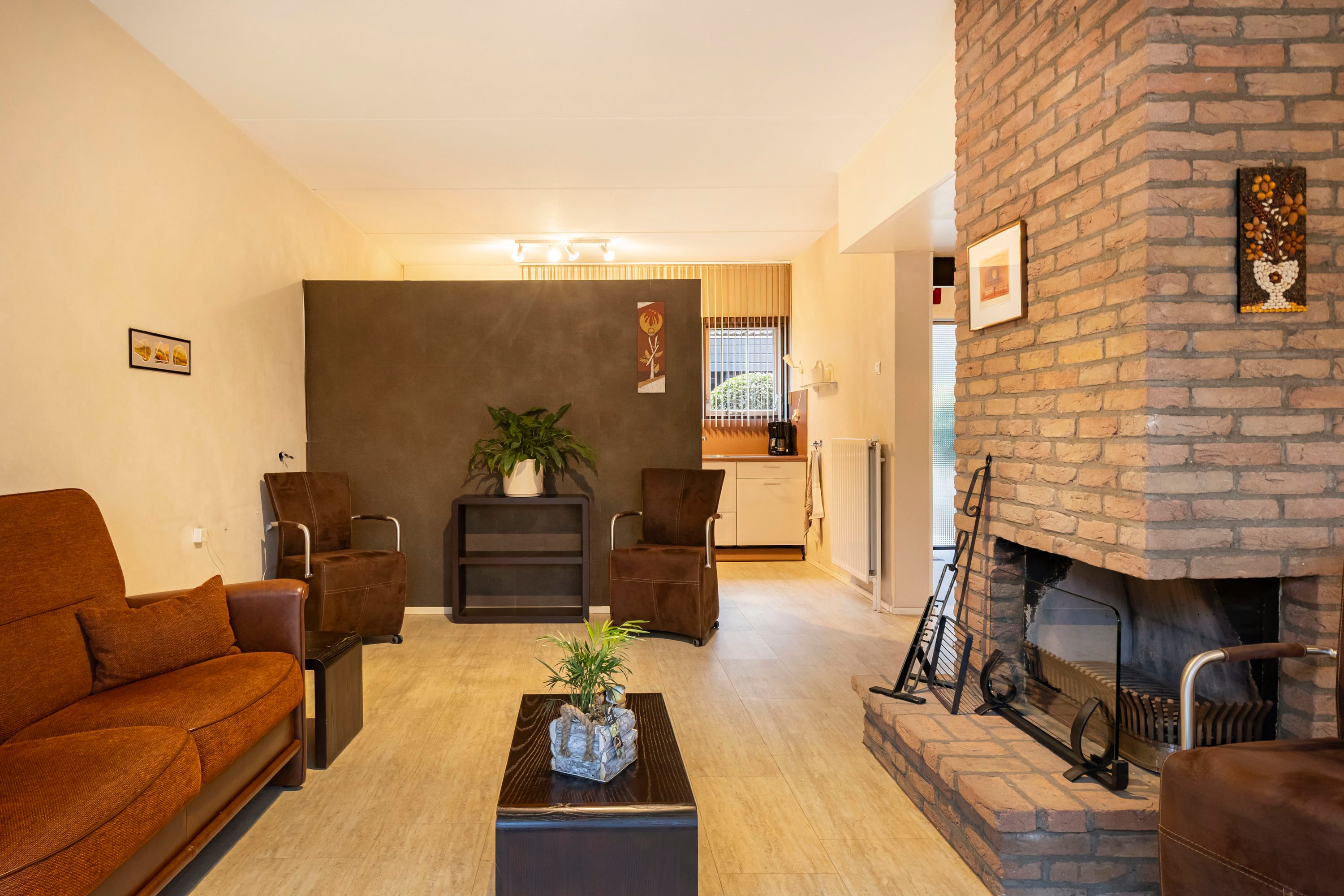 Via de brede hal betreed je de woning, waar zich een vide en de meterkast bevinden. Vanuit de hal stap je binnen in de lichte, ruim opgezette woonkamer. De sfeervolle open haard vormt het warme middelpunt van de ruimte. Via de openslaande deuren loop je direct de tuin in, wat zorgt voor een fijne verbinding tussen binnen en buiten.