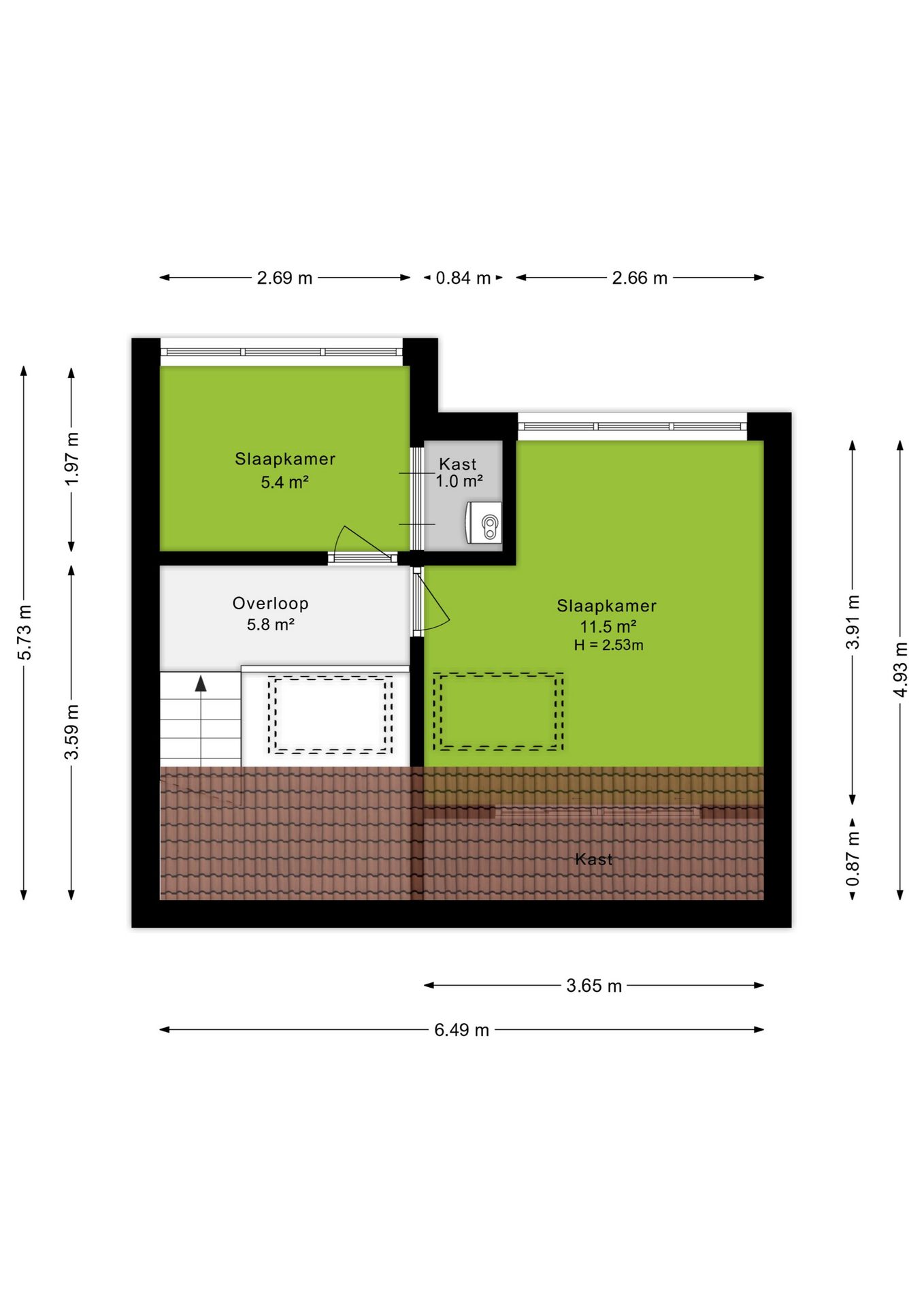 Op de eerste verdieping kom je via de overloop bij twee slaapkamers van circa 12 m² en 5 m², beide voorzien van prettig daglicht. In één van de slaapkamers is extra opbergruimte aanwezig achter een schot. In de kleinste slaapkamer bevindt zich een vaste kast met de cv-ketel. De eerste verdieping is redelijk eenvoudig te vergroten middels een uitbouw op het platte dak van de begane grond. In de wijk zijn hier meerdere voorbeelden van.