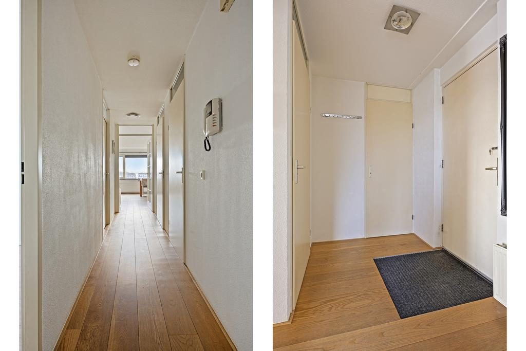 Bij binnenkomst in het appartement betreed je de entree/hal, waar je direct de meterkast en ruimte voor de kapstok treft. Vanuit deze hal heb je toegang tot alle vertrekken in het appartement. Zowel de hal als de woonkamer zijn voorzien van een eikenhouten vloer. De ruime woonkamer is praktisch ingedeeld en heeft een hoekligging waardoor er een fijn uitzicht op de omgeving is. Dankzij de grote raampartij is er ook een fijn natuurlijk daglicht in de woonkamer tevens beschikt de raampartij over screens. Via de deur is er toegang naar het balkon, waar je heerlijk kunt genieten van de buitenlucht. De open keuken is uitgerust met een eenvoudig keukenblok voorzien van divers inbouwapparatuur zoals: