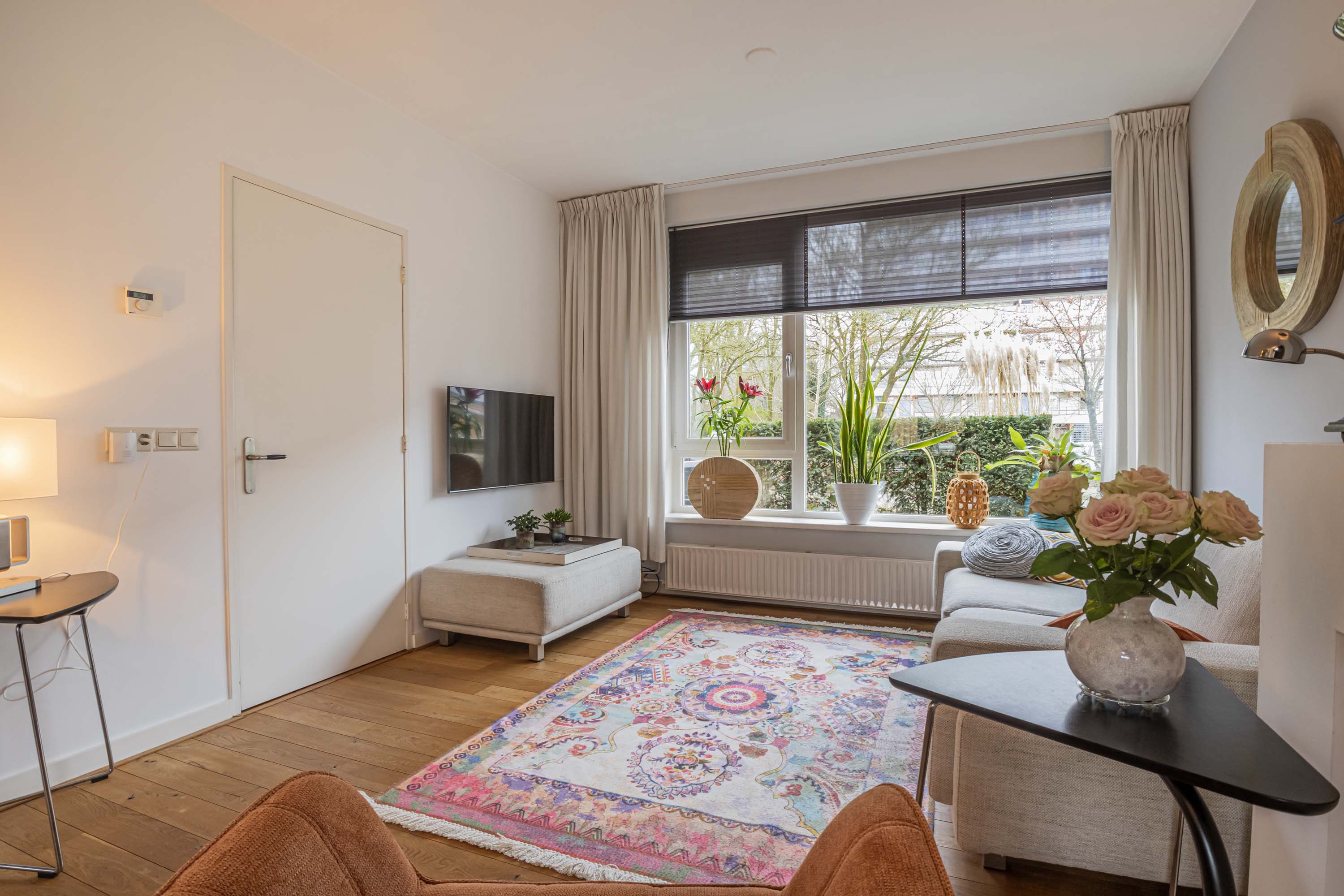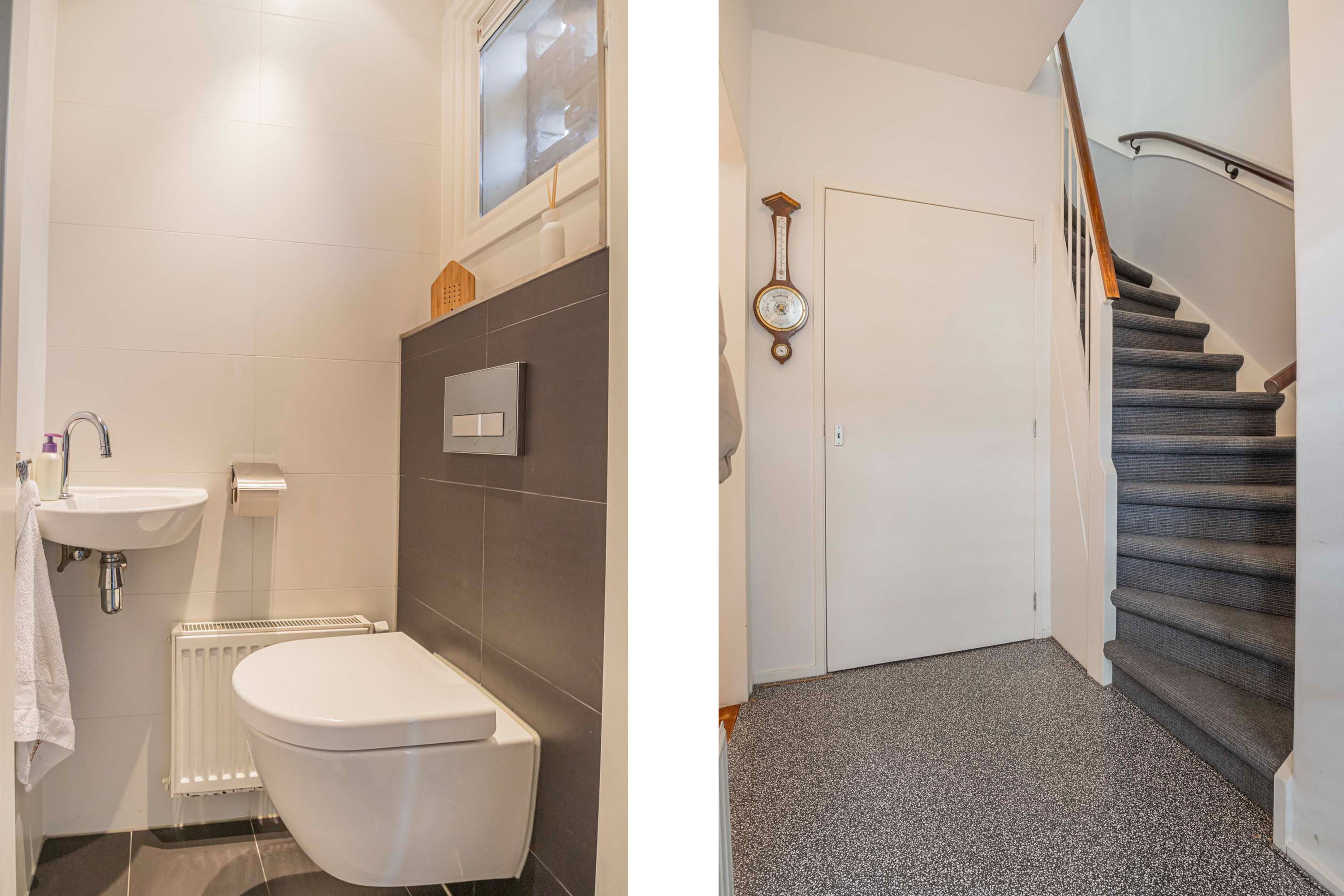 Via de hal kom je bij de entree, welke voorzien is van vinyl vloer afwerking, met trapkast, garderobe, moderne toiletruimte met wandcloset en een fonteintje en voorzien van lichte wandtegels met antraciet accenten, trapopgang naar de eerste verdieping en toegang tot de woonkamer. De ruime en enorm lichte woonkamer is aan de achterzijde uitgebouwd, uitgerust met een lichtkoepel, strakke wandafwerking en voorzien van een eiken houten vloer. In de woonkamer is de schouw/schoorsteen nog aanwezig echter is deze niet meer in gebruik.