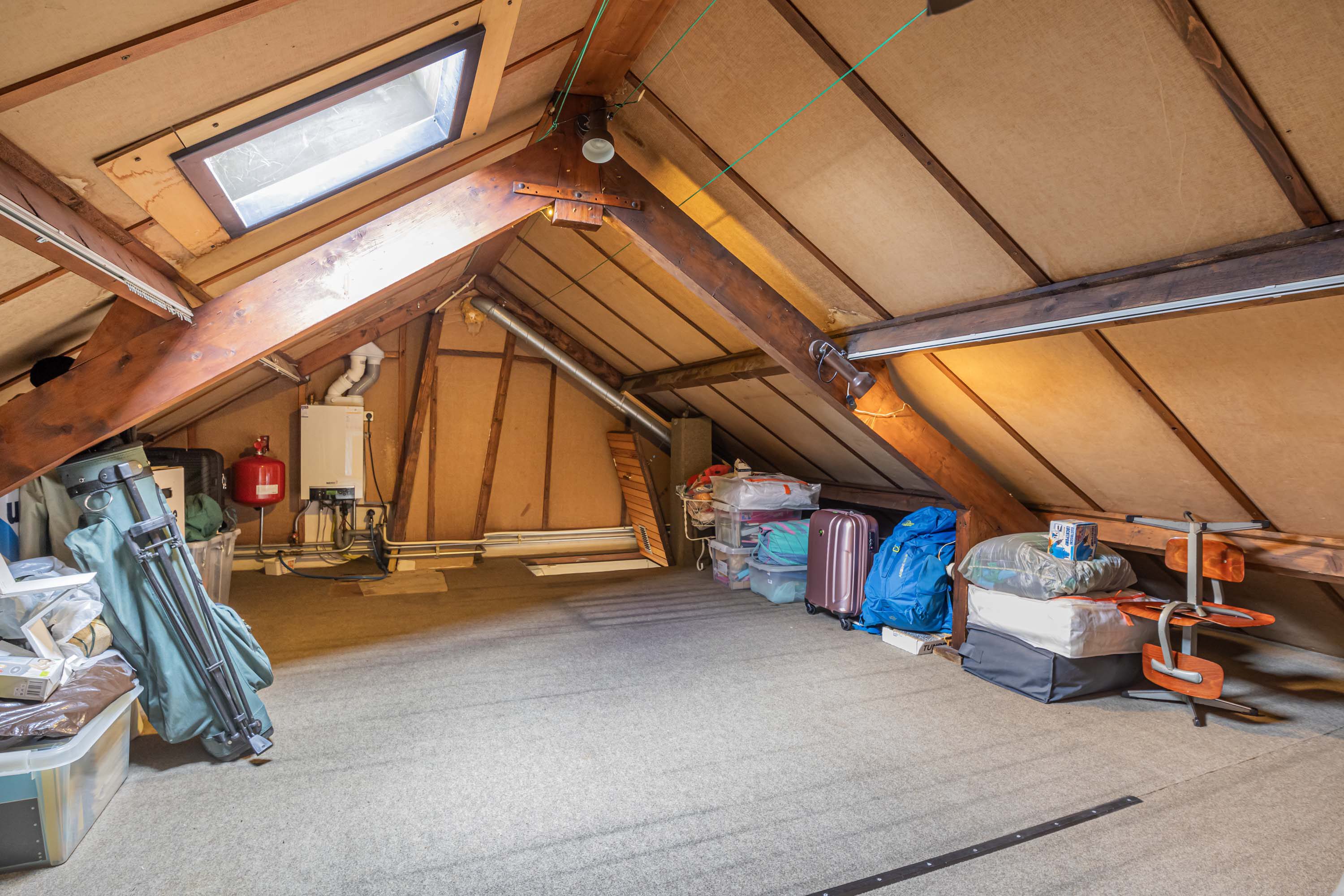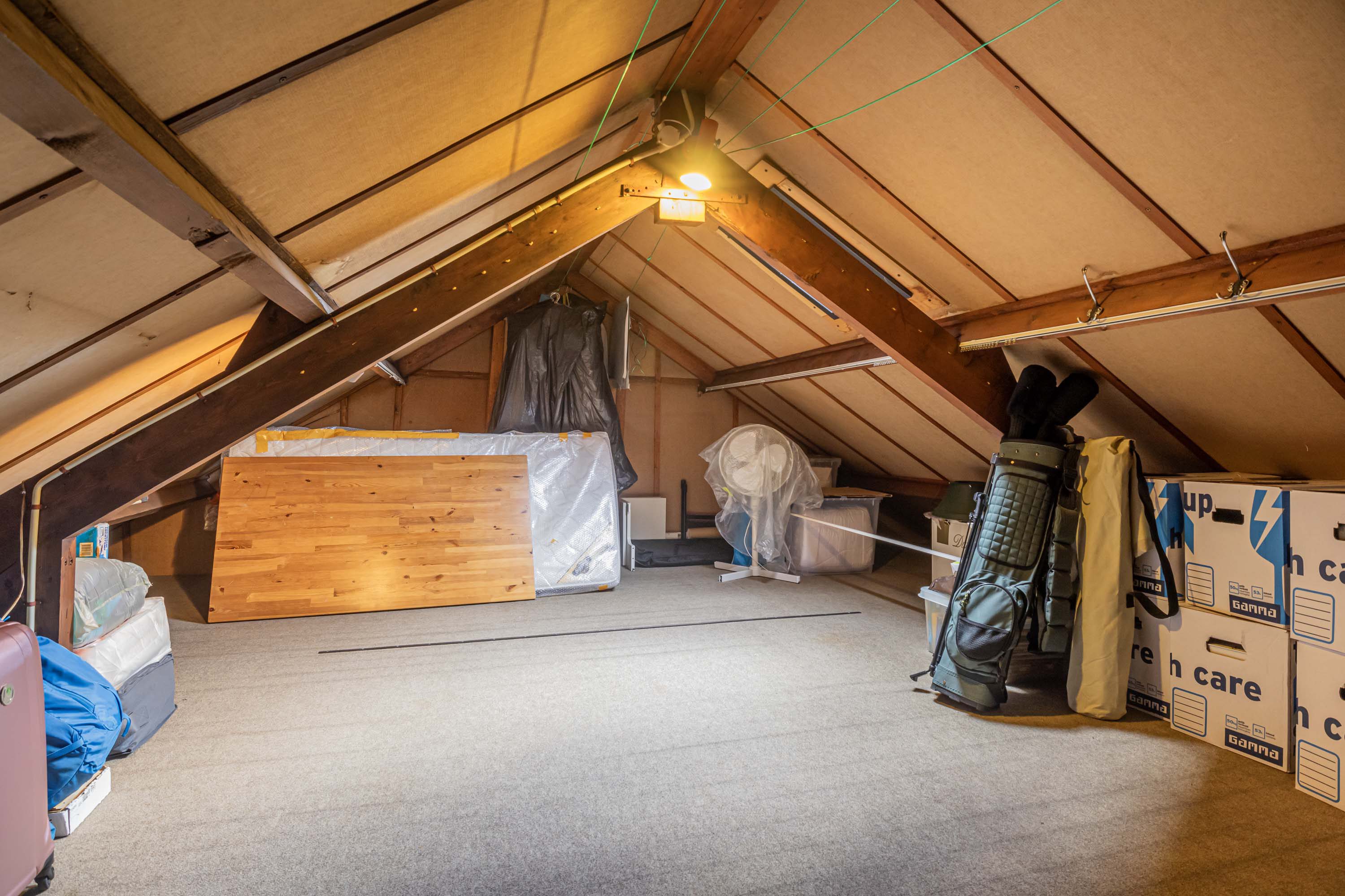 De open zolderverdieping is erg handig voor het opbergen van al je spullen. Hier is ook de C.V.-ketel opstelling gevestigd.