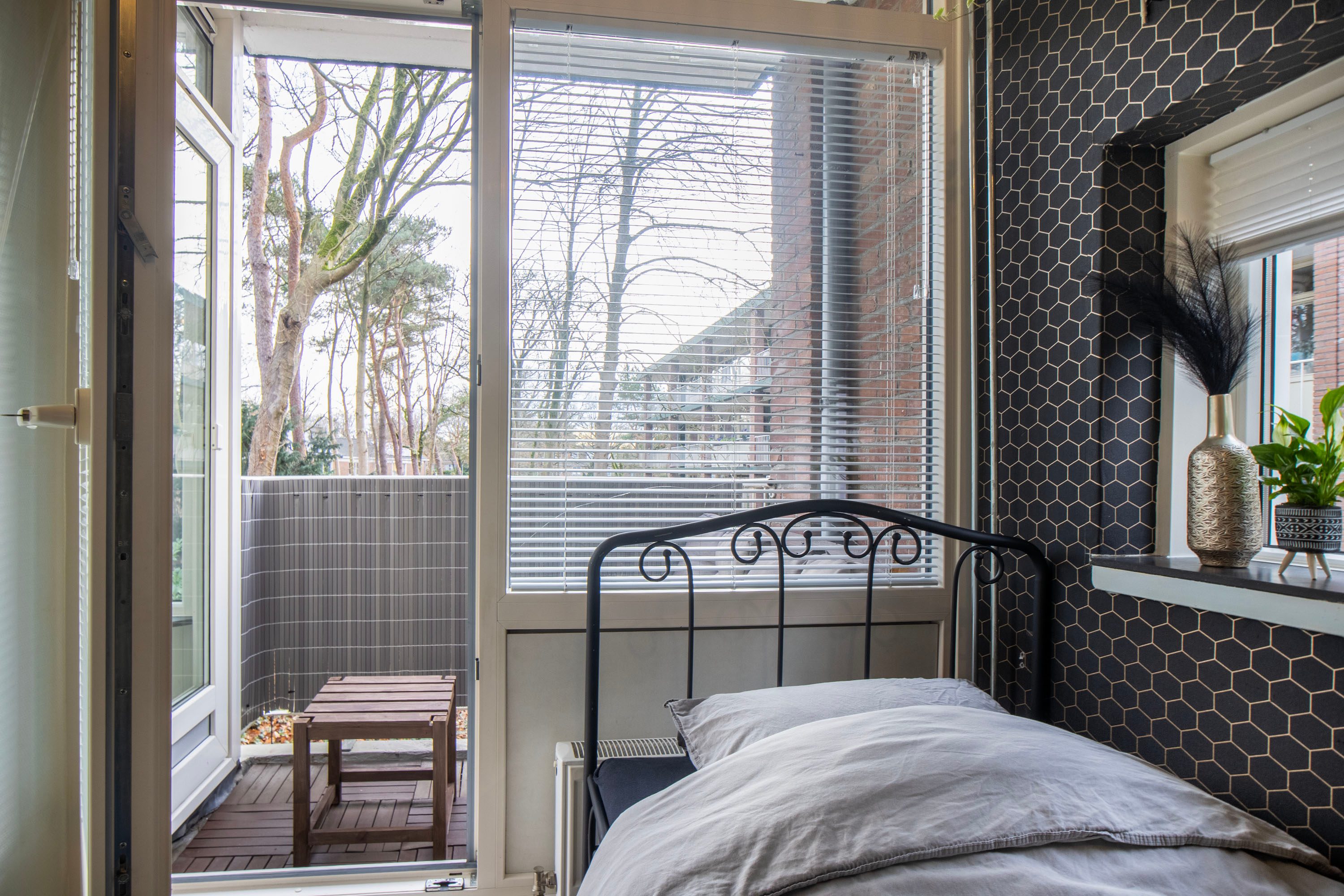 Het appartement beschikt over twee slaapkamers van circa 12 m² en 8 m². De grootste slaapkamer biedt voldoende ruimte voor een royale kast. De kleinere slaapkamer heeft directe toegang tot het balkon en is ook uitstekend te gebruiken als thuiswerkplek. In deze kamer bevindt zich tevens de wasmachineaansluiting.