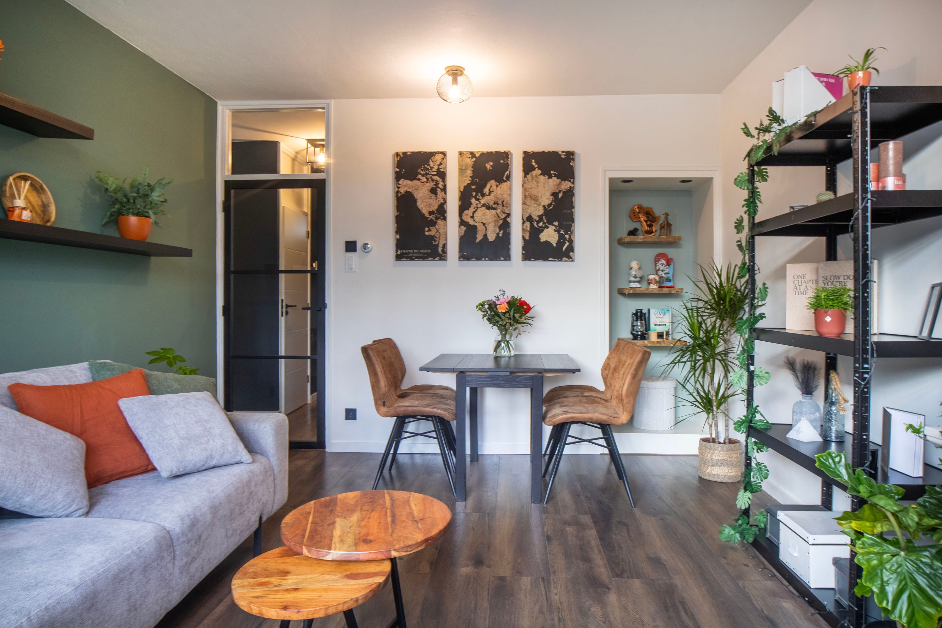 Via de entree heb je toegang tot alle vertrekken. De woonkamer is licht en gezellig ingericht, met ruimte voor zowel een zithoek als een eethoek. Vanuit de zithoek heb je een vrij uitzicht, wat zorgt voor een prettig en open gevoel. Een leuk detail is de praktische inbouwkast.