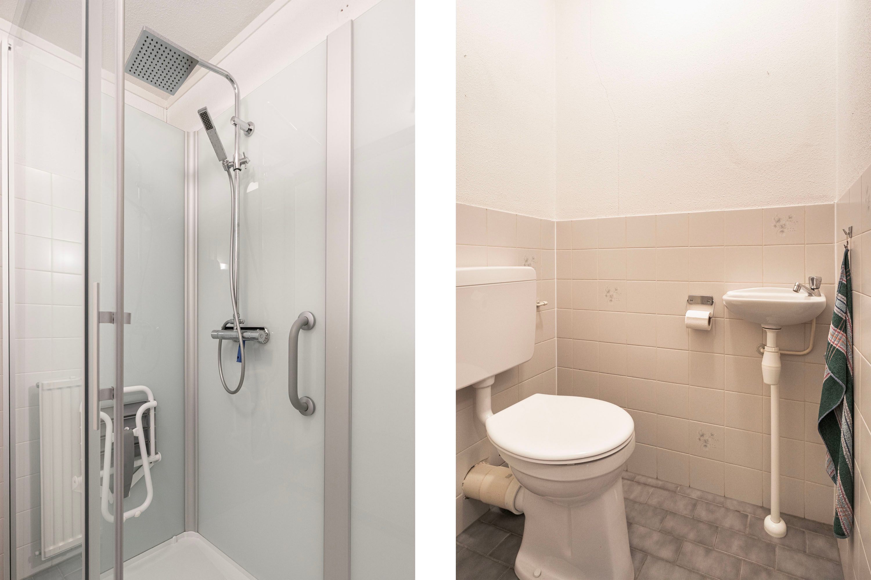 De twee slaapkamers van circa 19 m² en 15 m² zijn beide voorzien van daglicht en natuurlijke ventilatie. De grootste slaapkamer beschikt over een vaste kastenwand. De badkamer is ingericht met een ruime inloopdouche en wastafel, en er is een separaat toilet aanwezig. In de tweede berging bevindt zich de cv-ketel.