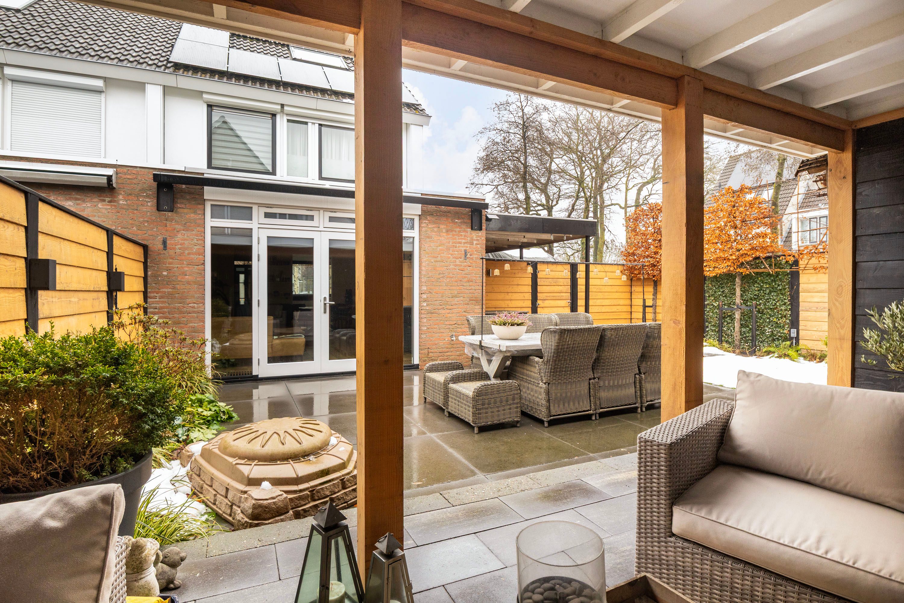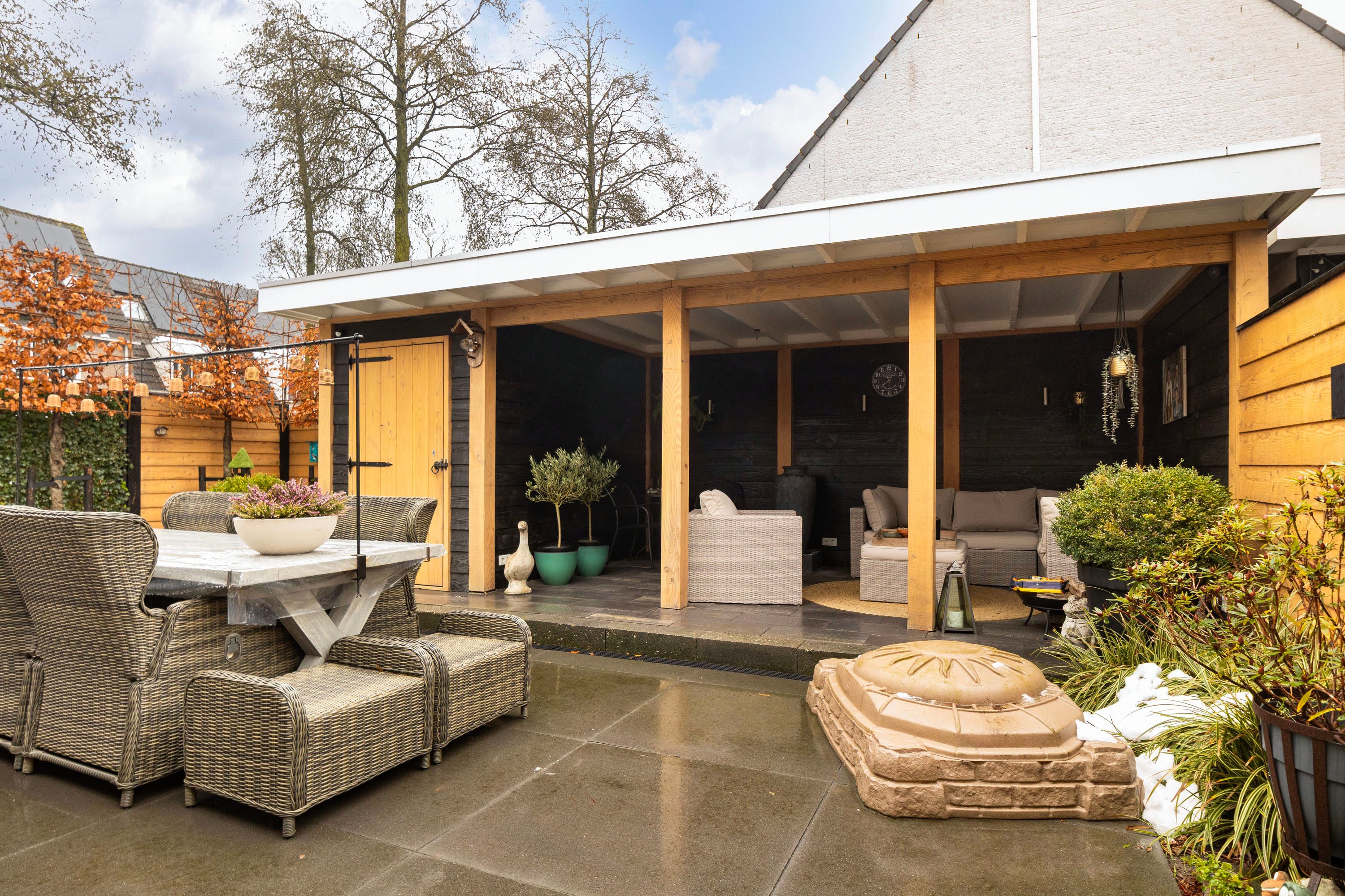 De achtertuin ligt gunstig op het zuidoosten en biedt volop mogelijkheden om van het buitenleven te genieten. Dankzij het zonnescherm en de overkapping is er altijd een prettige plek, zowel in de zon als in de schaduw. Aan de overkapping grenst bovendien een extra berging, ideaal voor het opbergen van tuinspullen.