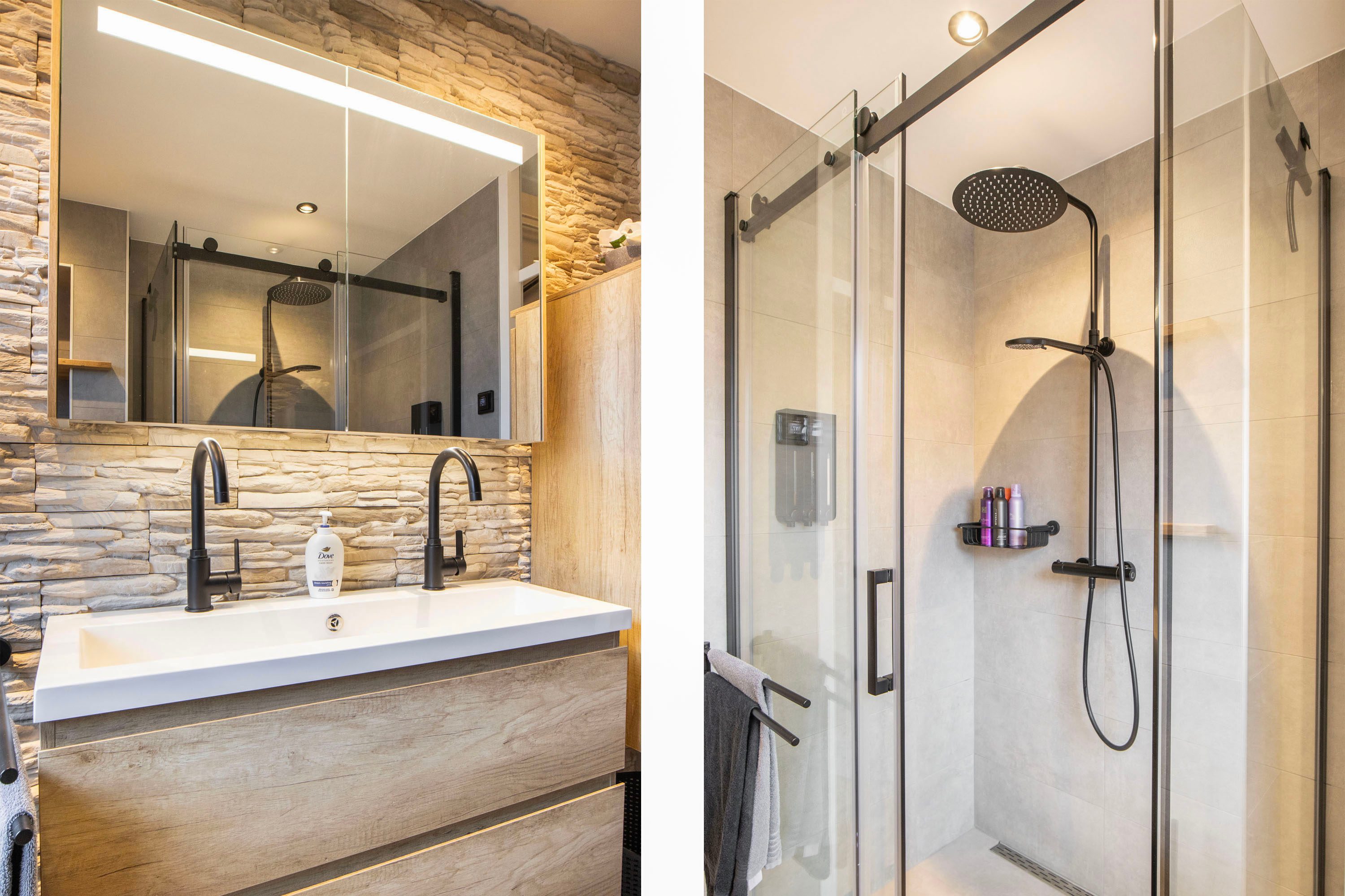 De moderne badkamer is strak uitgevoerd en voorzien van een douche, toilet en een dubbele wastafel met meubel. De vloerverwarming zorgt hier voor extra comfort.