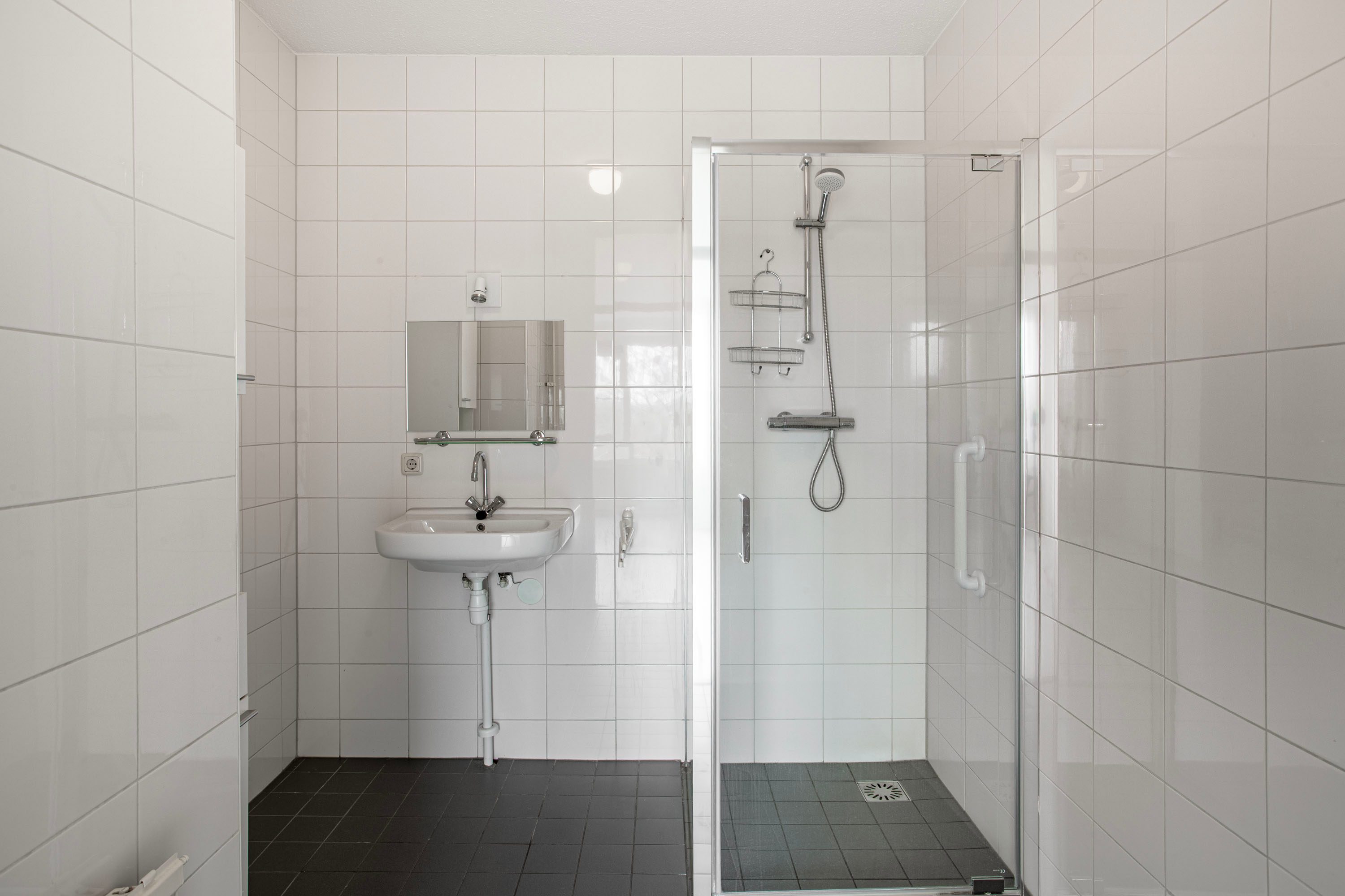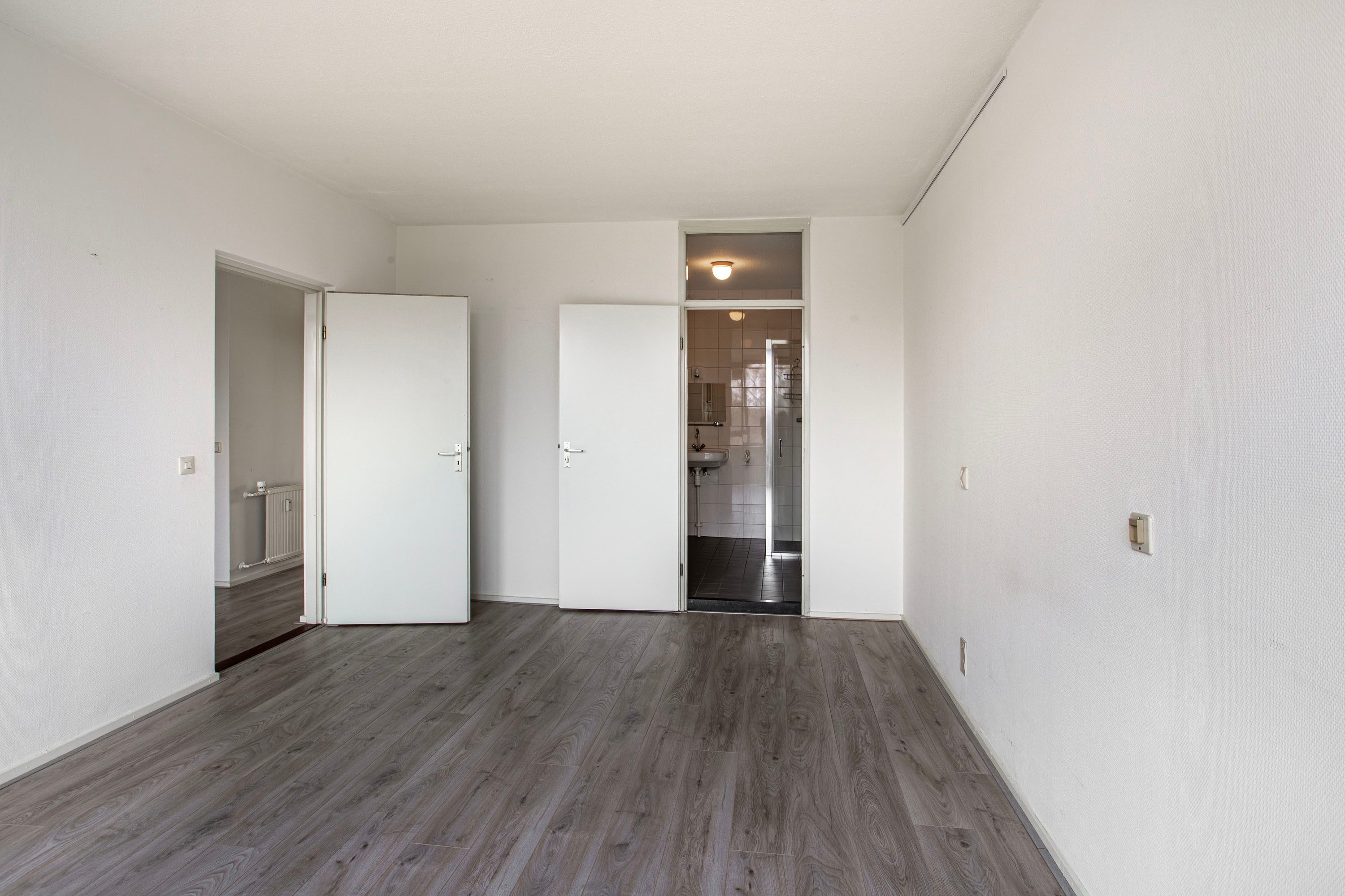 Vanuit de entree zijn de twee slaapkamers bereikbaar. De grote hoofdslaapkamer van circa 19 m² beschikt over grote raampartijen met kunststof kozijnen, wat zorgt voor veel lichtinval. Vanuit deze kamer is er directe toegang tot de badkamer, wat extra gemak biedt. De badkamer is volledig betegeld, onderhoudsvriendelijk en voorzien van een douche met cabine en een wastafel.