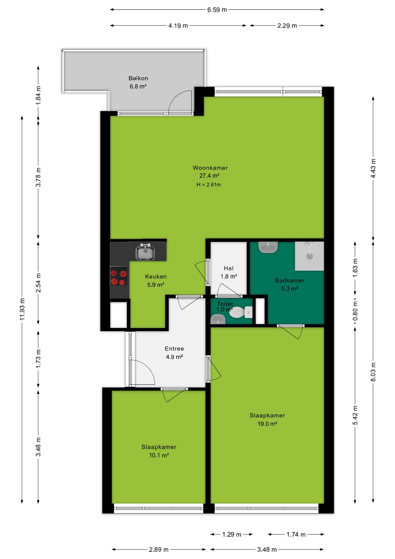 Bij binnenkomst in het appartement kom je in de entree, die toegang biedt tot de woonkamer en de twee slaapkamers. De woonkamer is direct opvallend door de prettige lichtinval en het ruimtelijke gevoel. Met een oppervlakte van ruim 27 m² en grote raampartijen is dit een heerlijke plek om te verblijven. Er is voldoende ruimte voor een comfortabele zithoek én een gezellige eethoek. Zo kun je bijvoorbeeld een lange eettafel langs de keukenwand plaatsen, ideaal om uitgebreid te tafelen met familie of vrienden, terwijl aan de andere zijde ruimte is voor een fijne bank of fauteuil.