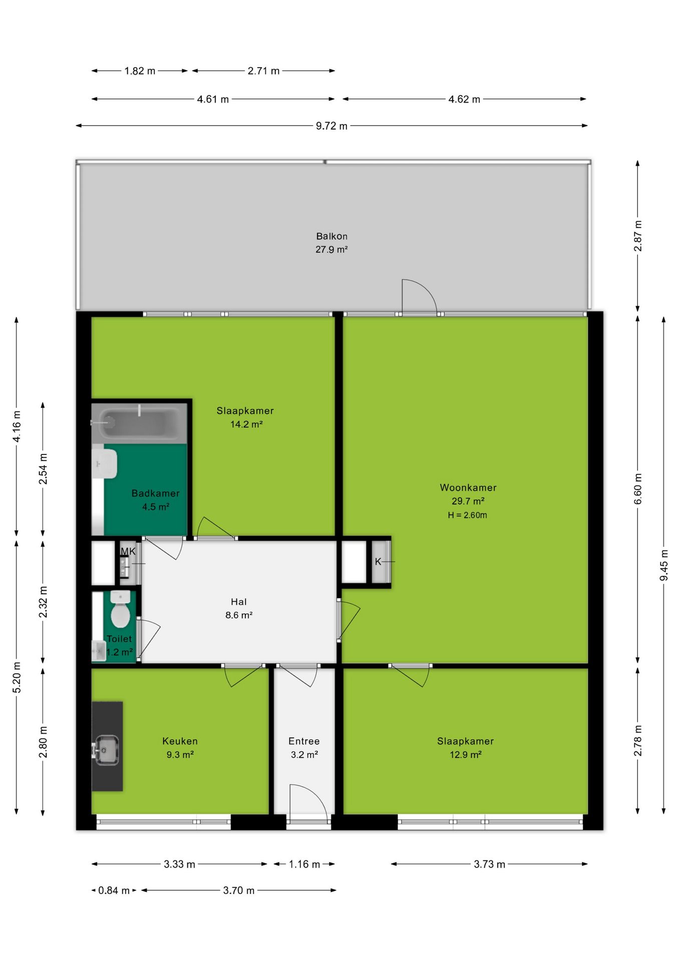 Het appartement beschikt over twee ruime slaapkamers van respectievelijk 13 m² en 14 m². De slaapkamer aan de balkonzijde is voorzien van grote ramen en biedt een mooi, vrij uitzicht. De tweede slaapkamer, gelegen aan de galerijzijde, is ideaal als rustige werk- of logeerkamer. Beide kamers zijn keurig afgewerkt en bieden volop indelingsmogelijkheden.
