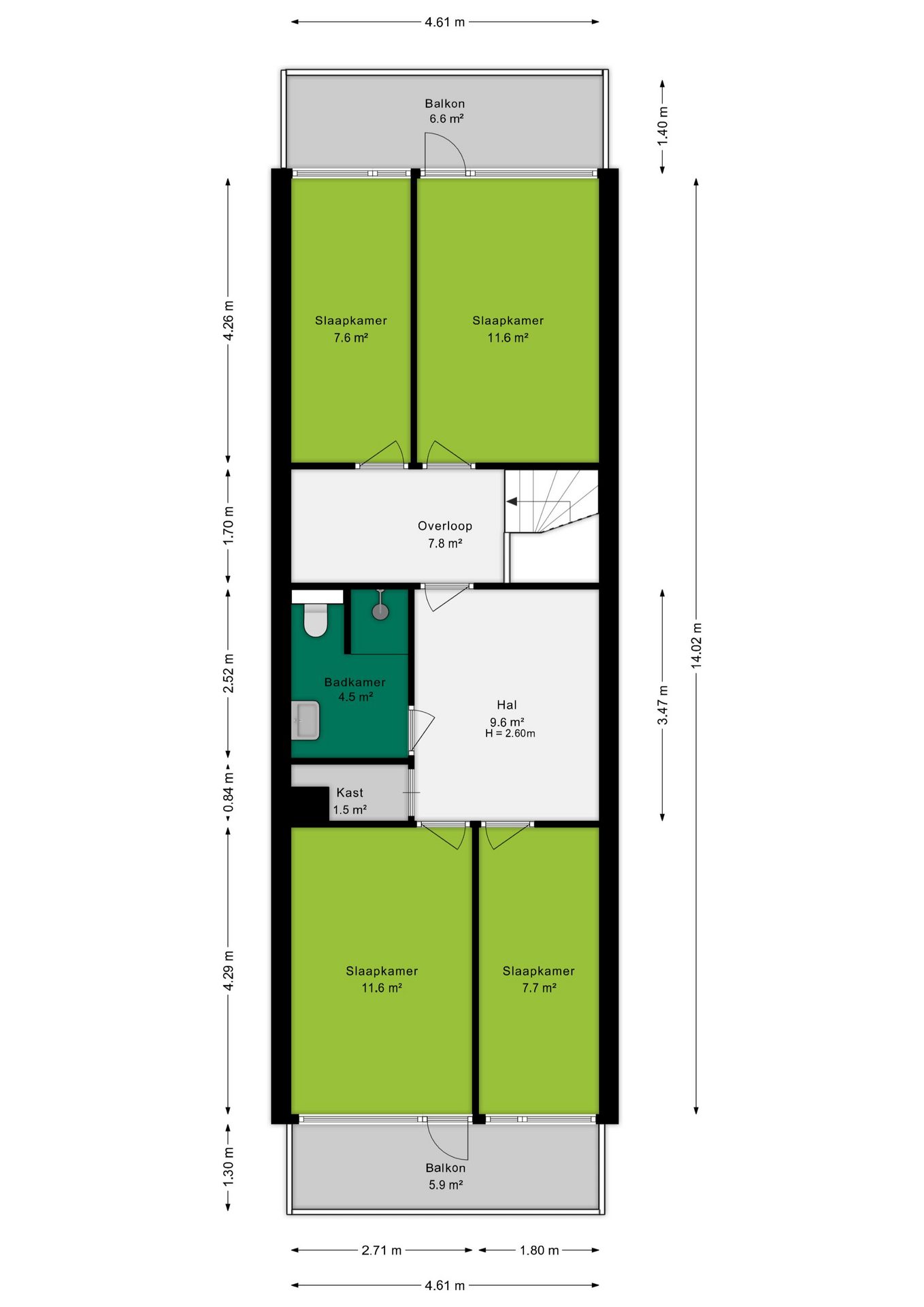 - Twee slaapkamers van ca. 12 m², beide met toegang tot een eigen balkon