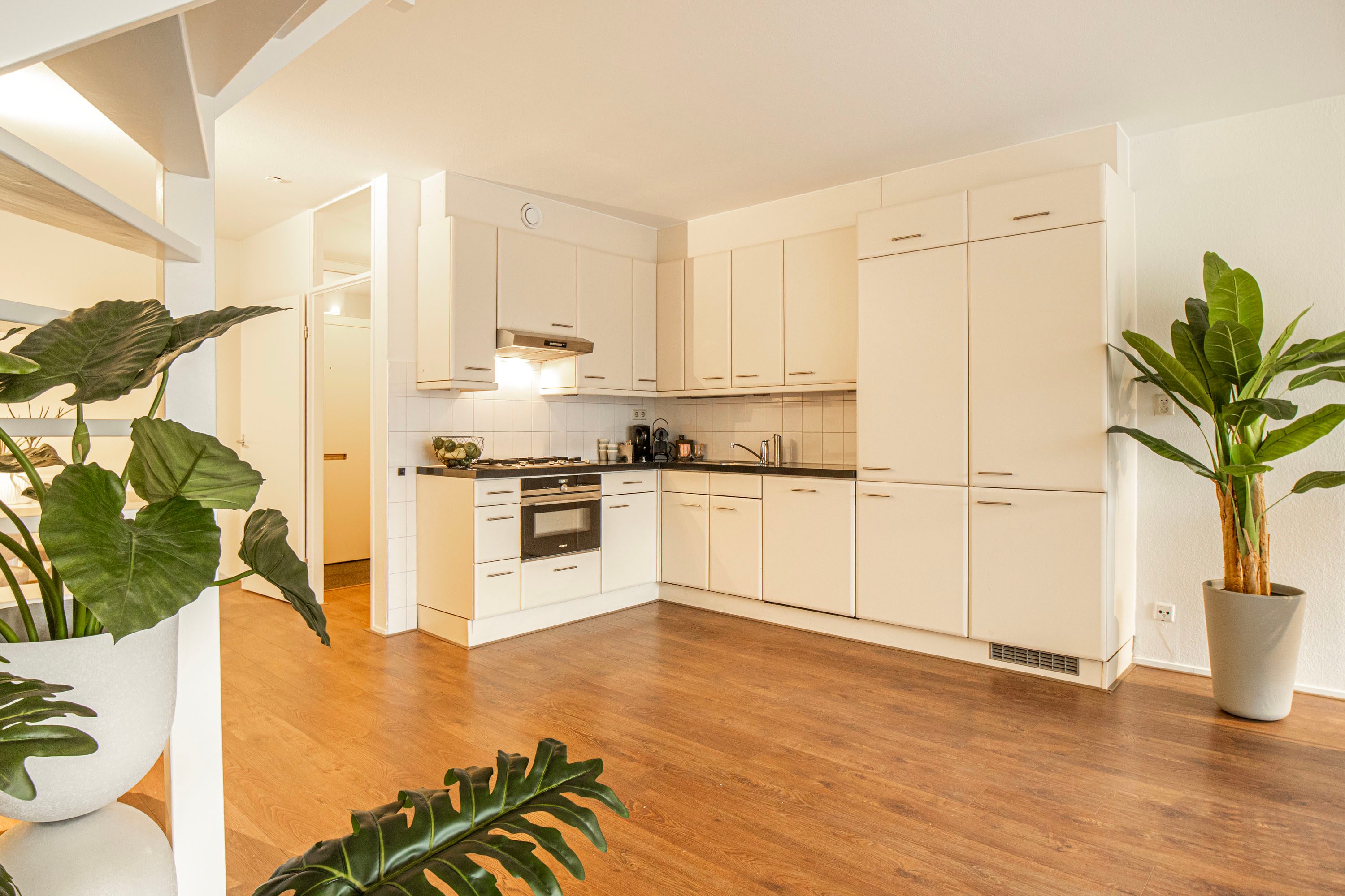 De halfopen keuken ligt centraal tussen de entree en de woonkamer. De keuken is praktisch ingericht en voorzien van een vierpits gasfornuis, afzuigkap, inbouwkoelkast met vriezer, vaatwasser en een combi-oven/magnetron.