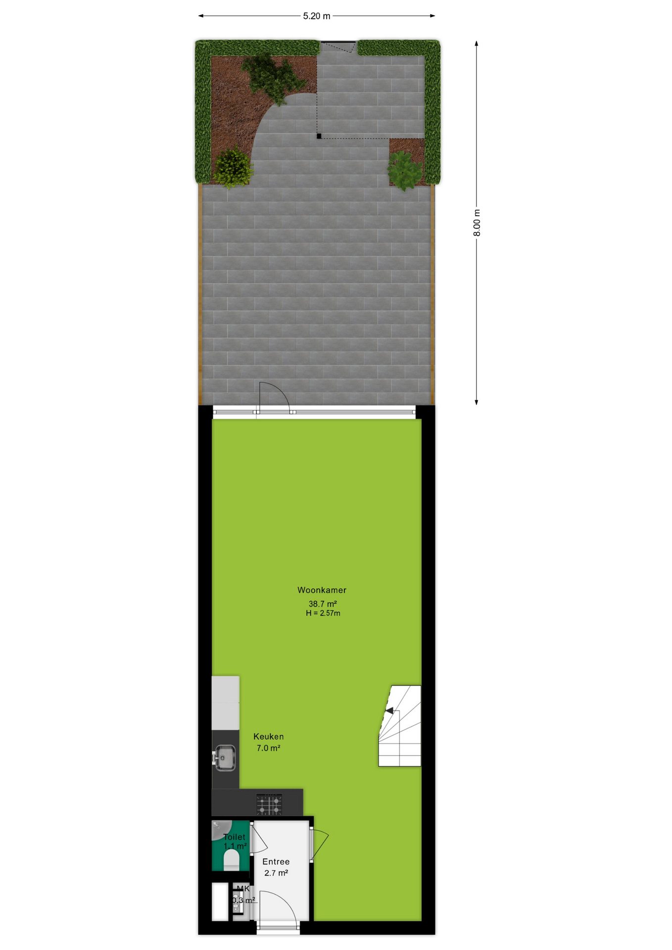 Een van de grootste pluspunten van deze woning is de verrassend ruime tuin van bijna 42 m² — een echte zeldzaamheid bij een appartement! De tuin ligt op het zuidwesten, waardoor je hier het grootste deel van de dag heerlijk van de zon kunt genieten. Momenteel is de tuin volledig betegeld. De ruimte biedt echter volop mogelijkheden om geheel naar eigen smaak in te richten: creëer een groene oase, een onderhoudsvriendelijke patio of een sfeervolle buitenlounge. Dankzij de achterom is de tuin bovendien gemakkelijk bereikbaar en geniet je van extra gemak en privacy.