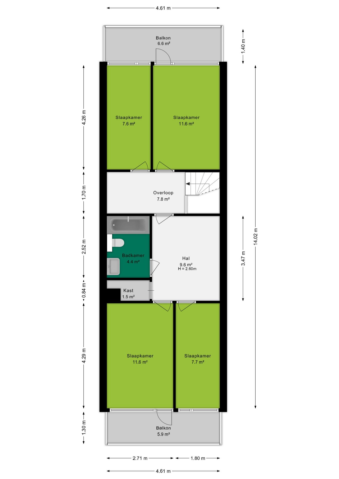 - Twee slaapkamers van ca. 12 m², beide met toegang tot een eigen balkon