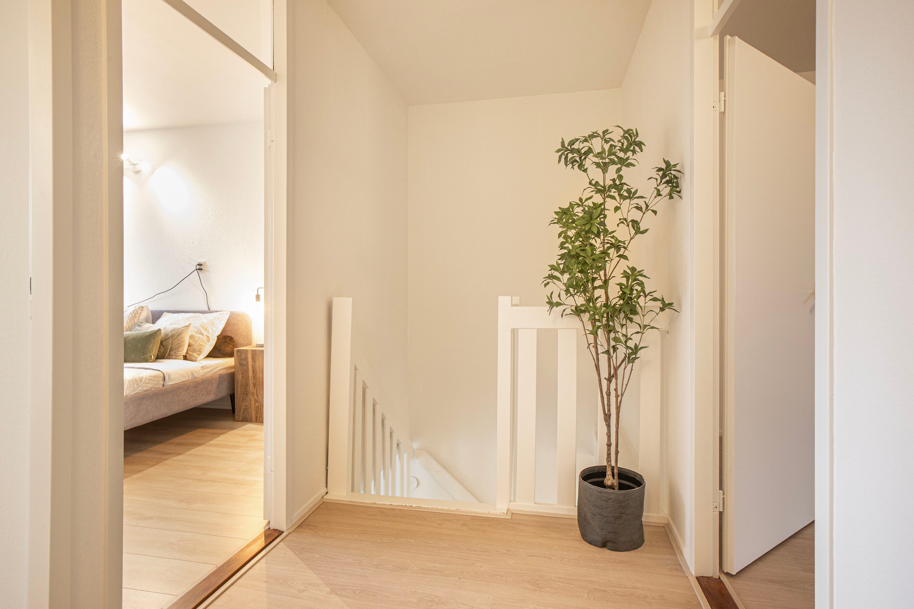 Via de trap in de woonkamer bereik je de slaapverdieping. Hier bevinden zich vier slaapkamers, ideaal voor gezinnen, thuiswerkers of gasten:
