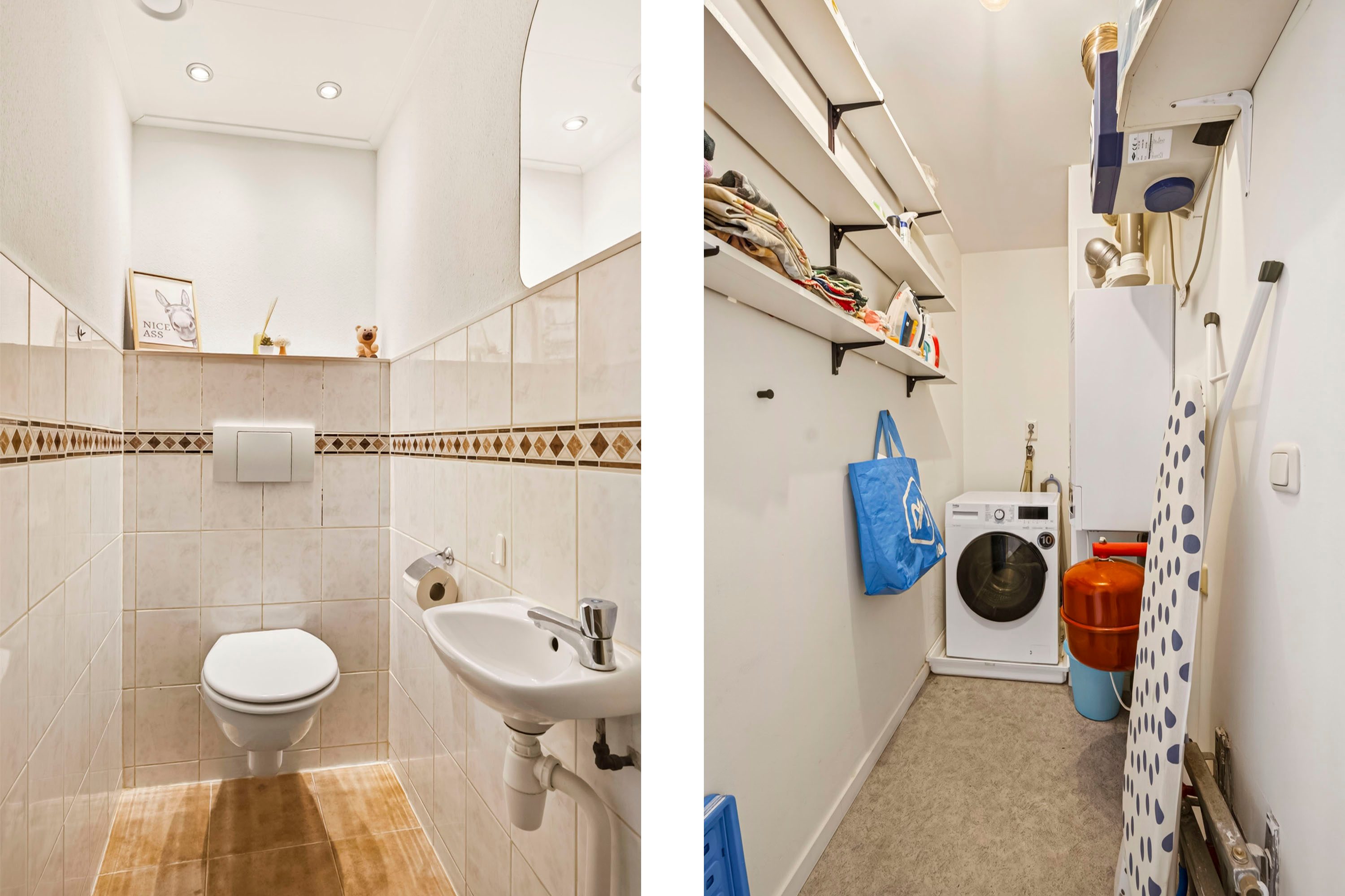Daarnaast is er een inpandige berging met opstelling van de C.V.-ketel (Nefit, 2011), mechanische ventilatie en aansluitingen voor wasmachine en droger. De woonkamer, hal en slaapkamers zijn afgewerkt met een laminaatvloer.