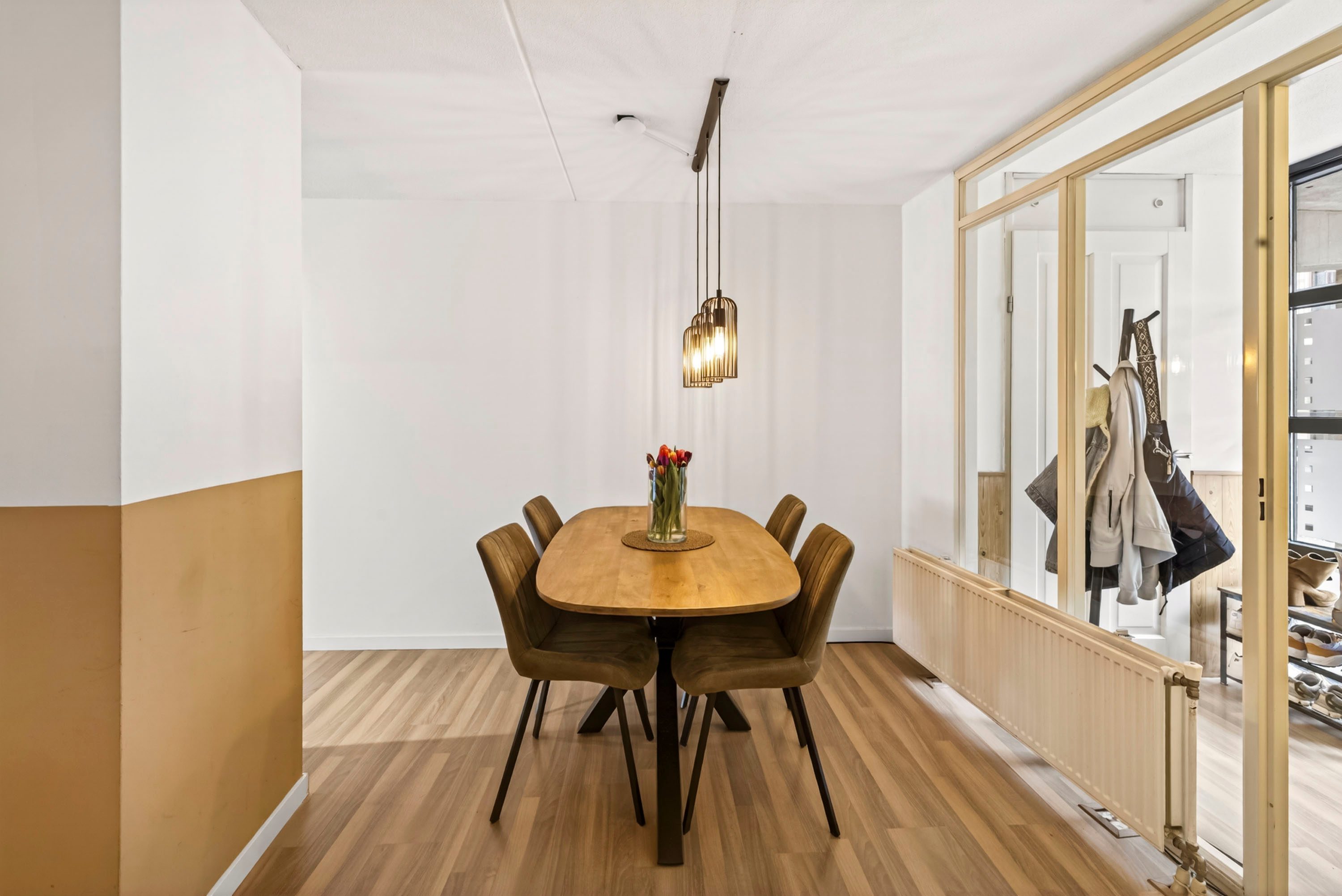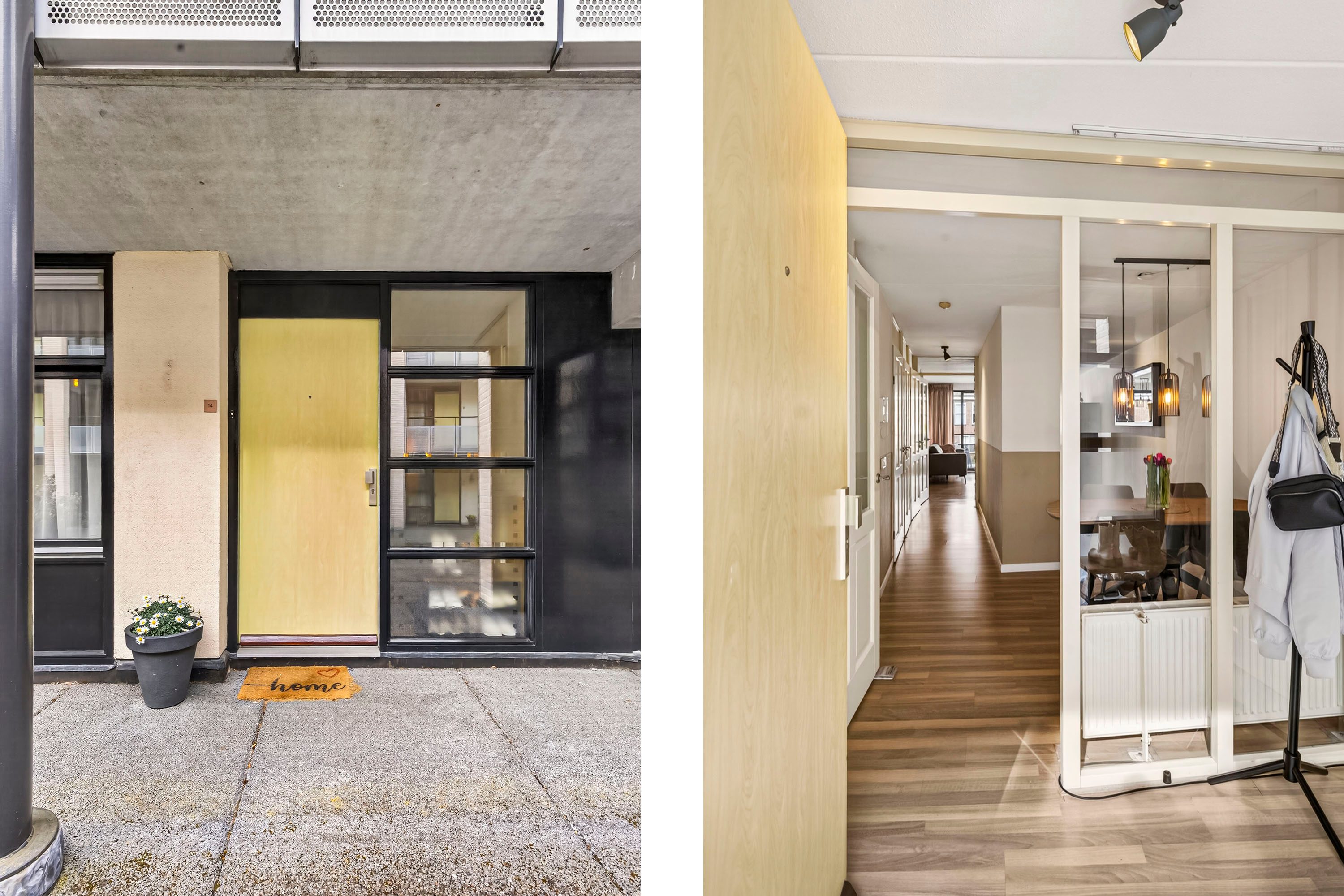 Bij binnenkomst betreed je de hal met meterkast. Via een glazen wand en deur kom je in het eetgedeelte, dat een open verbinding heeft met de woonkamer en een mooi zicht biedt over de hele lengte van de woning. Vanuit de hal zijn de verschillende vertrekken bereikbaar.