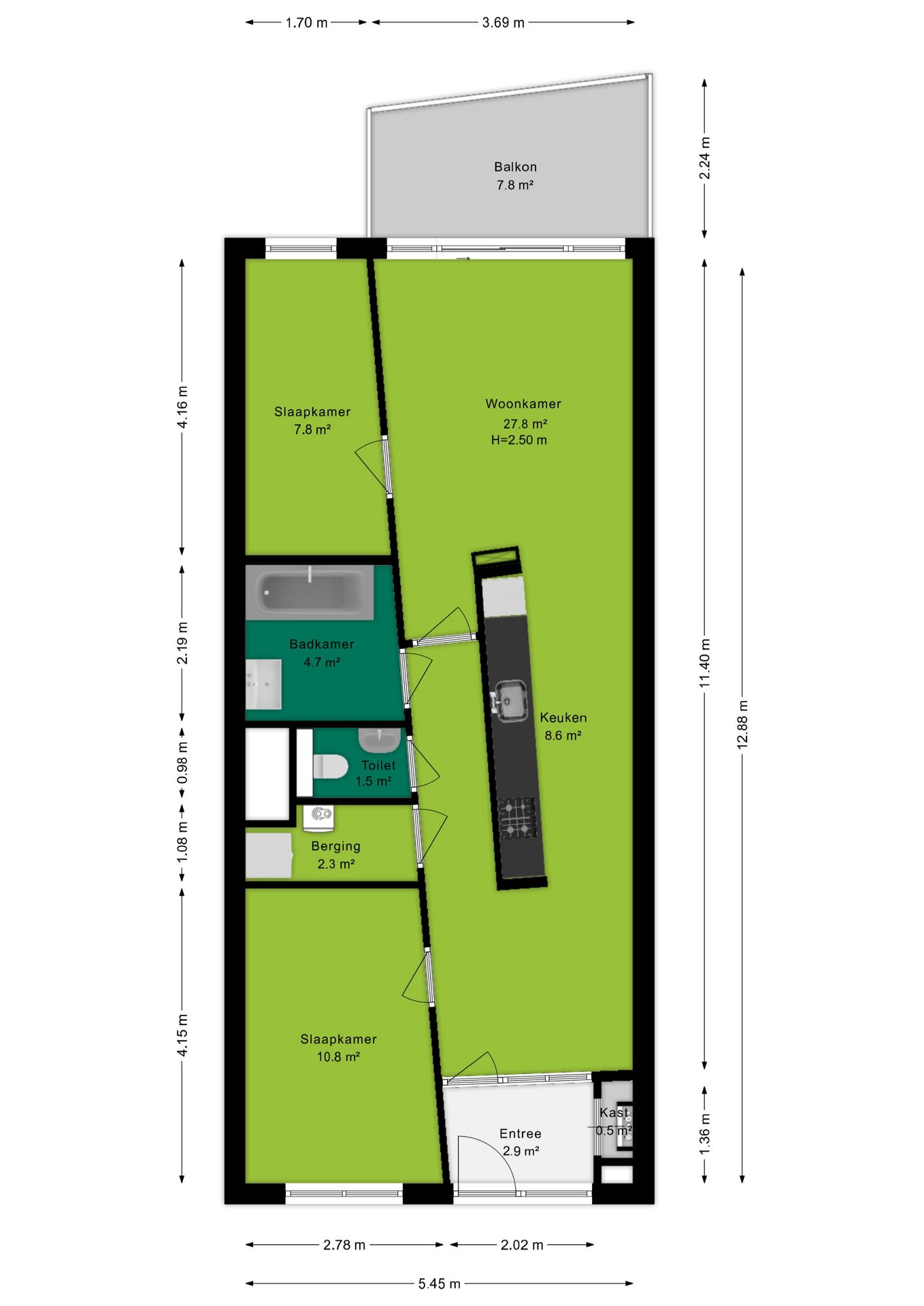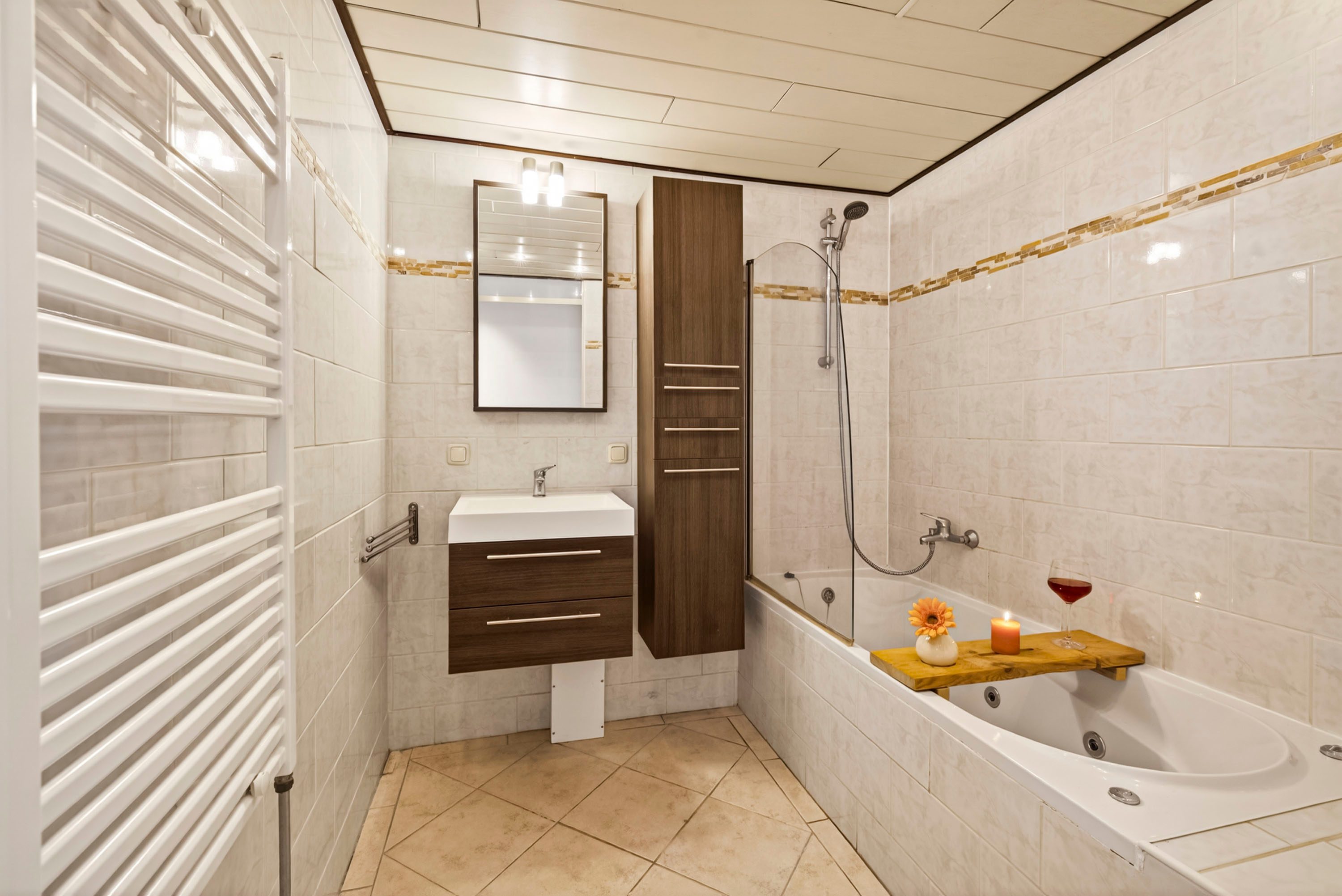 Het appartement telt twee slaapkamers, waarvan een is gelegen aan de galerijzijde. De badkamer beschikt over een ligbad (whirlpool) met douche, een wastafelmeubel en extra opbergruimte. Het separate toilet is uitgevoerd met een hangend toilet en fonteintje.