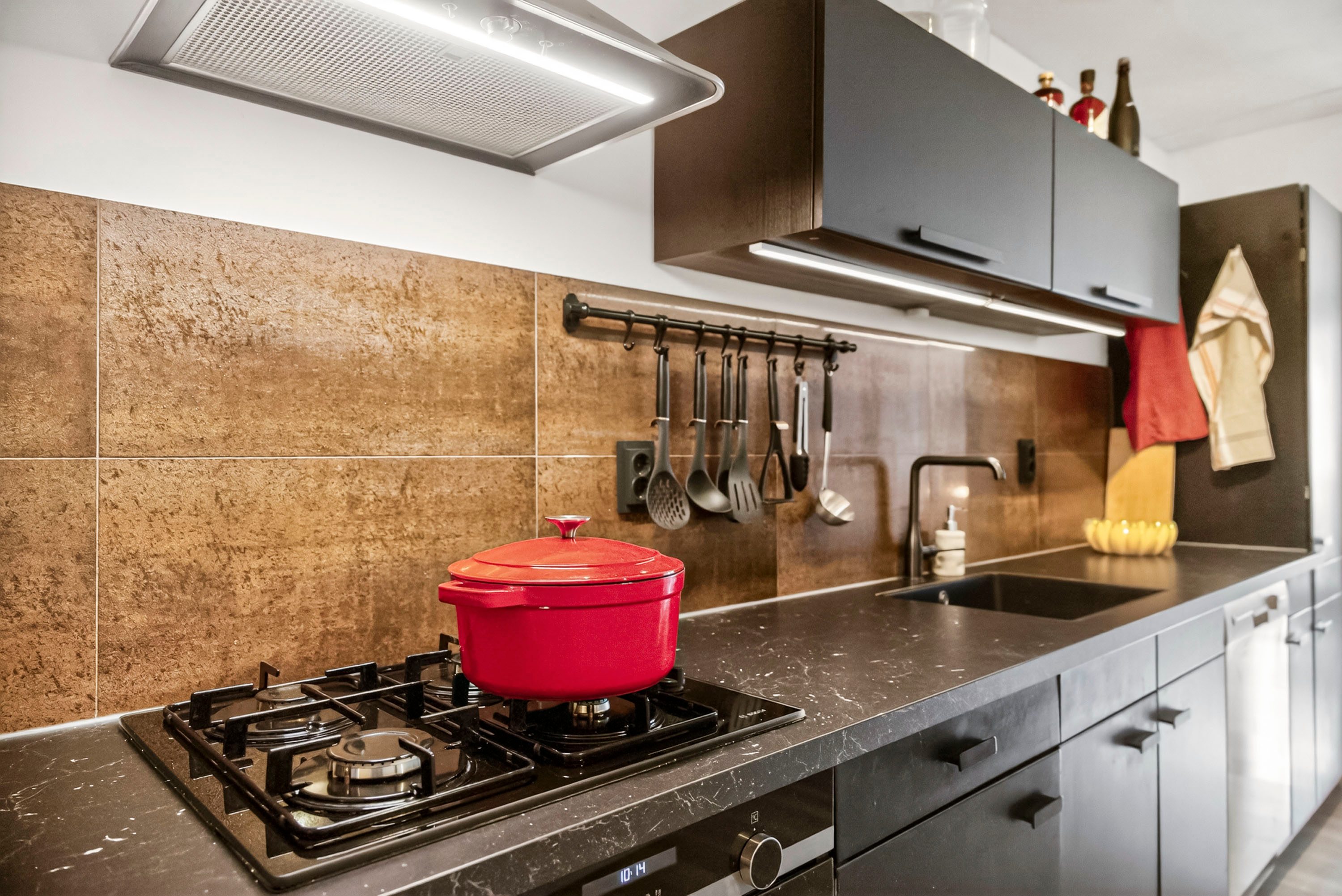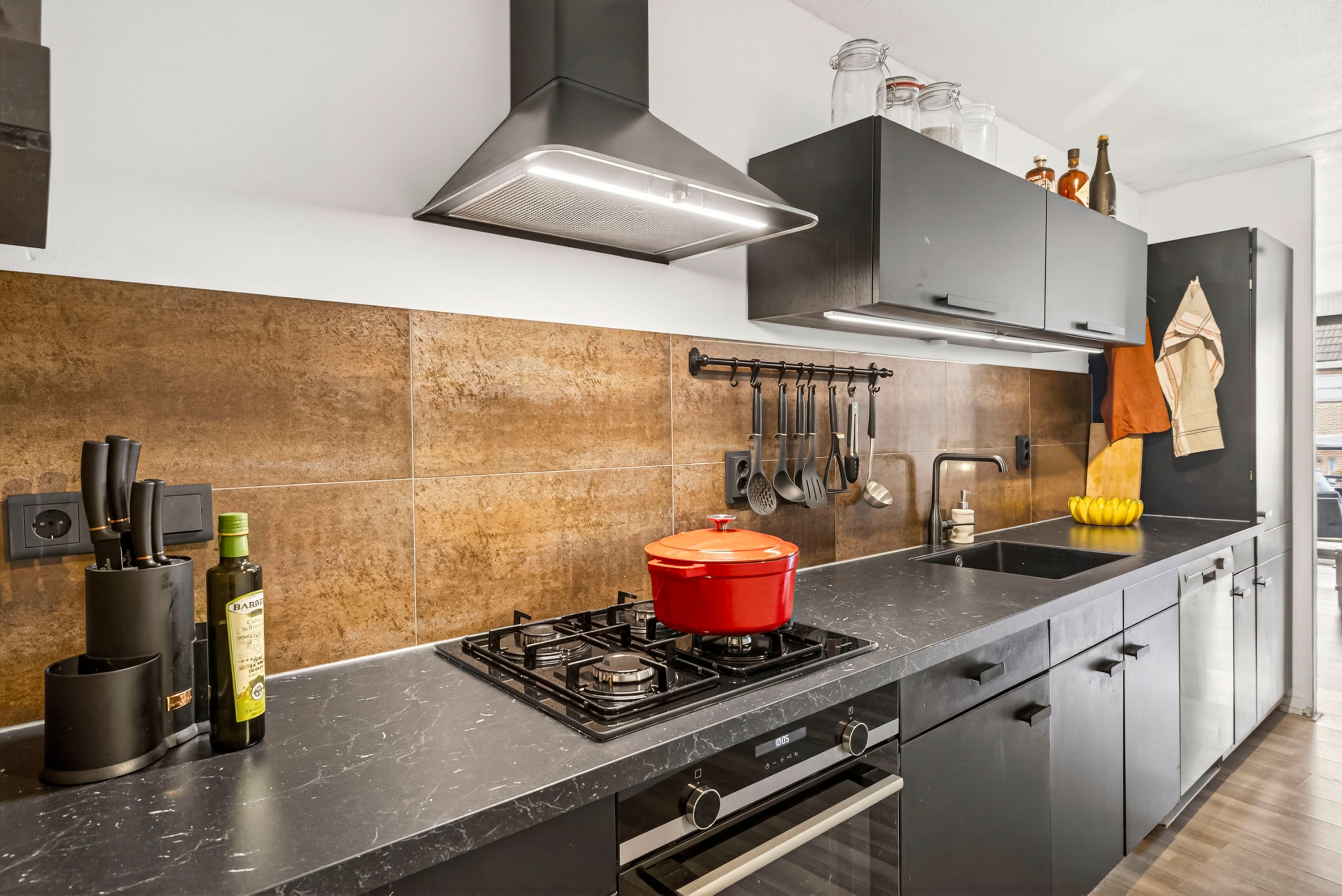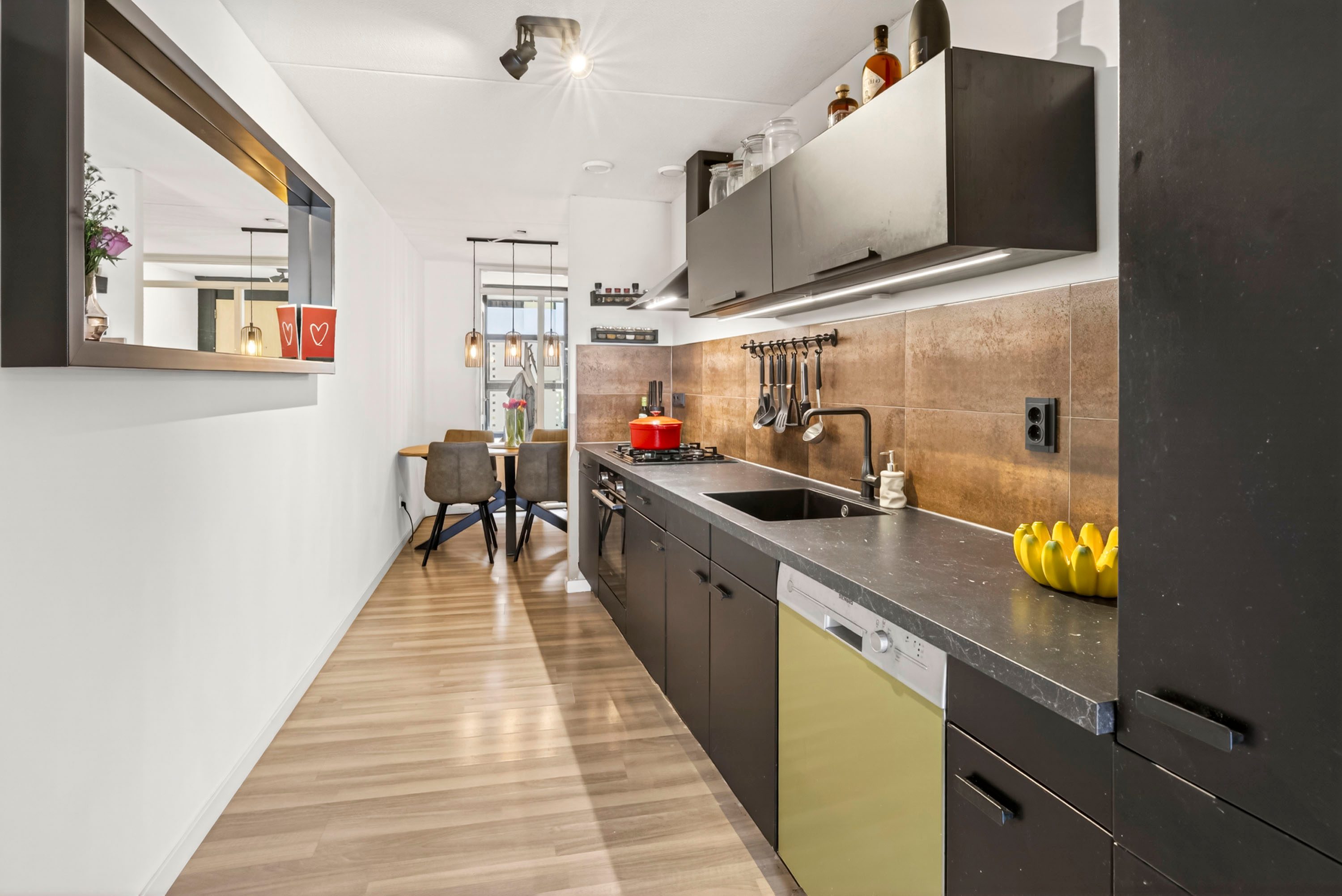 De woonkamer strekt zich uit over de volledige breedte van het appartement en kenmerkt zich door de grote raampartijen die zorgen voor veel daglicht. Via de schuifpui is er directe toegang tot het ruime balkon, waar je geniet van privacy en een prettige ligging met zicht op de woonomgeving. De halfopen keuken is praktisch opgesteld langs één wand en biedt volop kastruimte. Deze is voorzien van: gaskookplaat, afzuigkap, oven, vaatwasser en koelkast.
