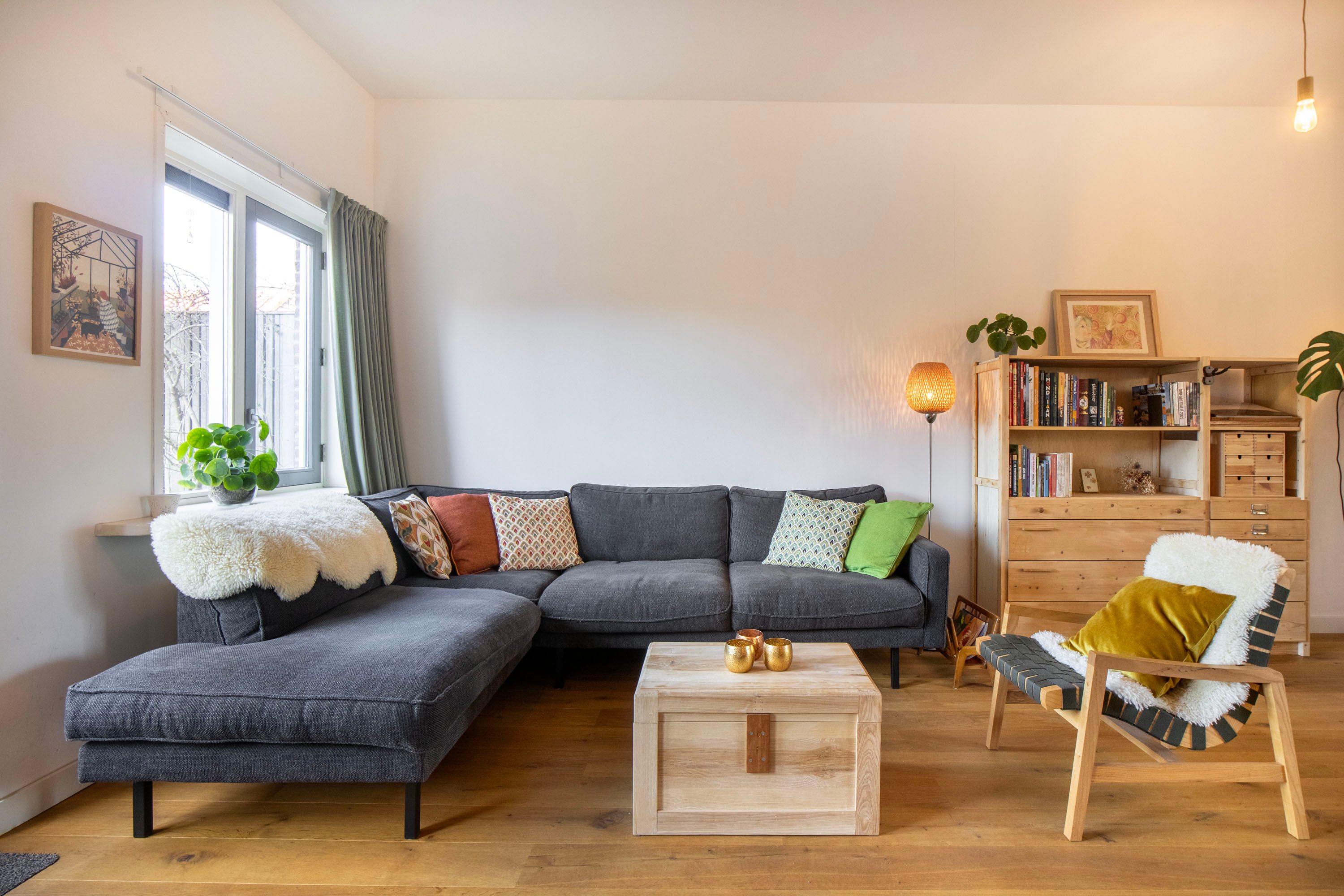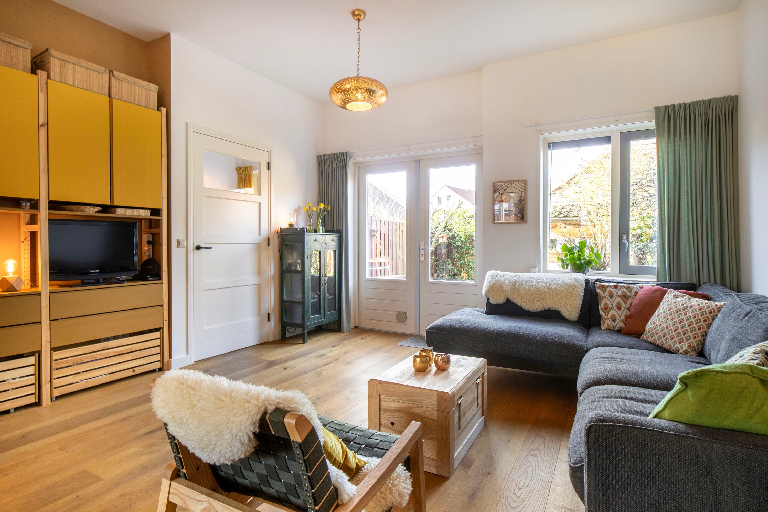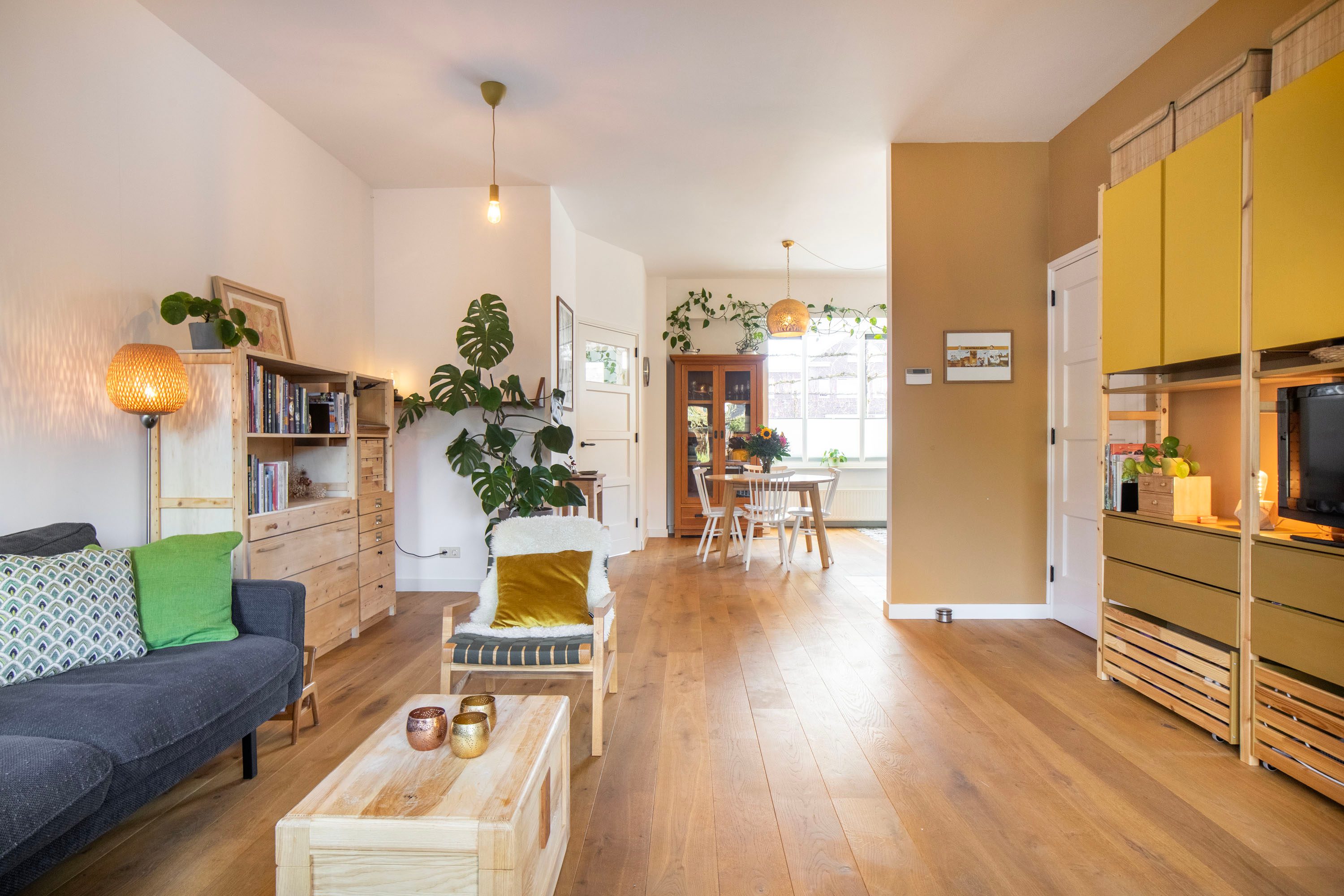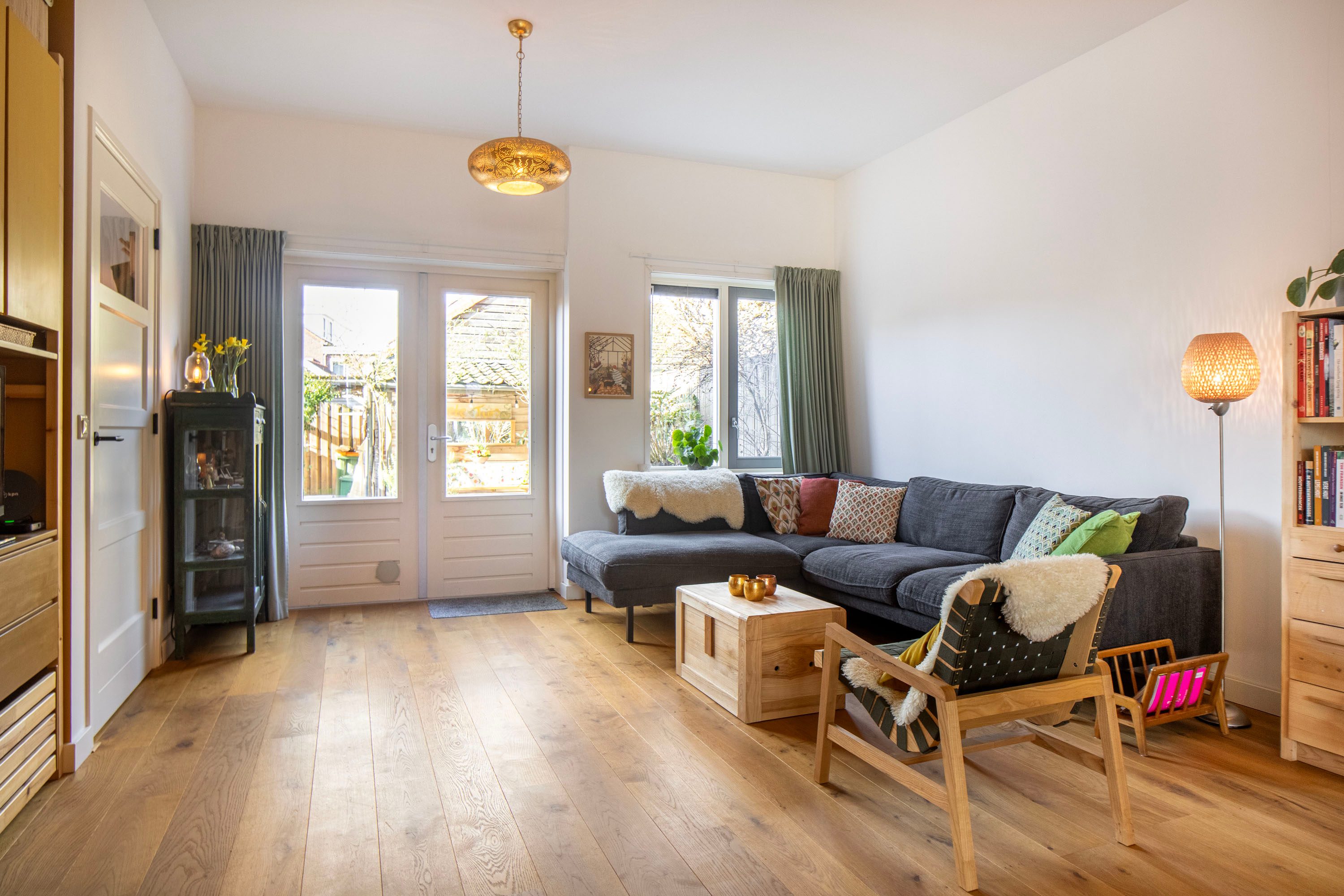 Vanuit hier loop je de leefruimte in voorzien van een eikenhouten vloer. Aan de achterzijde van de woning vind je de ruime woonkamer met openslaande deuren naar de tuin. Dit is een fijne, uitnodigende plek waar je heerlijk op de bank kunt neerploffen.